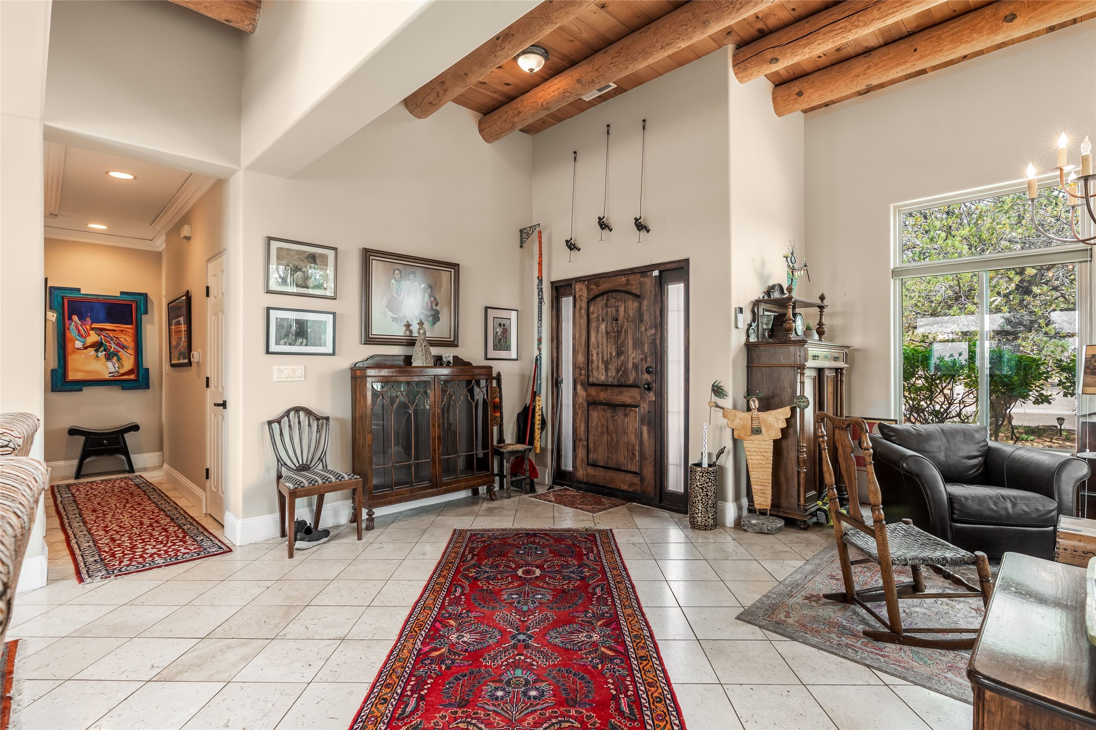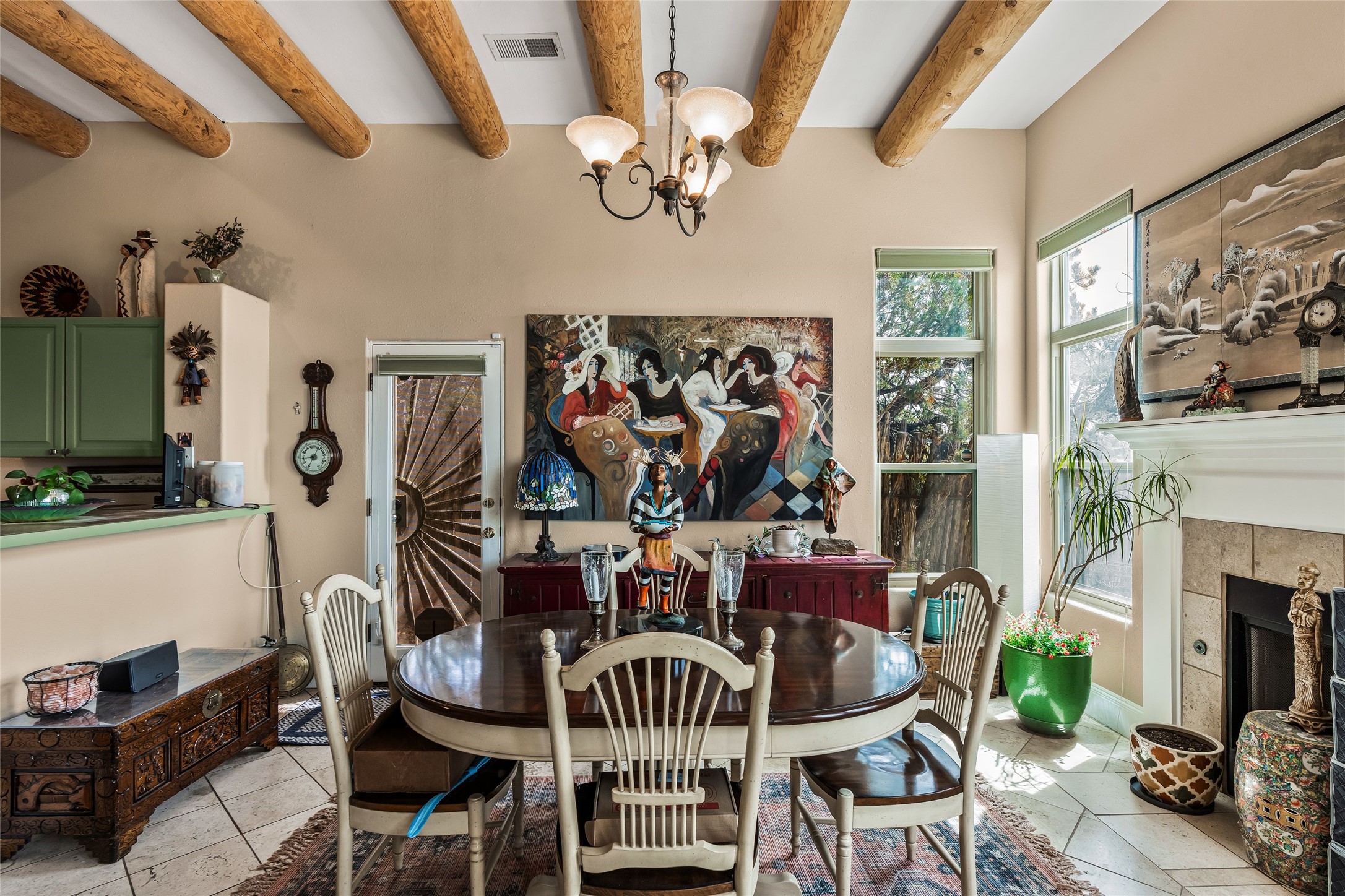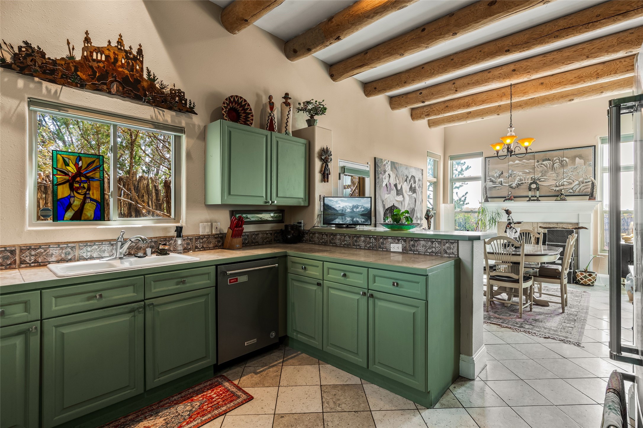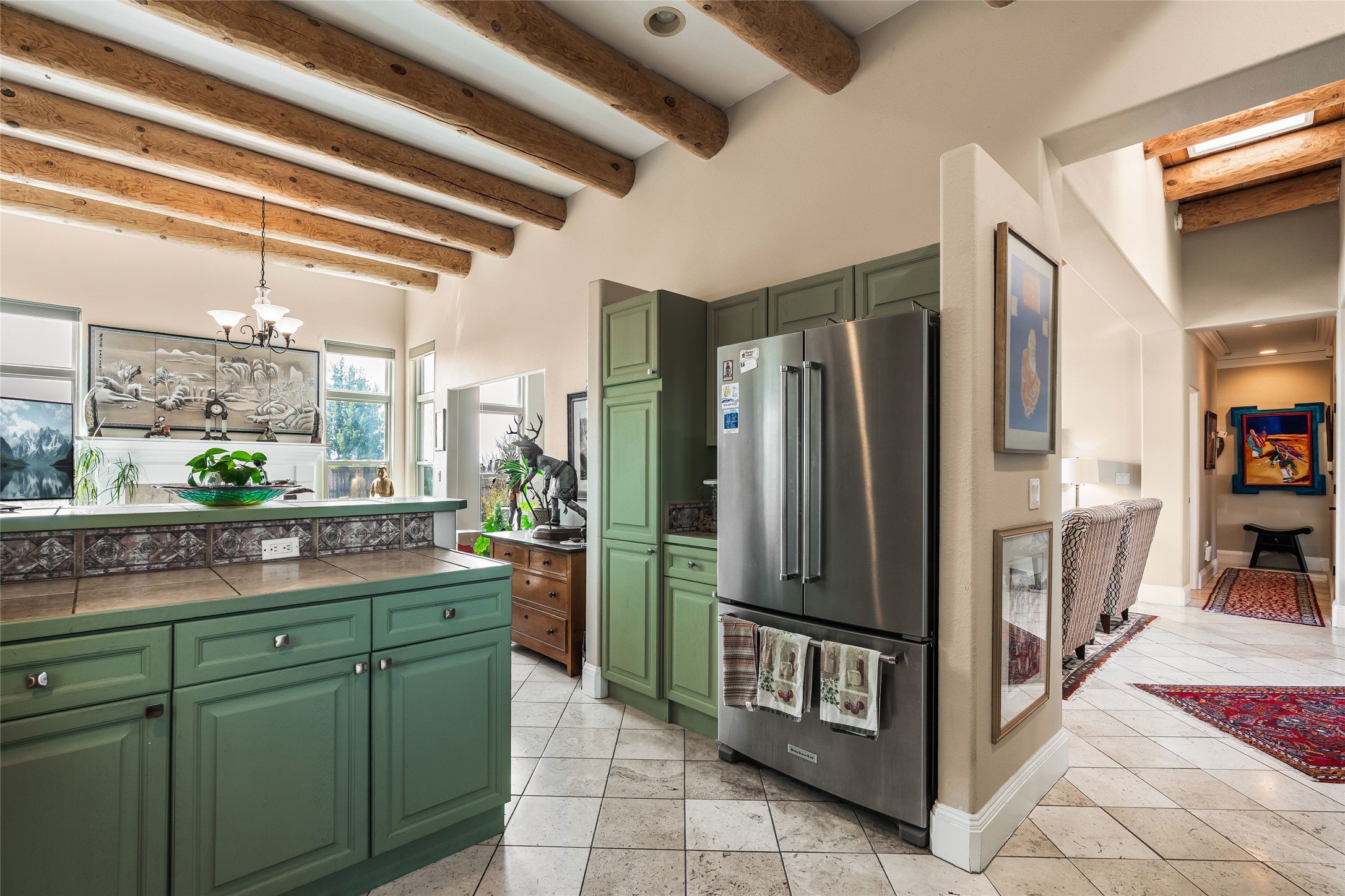 Experience exceptional single level living in the highly sought after Nava Ade community, featuring two private primary suites thoughtfully positioned on opposite sides of the home. A versatile third bedroom or office sits between them, offering flexibility for work, guests, or creative space. Step inside to soaring ceilings accented with classic vigas, elegant travertine floors, and generous open concept living spaces designed for comfort and effortless entertaining. The chef's kitchen is equipped with newer stainless steel KitchenAid appliances, while newly installed windows bathe the home in natural light throughout the day. Two gas fireplaces--one in the dining room and one in the living room--create warm, inviting spaces year round. Recent upgrades, including a new HVAC system, ensure modern comfort and efficiency. Outside, enjoy beautifully landscaped front and back yards, perfect for relaxing or hosting gatherings. The property sits at the end of a quiet lane, adjoining common area open space with direct access to Nava Ade's walking paths. A detached two car garage and a spacious private driveway provide ample parking for residents and guests. Residents of Nava Ade enjoy access to a community fitness center, swimming pool, parks, and miles of walking paths, making this home a true blend of convenience, comfort, and lifestyle. This is a move in ready gem in one of Santa Fe's most desirable neighborhoods.