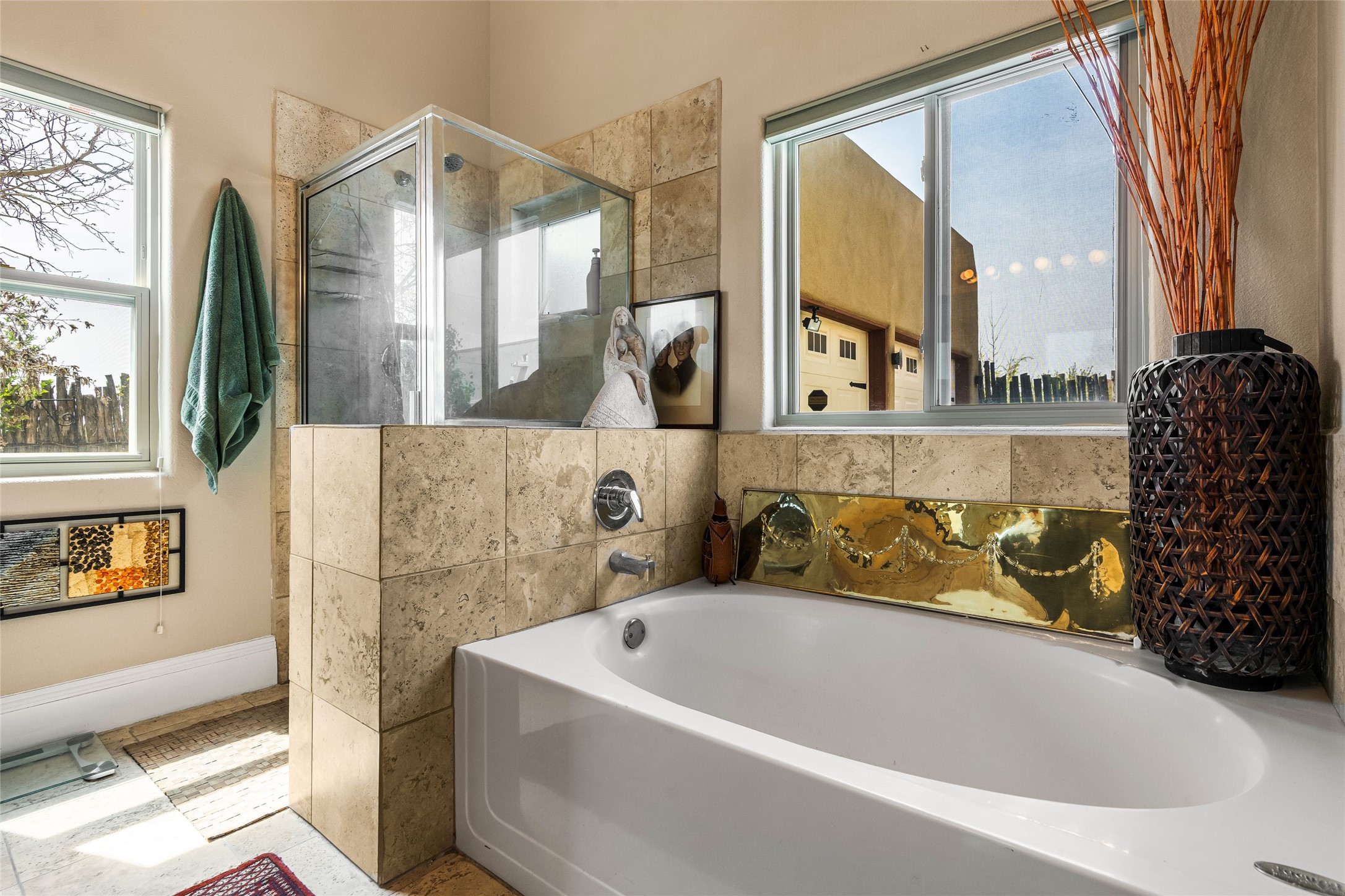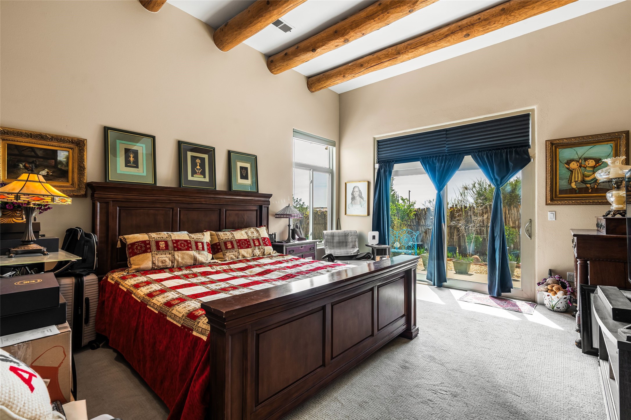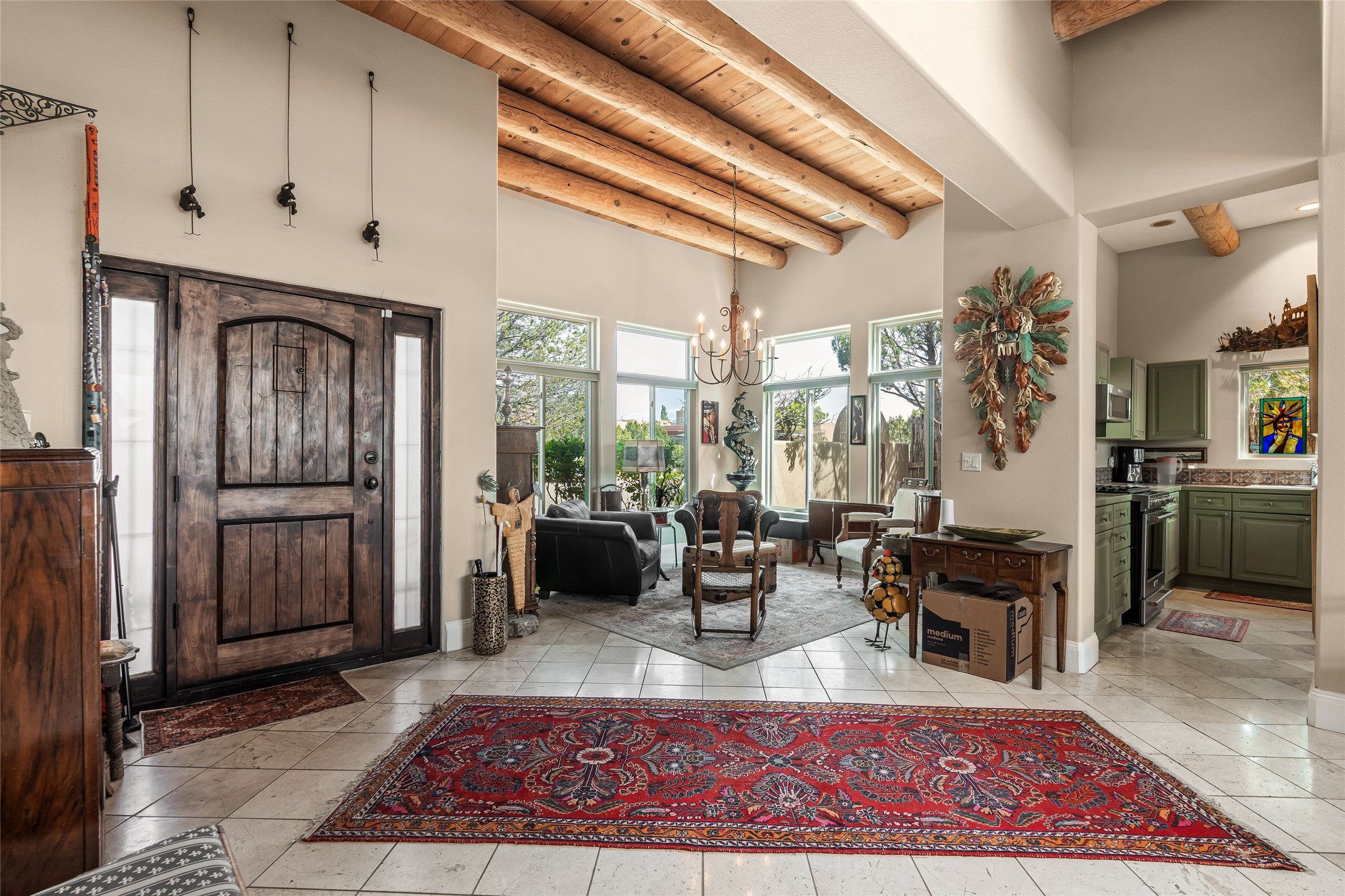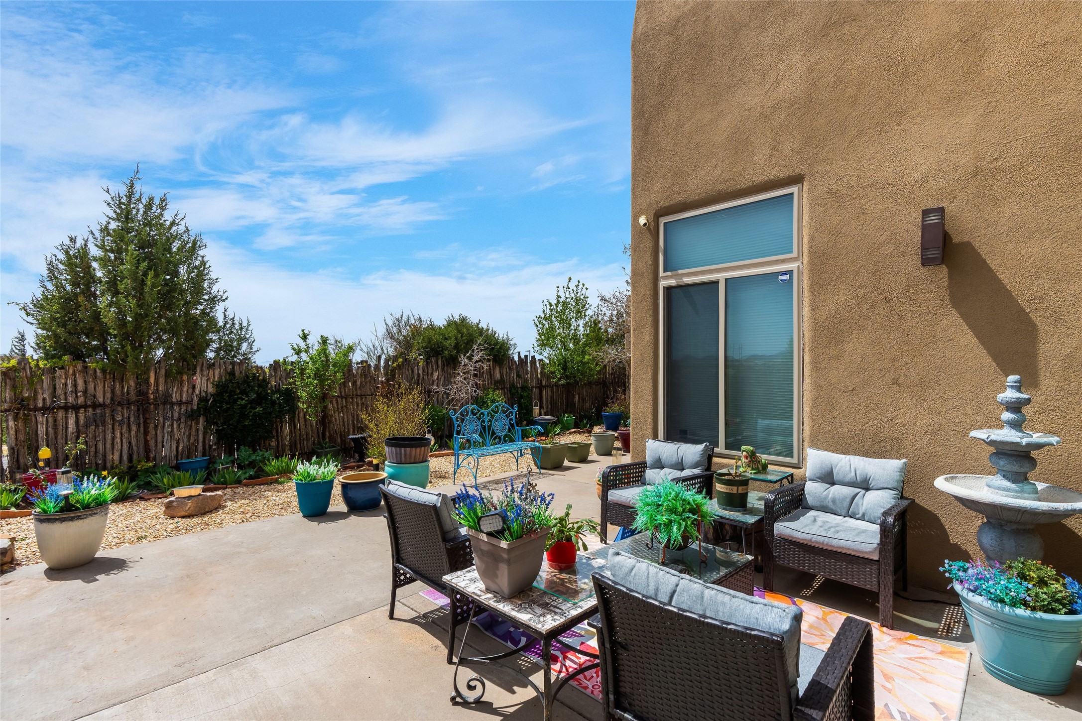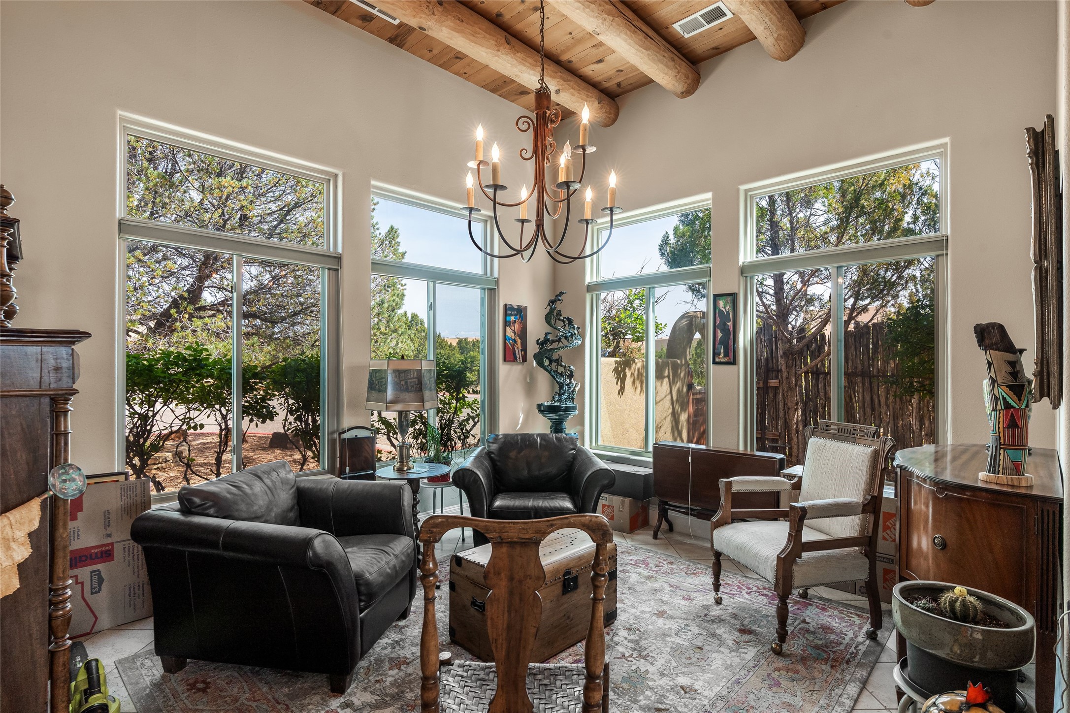 Experience exceptional single level living in the highly sought after Nava Ade community, featuring two private primary suites thoughtfully positioned on opposite sides of the home. A versatile third bedroom or office sits between them, offering flexibility for work, guests, or creative space. Step inside to soaring ceilings accented with classic vigas, elegant travertine floors, and generous open concept living spaces designed for comfort and effortless entertaining. The chef's kitchen is equipped with newer stainless steel KitchenAid appliances, while newly installed windows bathe the home in natural light throughout the day. Two gas fireplaces--one in the dining room and one in the living room--create warm, inviting spaces year round. Recent upgrades, including a new HVAC system, ensure modern comfort and efficiency. Outside, enjoy beautifully landscaped front and back yards, perfect for relaxing or hosting gatherings. The property sits at the end of a quiet lane, adjoining common area open space with direct access to Nava Ade's walking paths. A detached two car garage and a spacious private driveway provide ample parking for residents and guests. Residents of Nava Ade enjoy access to a community fitness center, swimming pool, parks, and miles of walking paths, making this home a true blend of convenience, comfort, and lifestyle. This is a move in ready gem in one of Santa Fe's most desirable neighborhoods.
