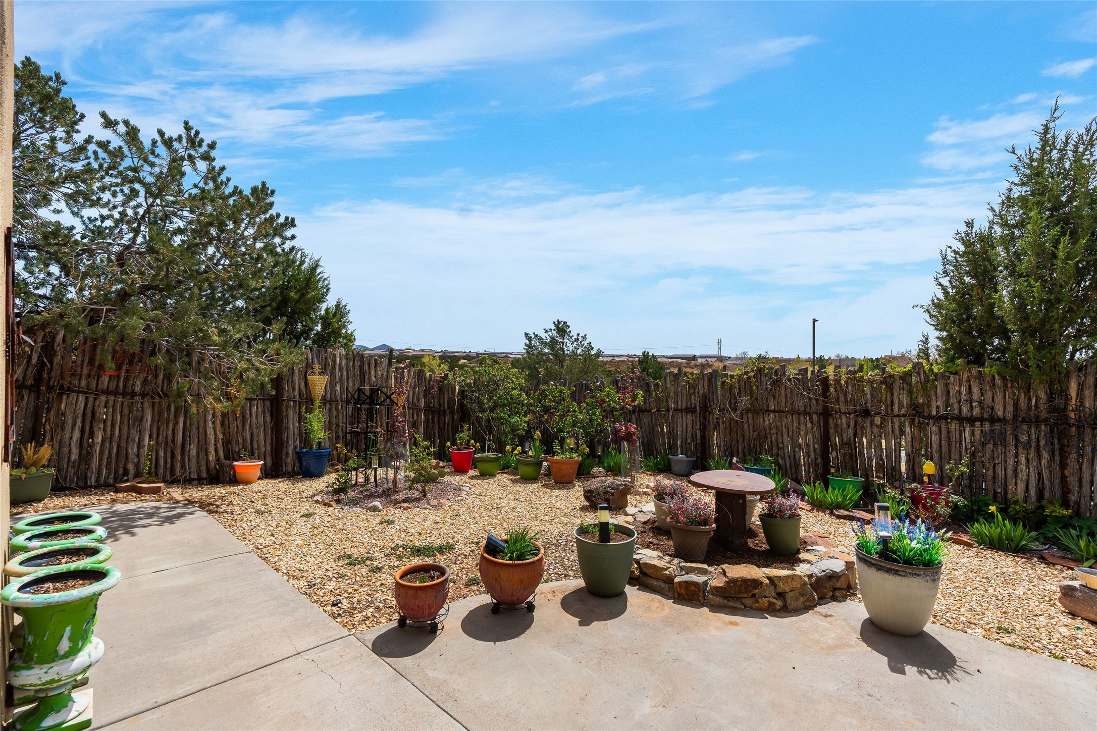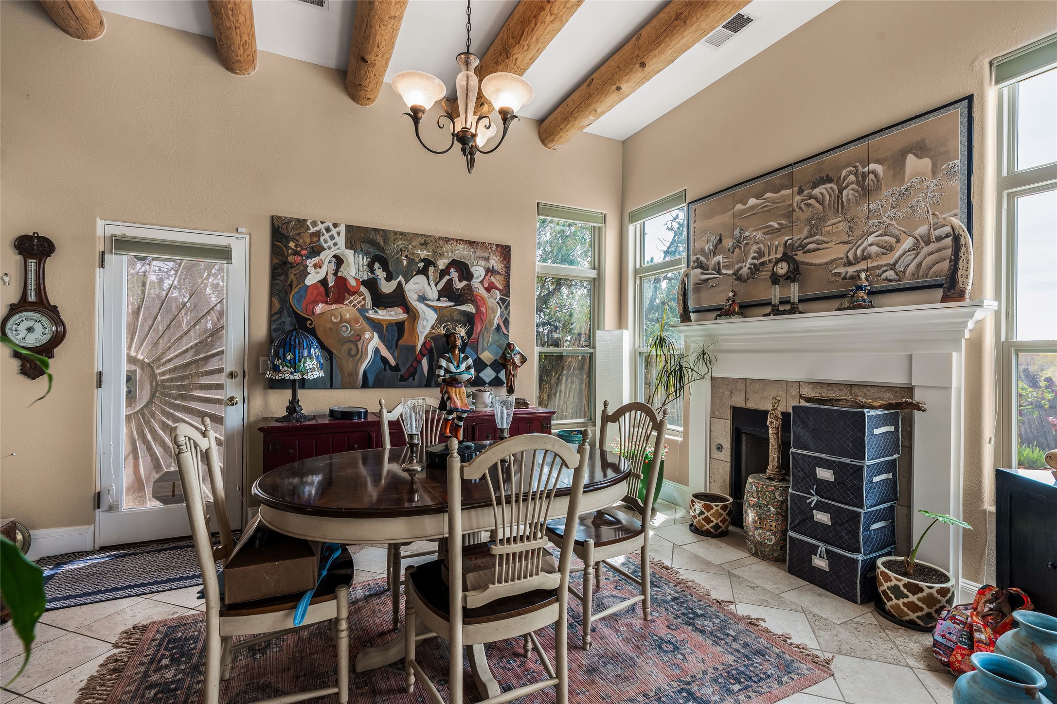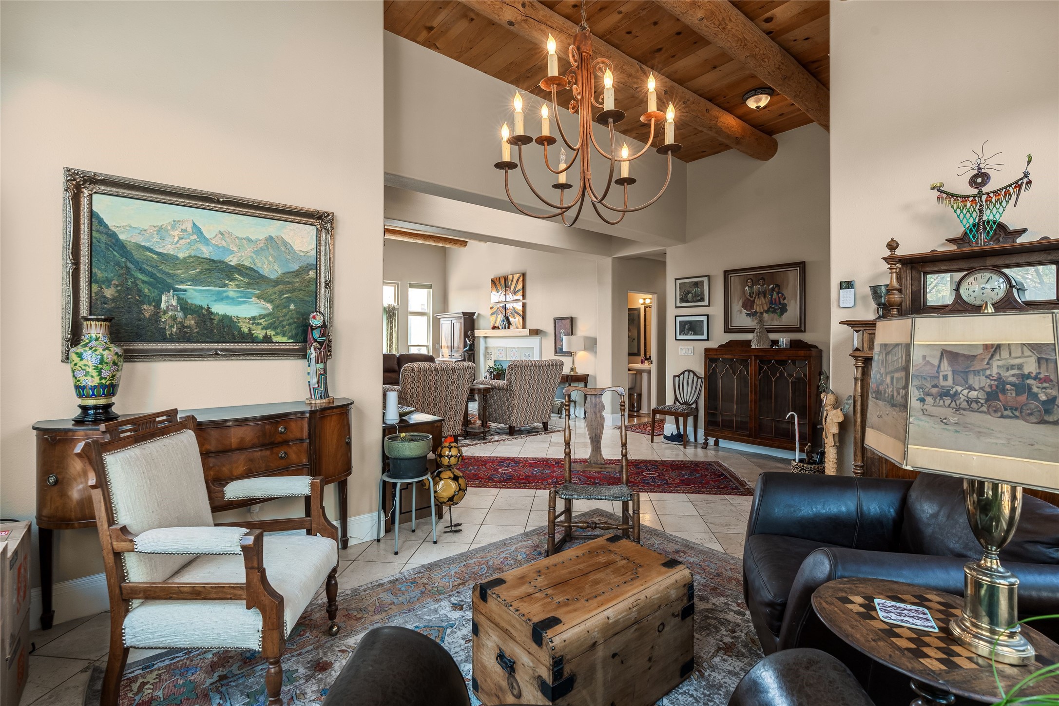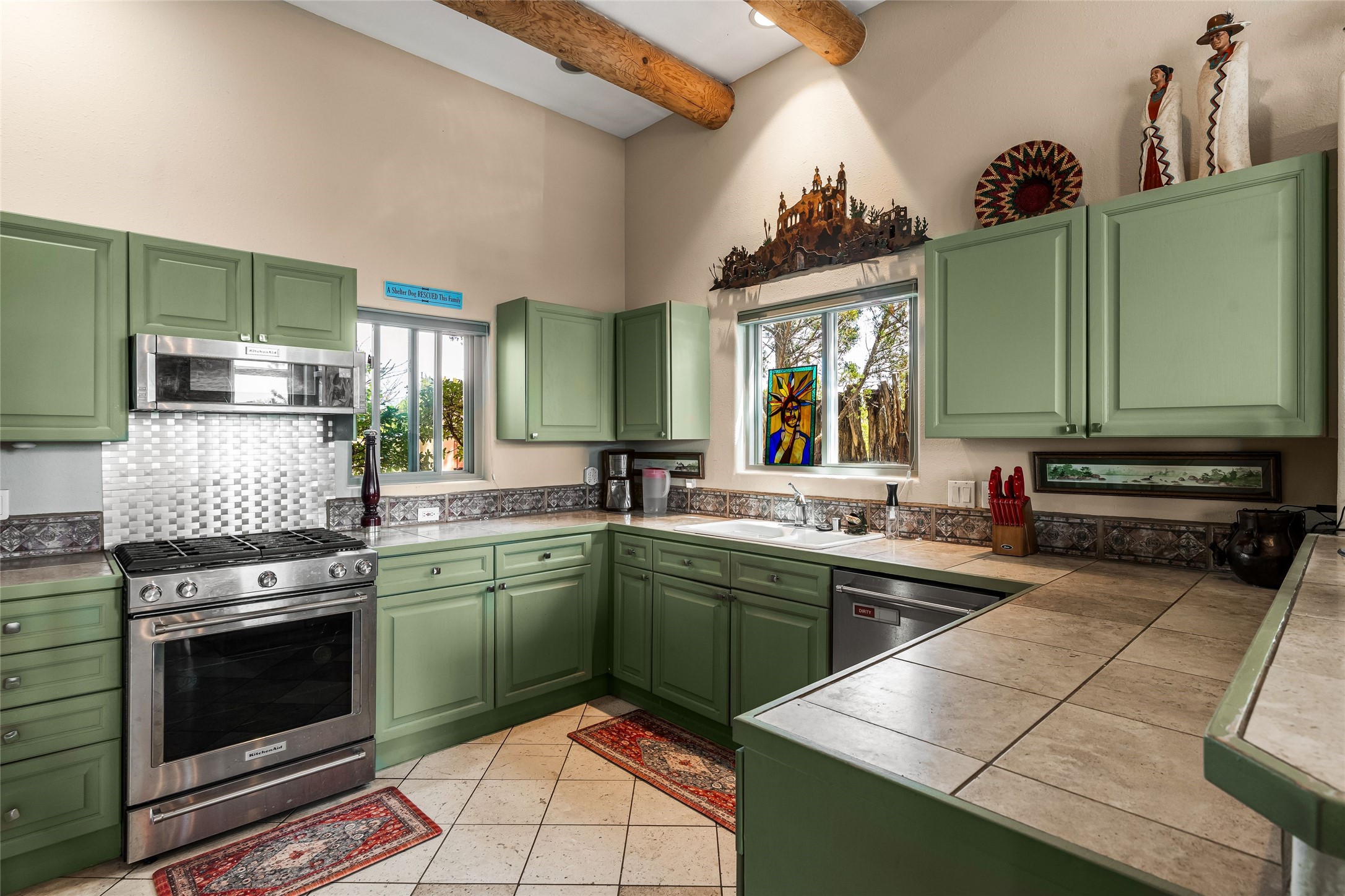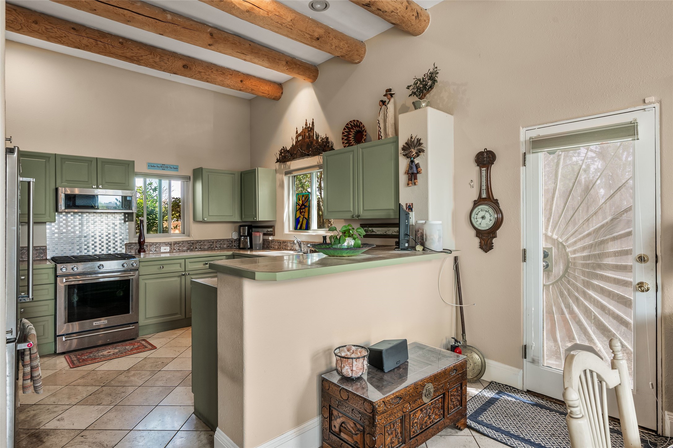 Experience exceptional single level living in the highly sought after Nava Ade community, featuring two private primary suites thoughtfully positioned on opposite sides of the home. A versatile third bedroom or office sits between them, offering flexibility for work, guests, or creative space. Step inside to soaring ceilings accented with classic vigas, elegant travertine floors, and generous open concept living spaces designed for comfort and effortless entertaining. The chef's kitchen is equipped with newer stainless steel KitchenAid appliances, while newly installed windows bathe the home in natural light throughout the day. Two gas fireplaces--one in the dining room and one in the living room--create warm, inviting spaces year round. Recent upgrades, including a new HVAC system, ensure modern comfort and efficiency. Outside, enjoy beautifully landscaped front and back yards, perfect for relaxing or hosting gatherings. The property sits at the end of a quiet lane, adjoining common area open space with direct access to Nava Ade's walking paths. A detached two car garage and a spacious private driveway provide ample parking for residents and guests. Residents of Nava Ade enjoy access to a community fitness center, swimming pool, parks, and miles of walking paths, making this home a true blend of convenience, comfort, and lifestyle. This is a move in ready gem in one of Santa Fe's most desirable neighborhoods.