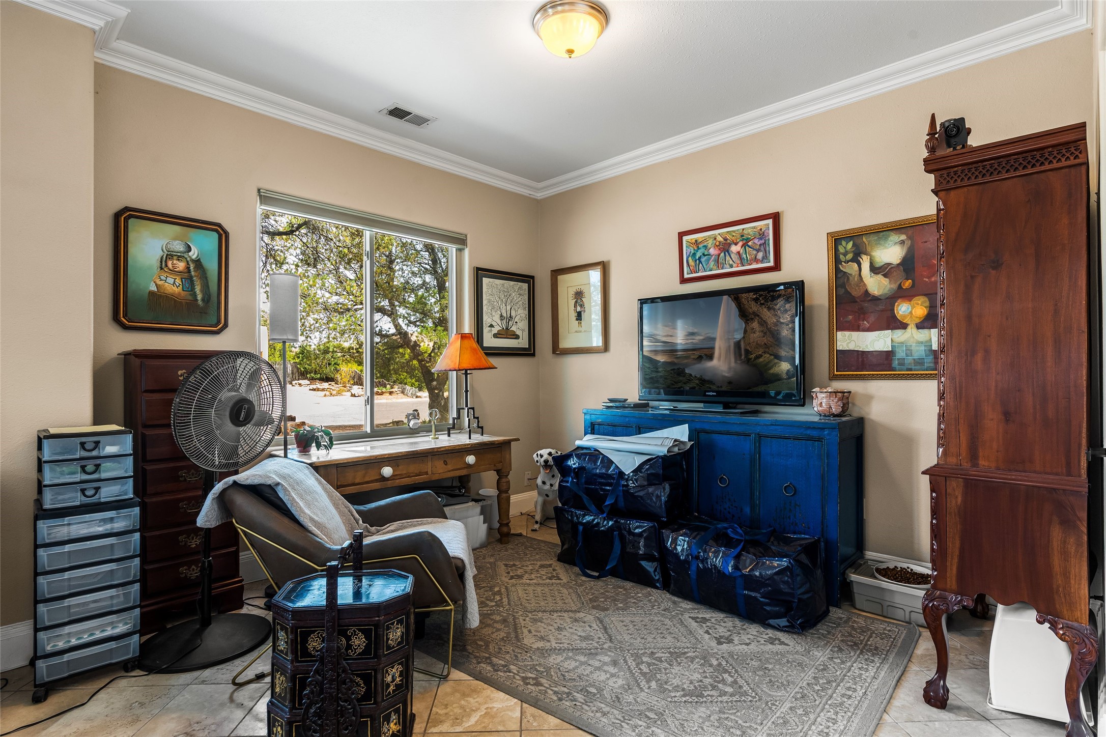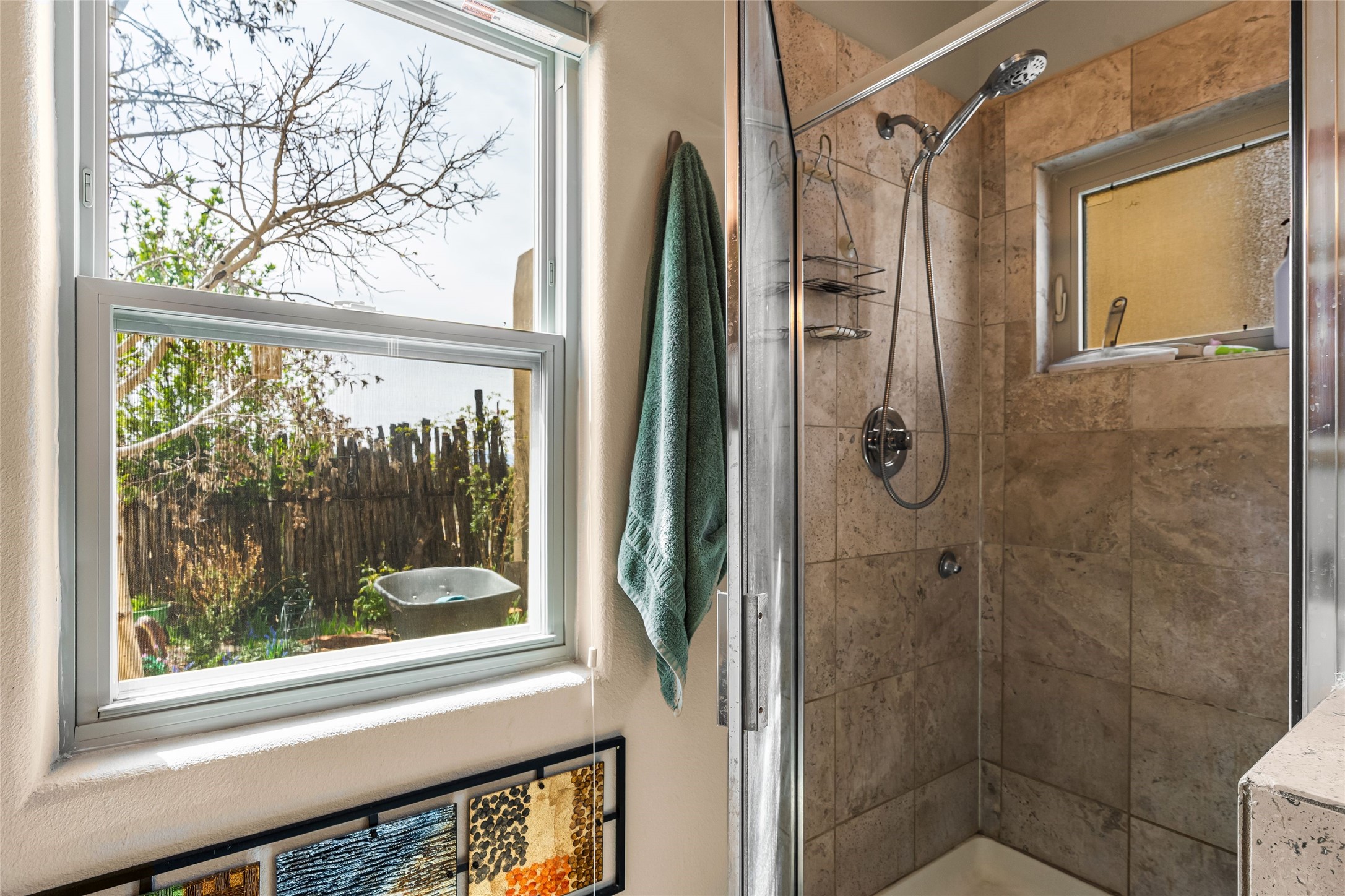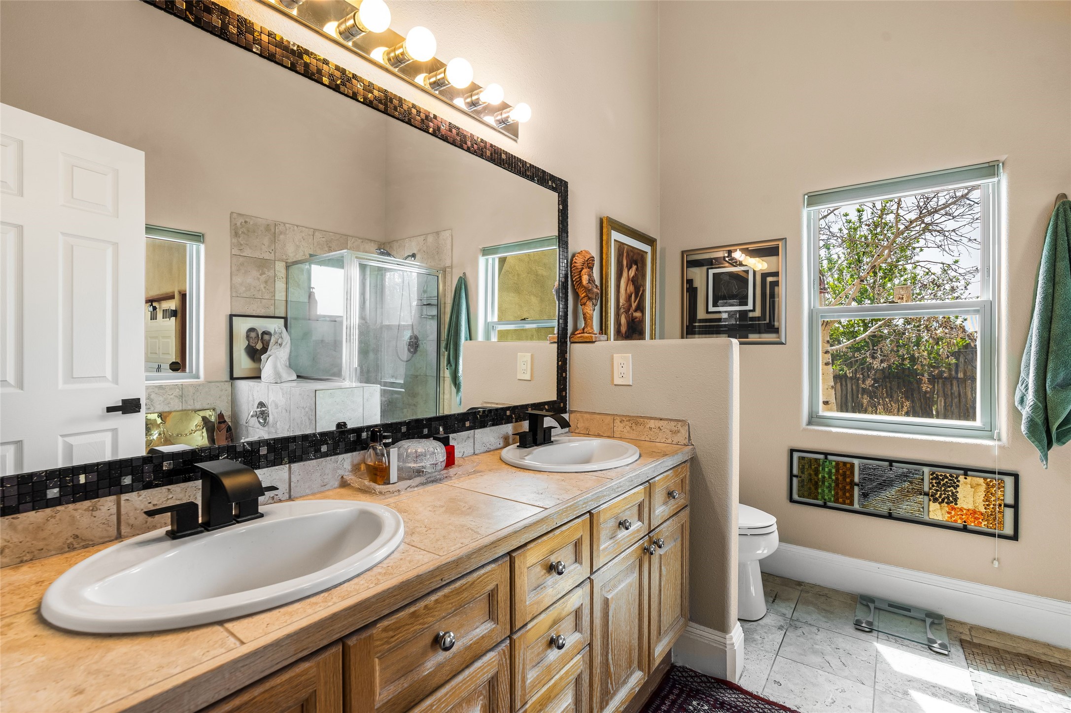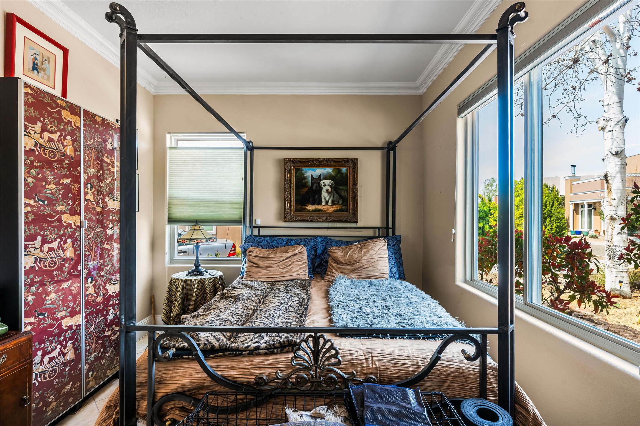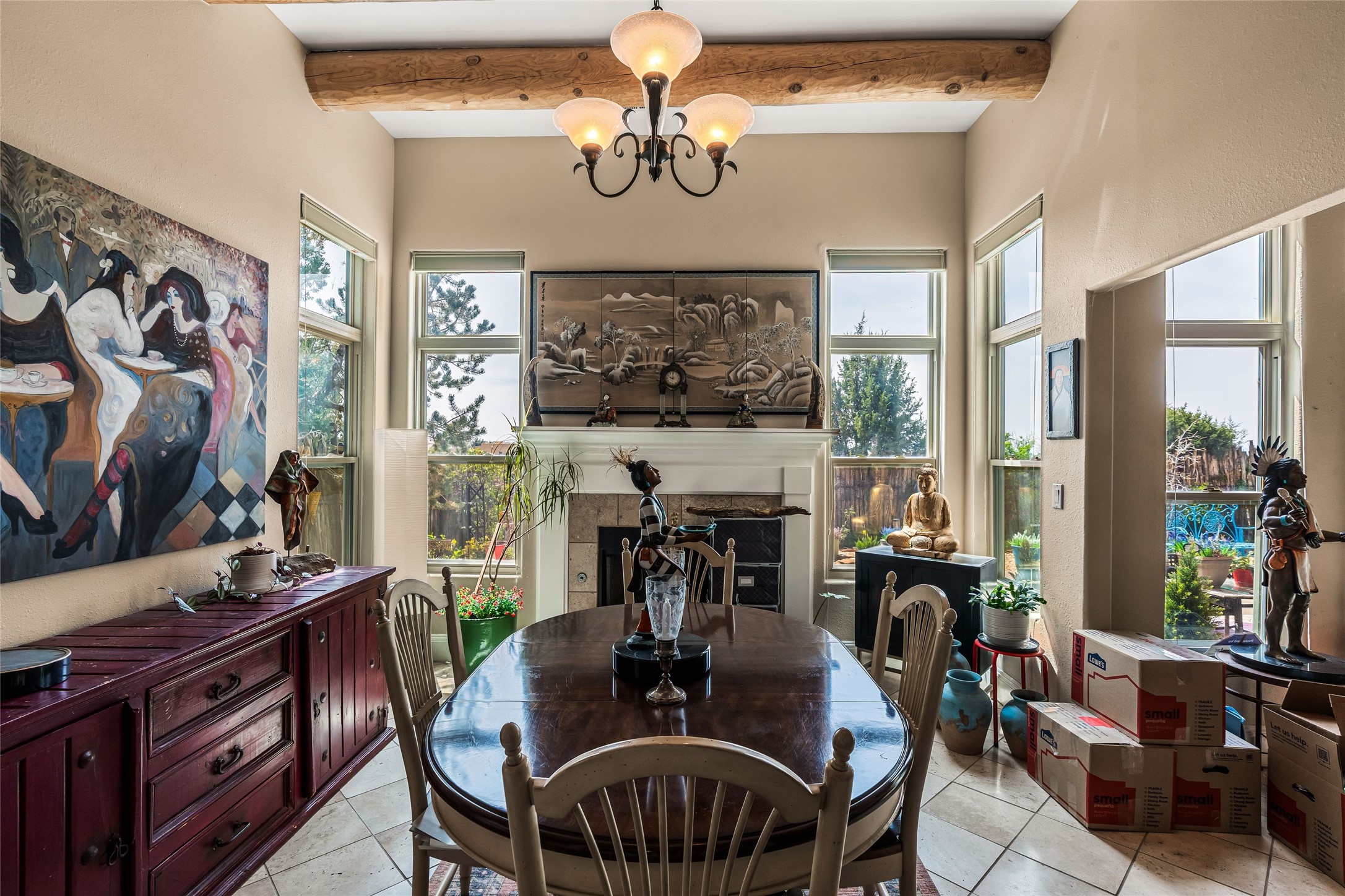 Experience exceptional single level living in the highly sought after Nava Ade community, featuring two private primary suites thoughtfully positioned on opposite sides of the home. A versatile third bedroom or office sits between them, offering flexibility for work, guests, or creative space. Step inside to soaring ceilings accented with classic vigas, elegant travertine floors, and generous open concept living spaces designed for comfort and effortless entertaining. The chef's kitchen is equipped with newer stainless steel KitchenAid appliances, while newly installed windows bathe the home in natural light throughout the day. Two gas fireplaces--one in the dining room and one in the living room--create warm, inviting spaces year round. Recent upgrades, including a new HVAC system, ensure modern comfort and efficiency. Outside, enjoy beautifully landscaped front and back yards, perfect for relaxing or hosting gatherings. The property sits at the end of a quiet lane, adjoining common area open space with direct access to Nava Ade's walking paths. A detached two car garage and a spacious private driveway provide ample parking for residents and guests. Residents of Nava Ade enjoy access to a community fitness center, swimming pool, parks, and miles of walking paths, making this home a true blend of convenience, comfort, and lifestyle. This is a move in ready gem in one of Santa Fe's most desirable neighborhoods.