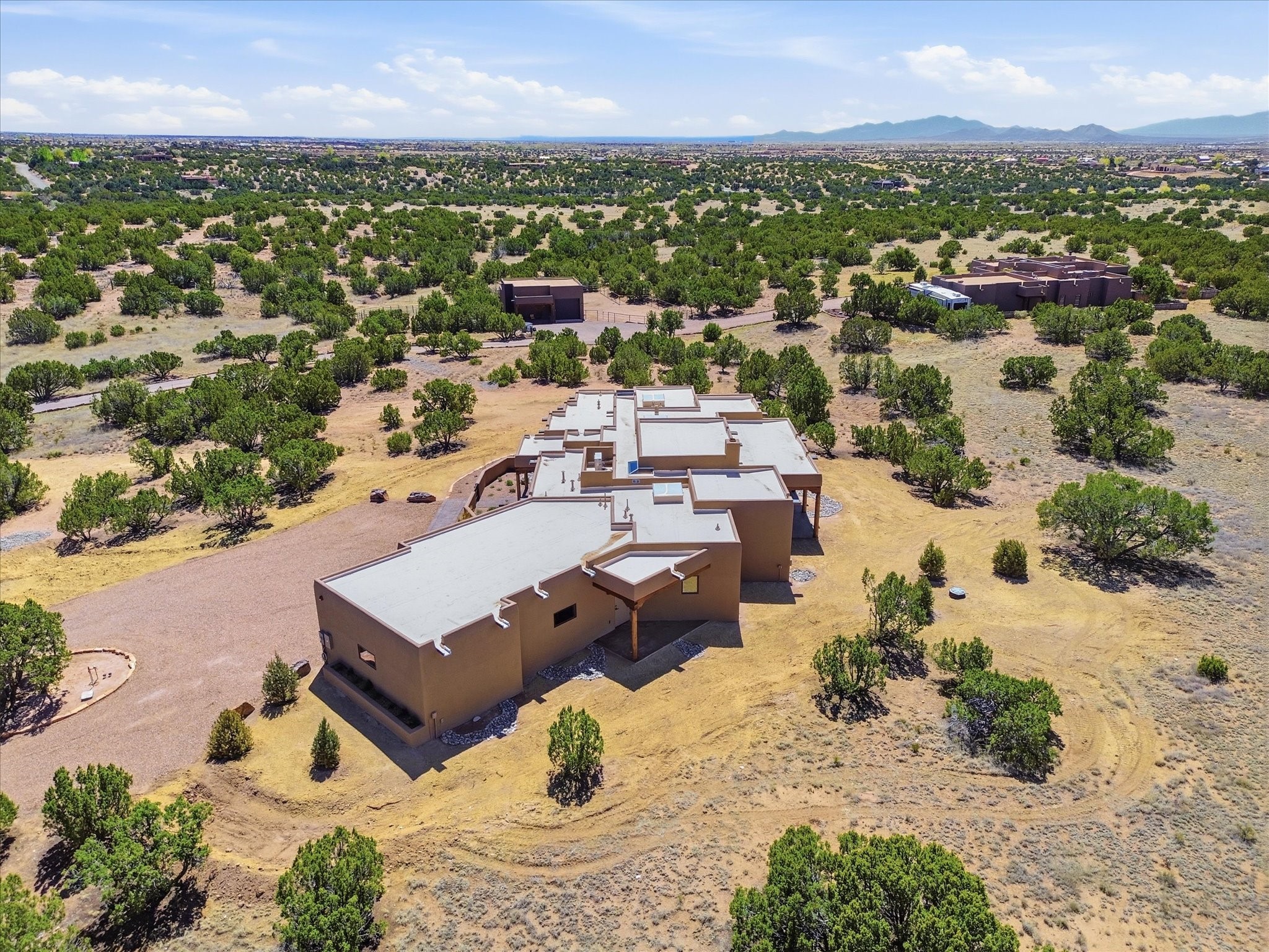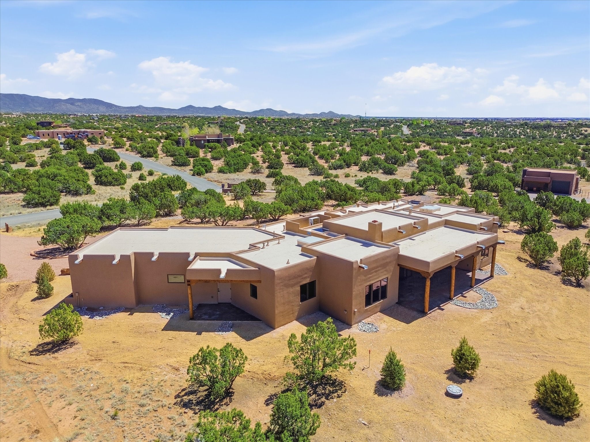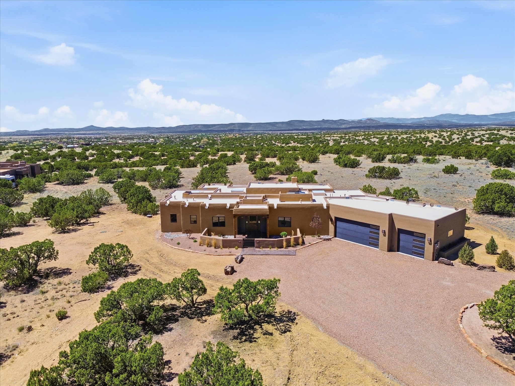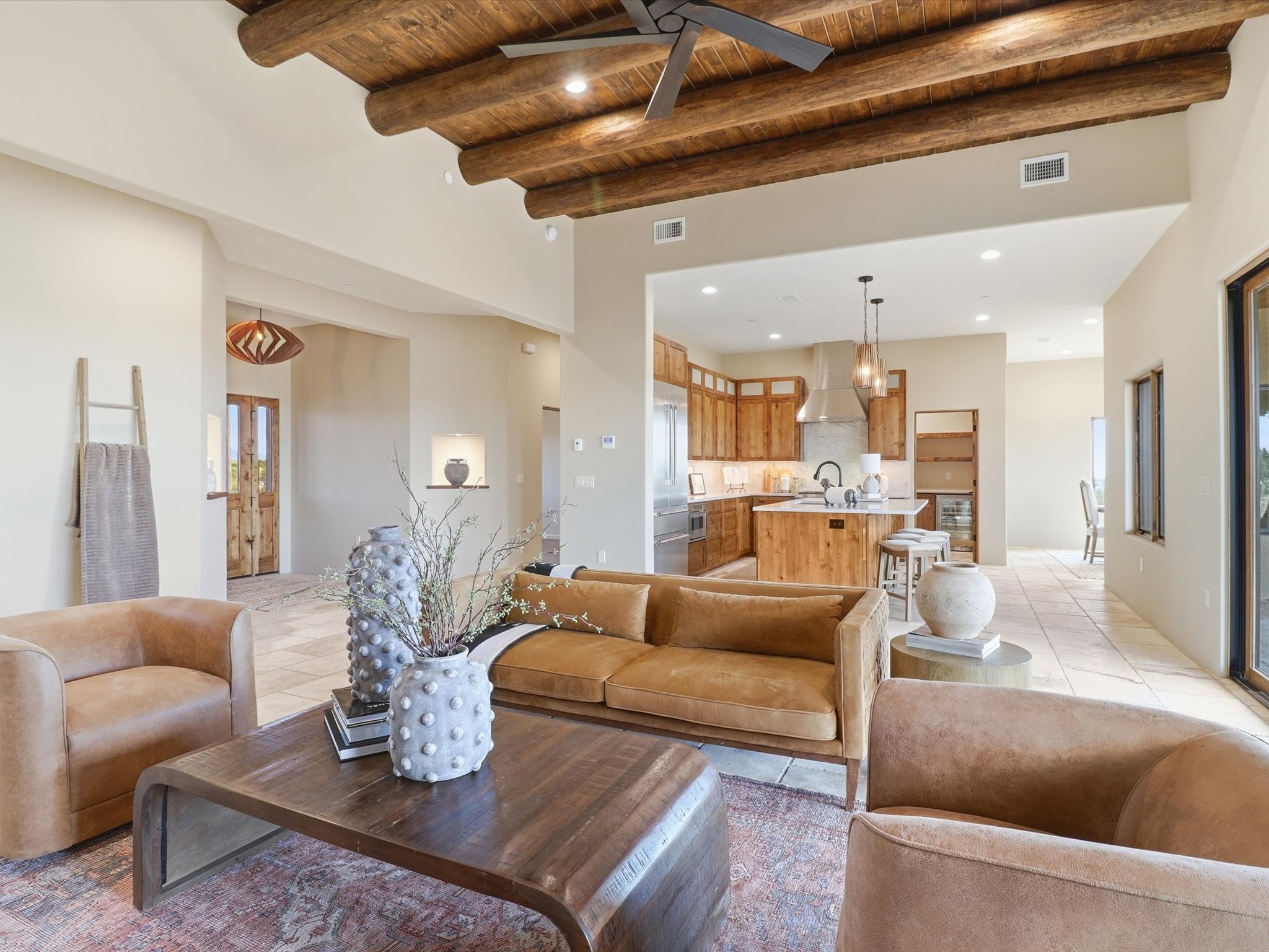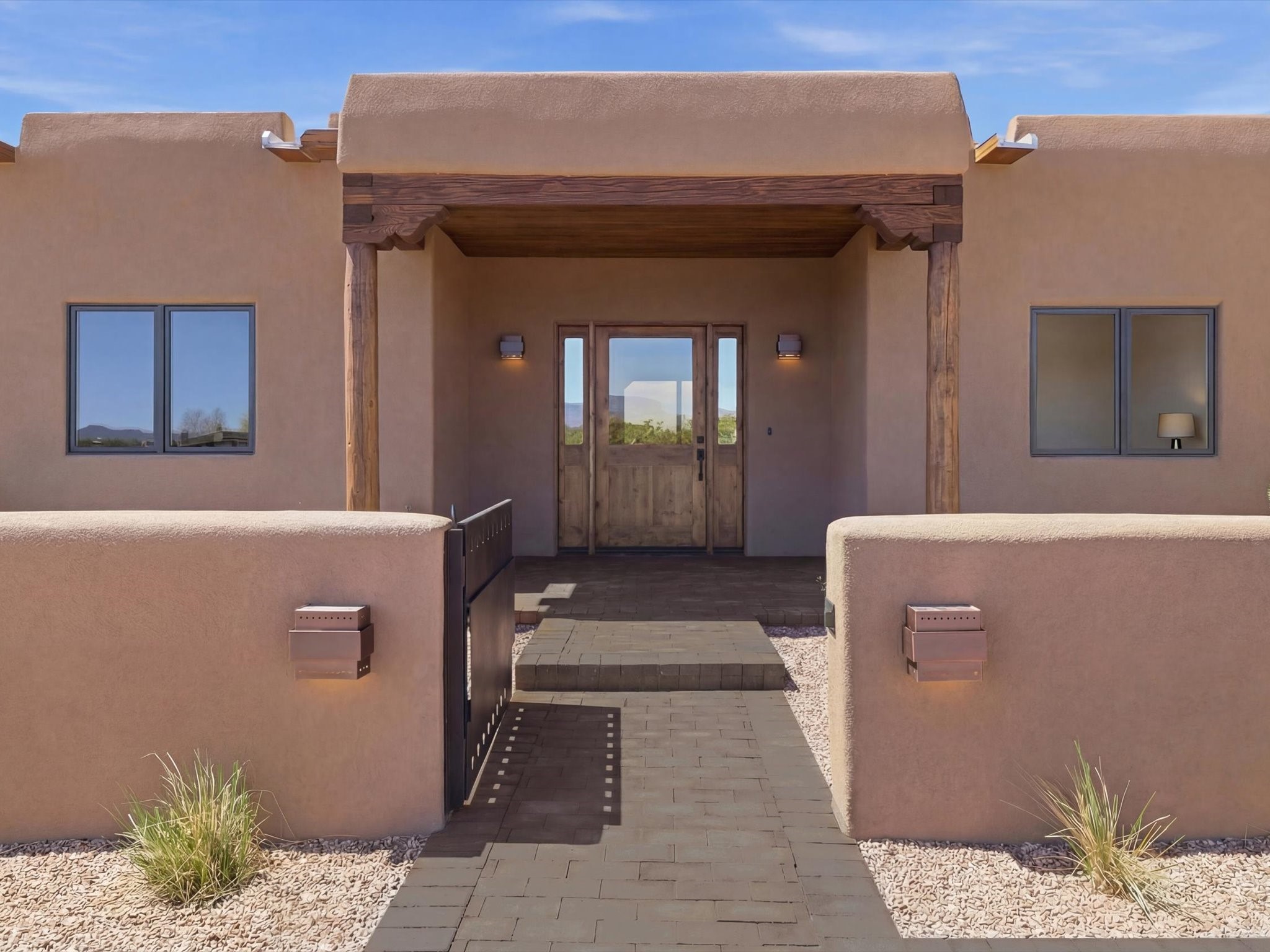 33 Tierra Grande is set on 3.1 equestrian-friendly acres and this sophisticated single-level home offers a seamless layout framed by dramatic vigas, travertine throughout the main living area, and hickory chestnut floors in the three bedrooms and office. The home's centerpiece is a true gourmet kitchen thoughtfully designed featuring Thermador appliances, a built-in wine cooler, elegant quartz countertops, and custom knotty alder cabinetry. This chef's sanctuary flows effortlessly into a dedicated separate dining area, perfect for hosting intimate dinners against a backdrop of the natural landscape and mountain views. Retreat to the primary suite or two additional ensuite bedrooms, all kept comfortable by in-floor radiant heat and high-efficiency ducted mini-splits. Beyond the large brick covered portal and xeriscaped grounds, residents enjoy direct access to miles of private community riding and hiking trails, blending refined modern luxury with the ultimate Santa Fe outdoor lifestyle.