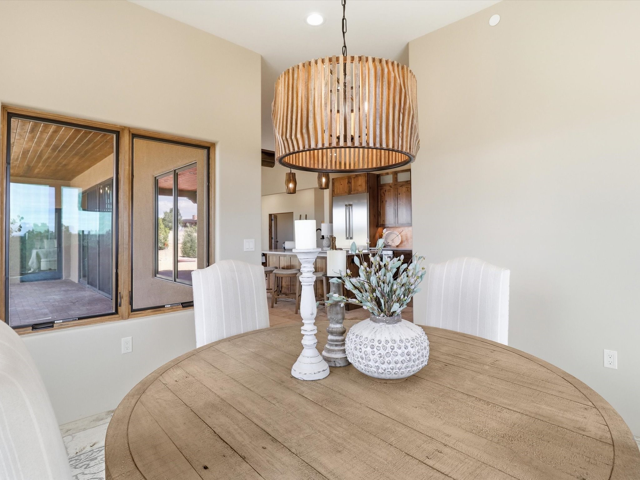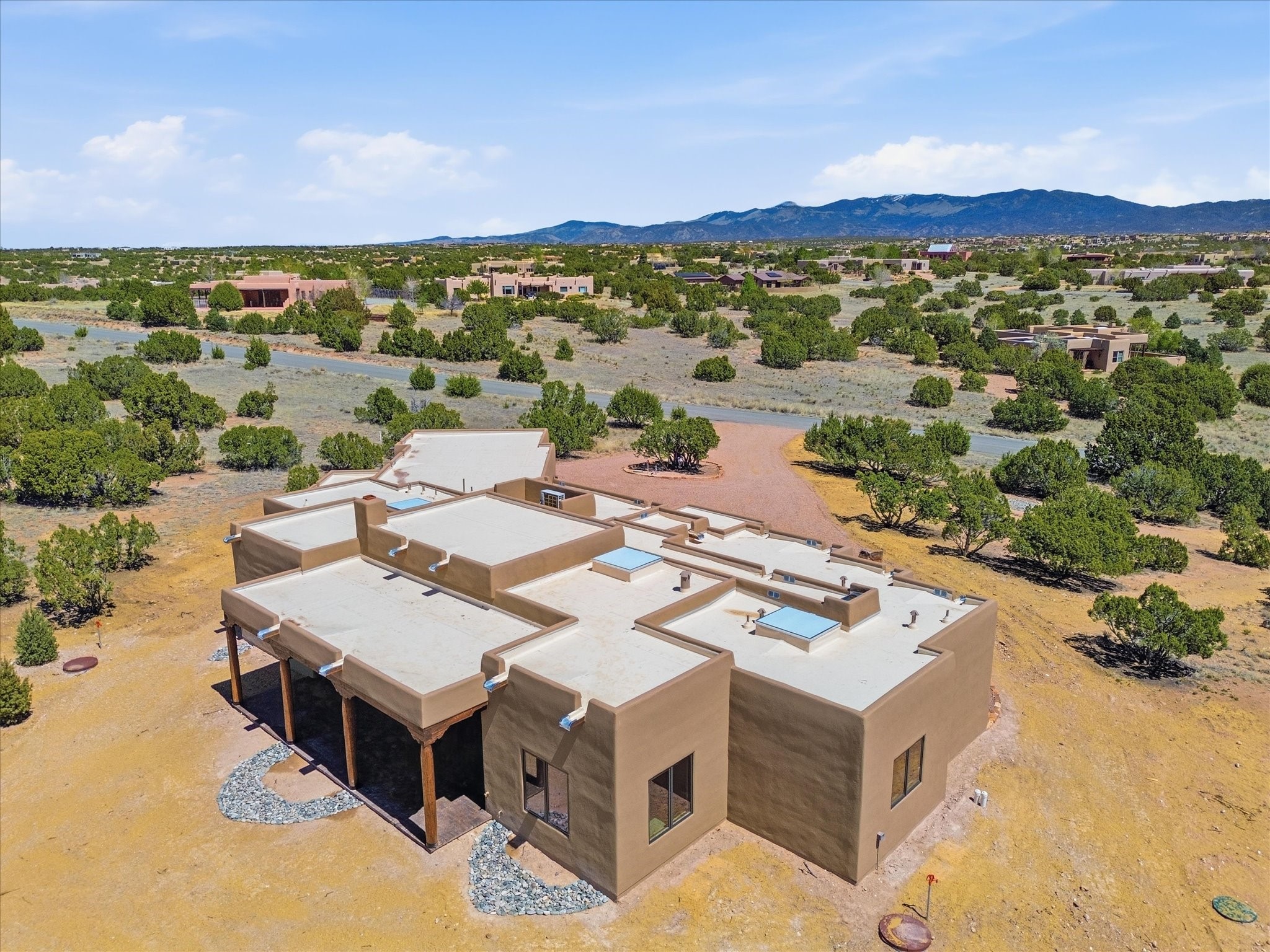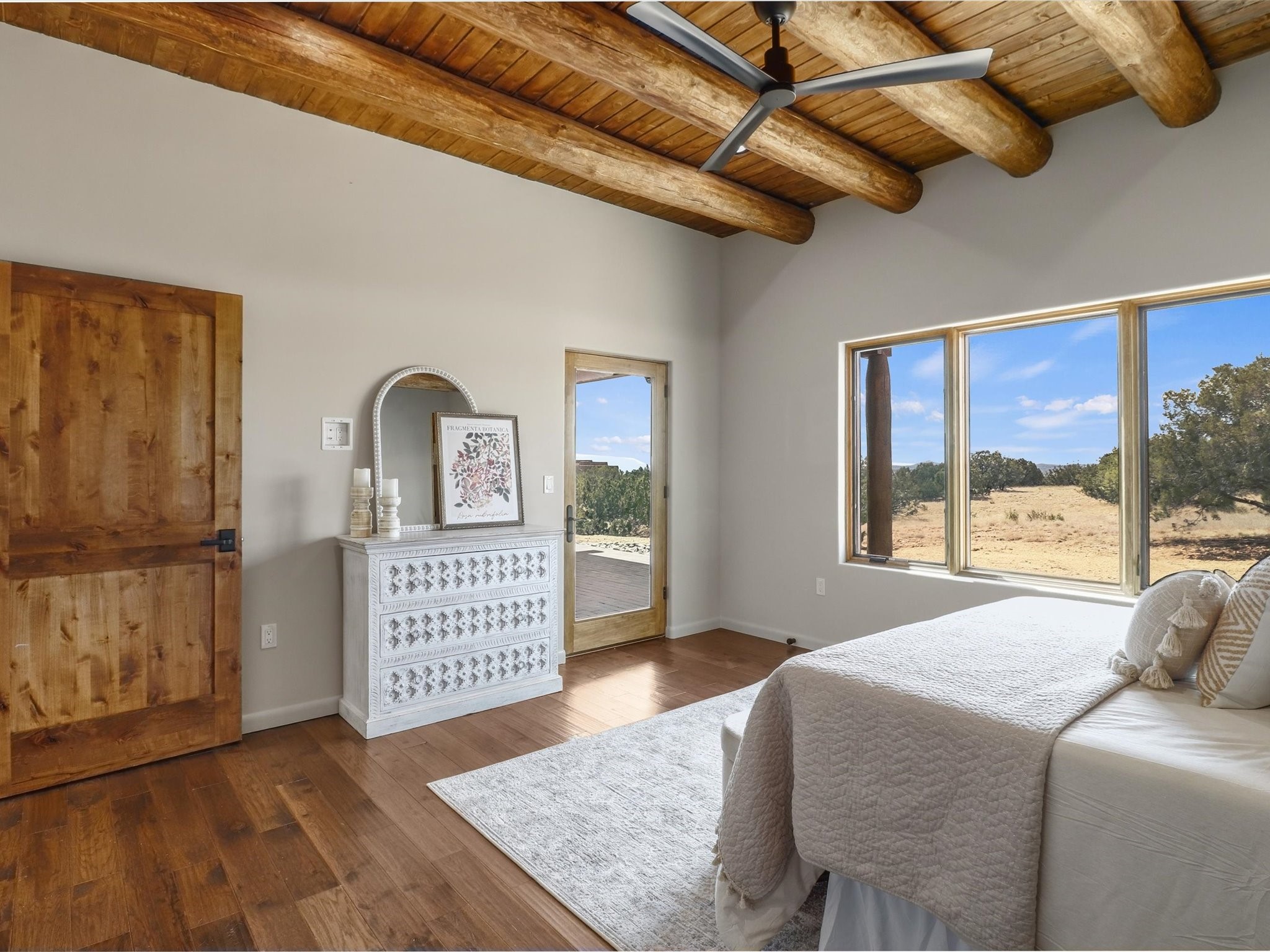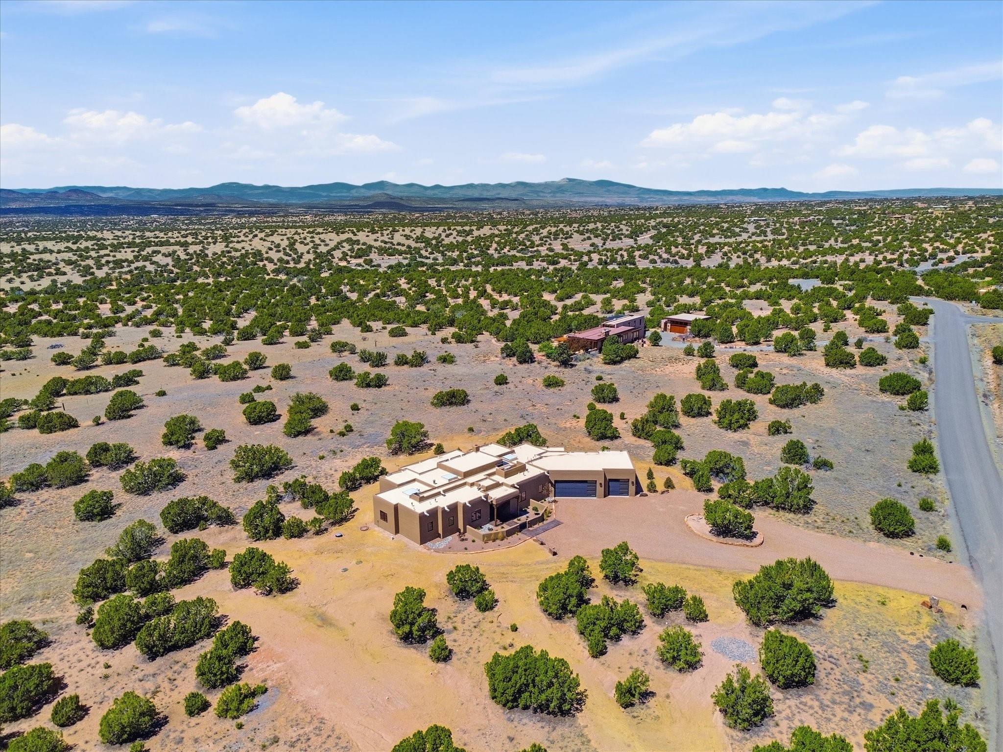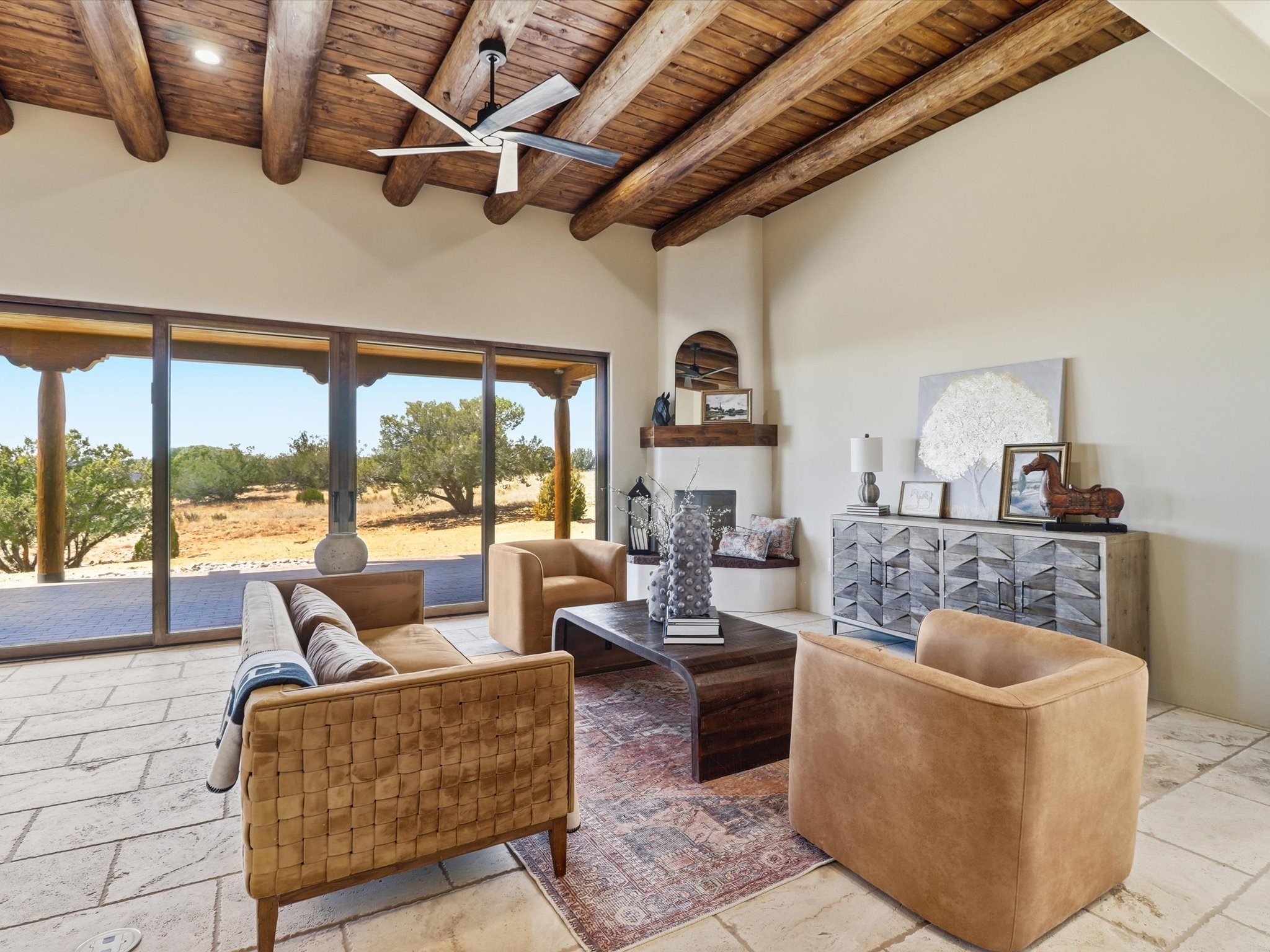 33 Tierra Grande is set on 3.1 equestrian-friendly acres and this sophisticated single-level home offers a seamless layout framed by dramatic vigas, travertine throughout the main living area, and hickory chestnut floors in the three bedrooms and office. The home's centerpiece is a true gourmet kitchen thoughtfully designed featuring Thermador appliances, a built-in wine cooler, elegant quartz countertops, and custom knotty alder cabinetry. This chef's sanctuary flows effortlessly into a dedicated separate dining area, perfect for hosting intimate dinners against a backdrop of the natural landscape and mountain views. Retreat to the primary suite or two additional ensuite bedrooms, all kept comfortable by in-floor radiant heat and high-efficiency ducted mini-splits. Beyond the large brick covered portal and xeriscaped grounds, residents enjoy direct access to miles of private community riding and hiking trails, blending refined modern luxury with the ultimate Santa Fe outdoor lifestyle.