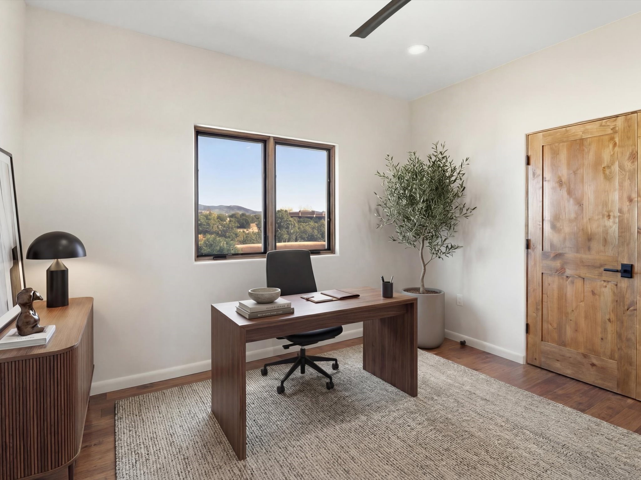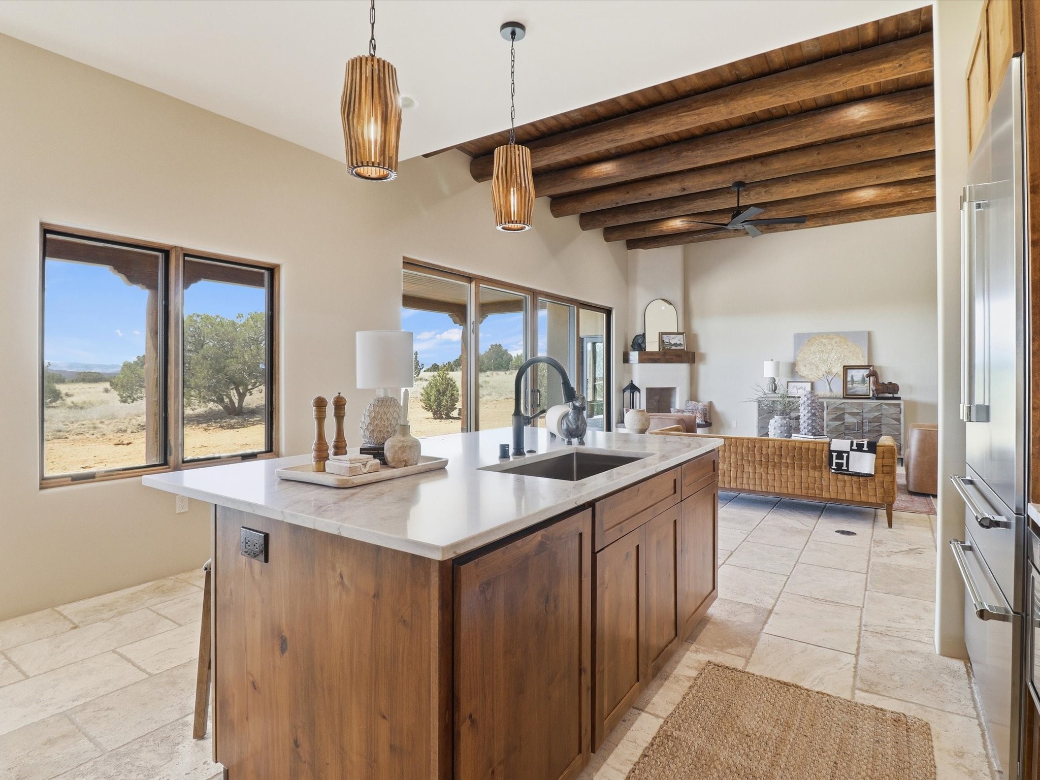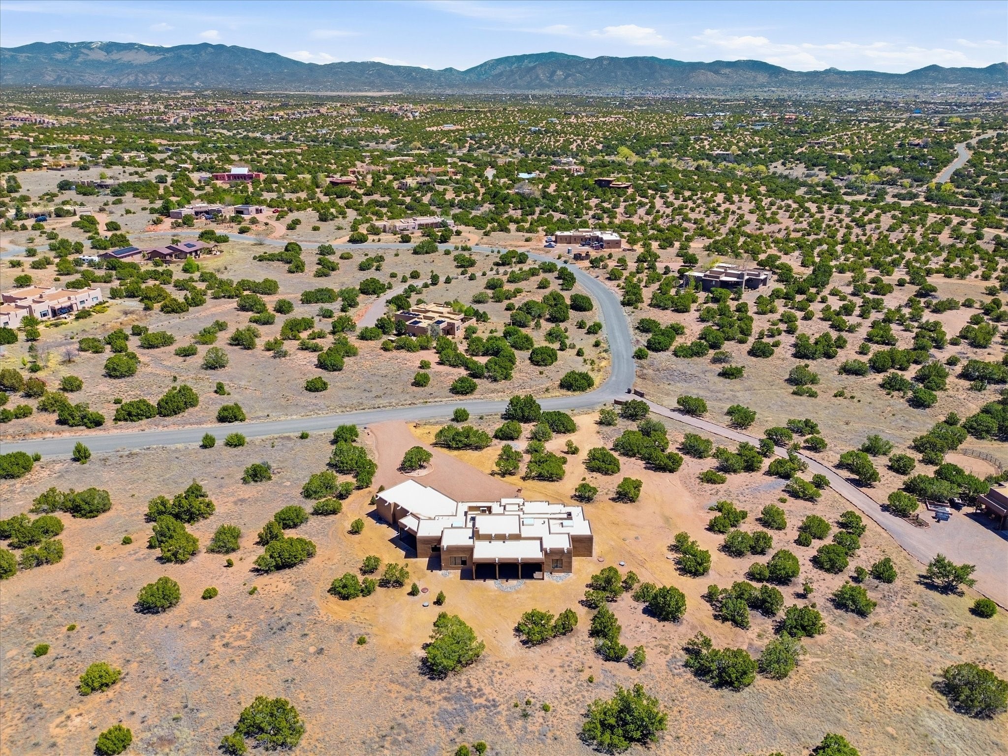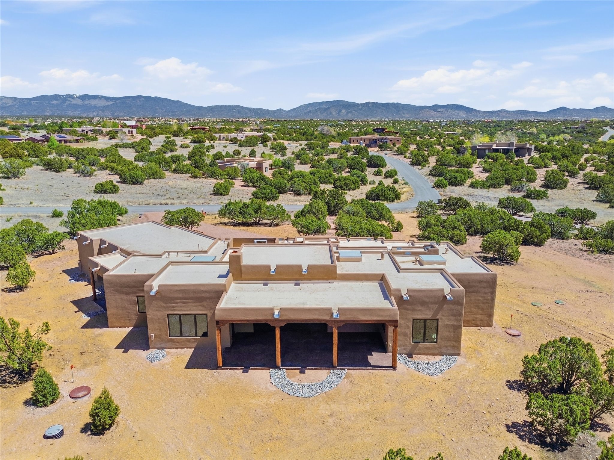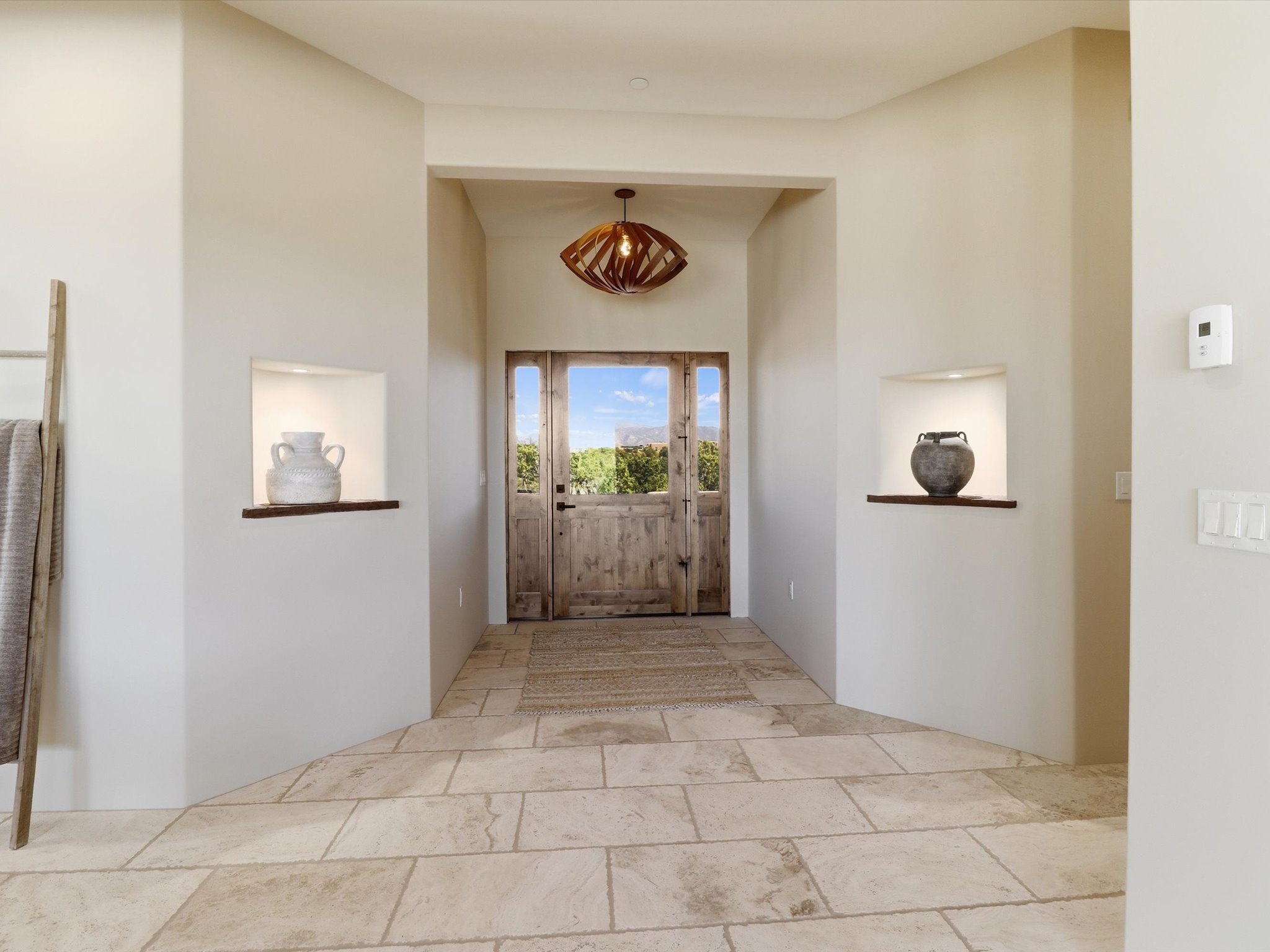 33 Tierra Grande is set on 3.1 equestrian-friendly acres and this sophisticated single-level home offers a seamless layout framed by dramatic vigas, travertine throughout the main living area, and hickory chestnut floors in the three bedrooms and office. The home's centerpiece is a true gourmet kitchen thoughtfully designed featuring Thermador appliances, a built-in wine cooler, elegant quartz countertops, and custom knotty alder cabinetry. This chef's sanctuary flows effortlessly into a dedicated separate dining area, perfect for hosting intimate dinners against a backdrop of the natural landscape and mountain views. Retreat to the primary suite or two additional ensuite bedrooms, all kept comfortable by in-floor radiant heat and high-efficiency ducted mini-splits. Beyond the large brick covered portal and xeriscaped grounds, residents enjoy direct access to miles of private community riding and hiking trails, blending refined modern luxury with the ultimate Santa Fe outdoor lifestyle.