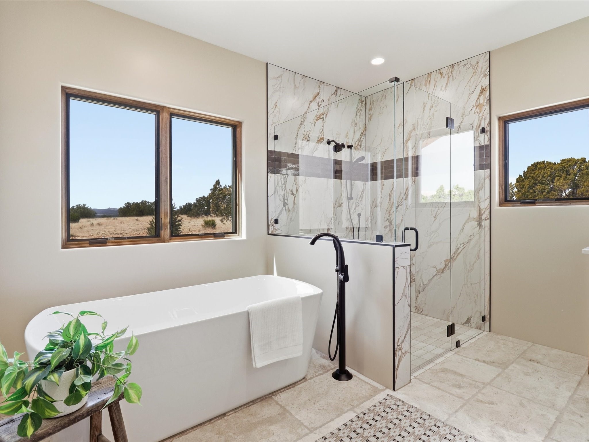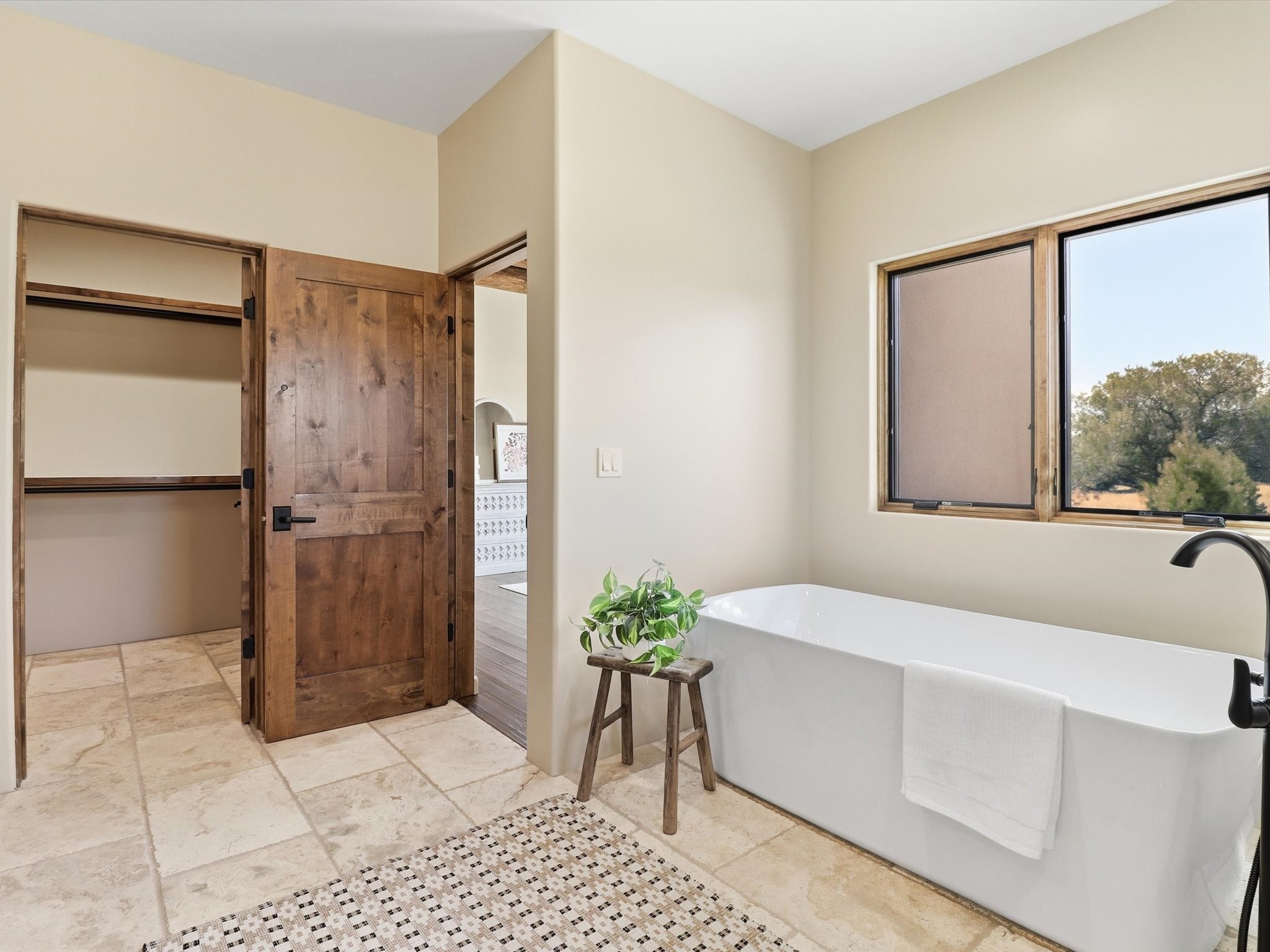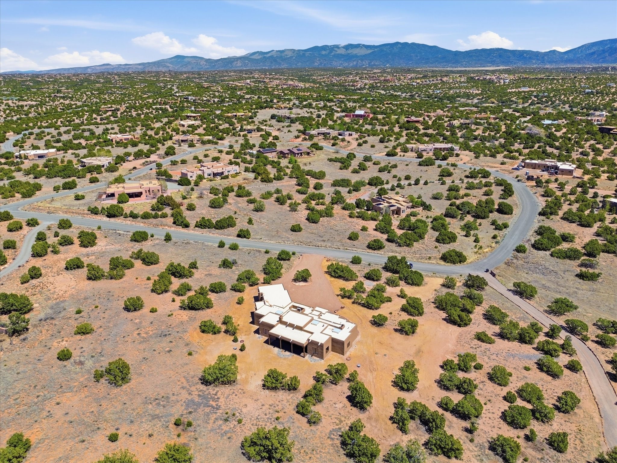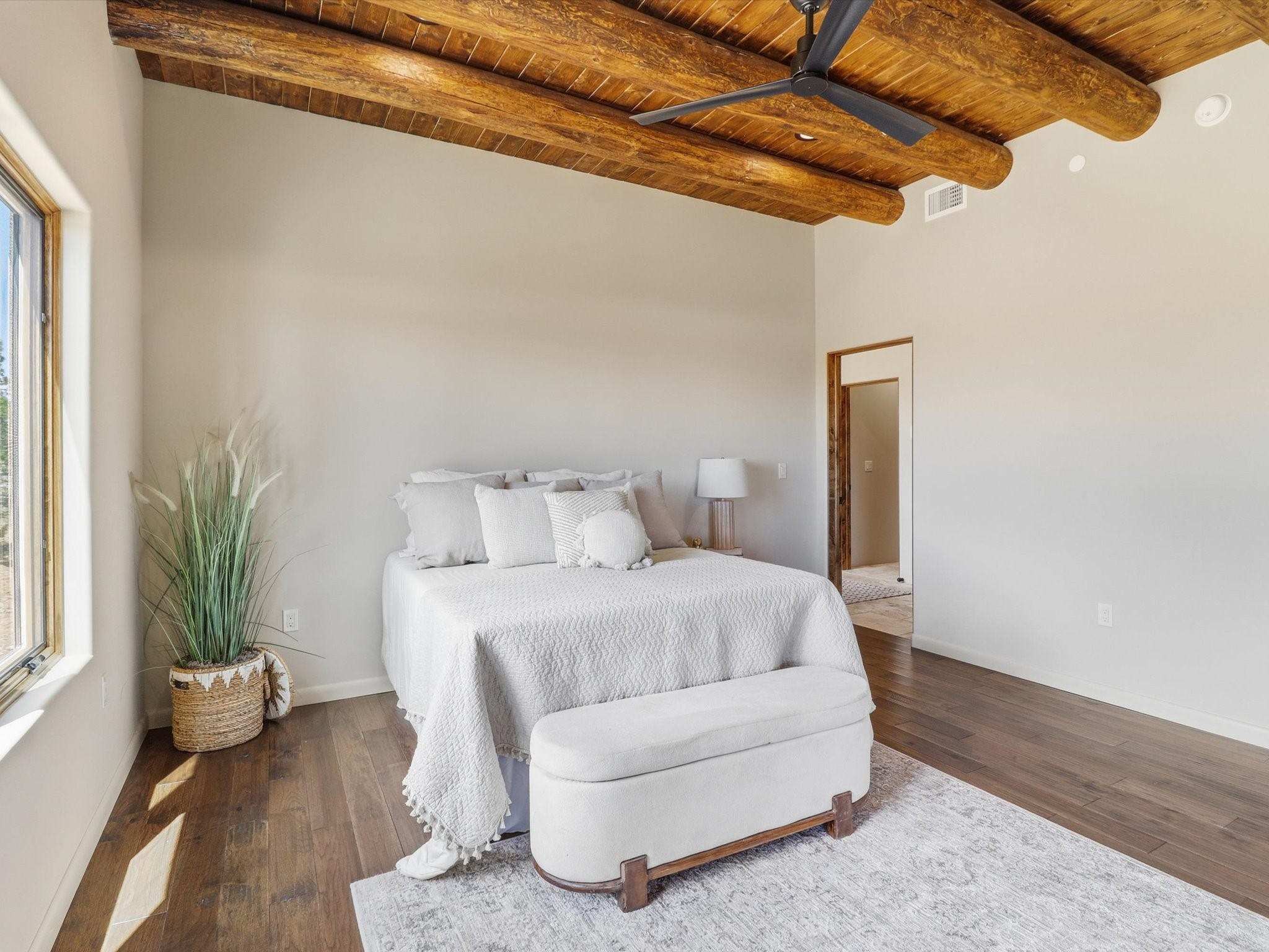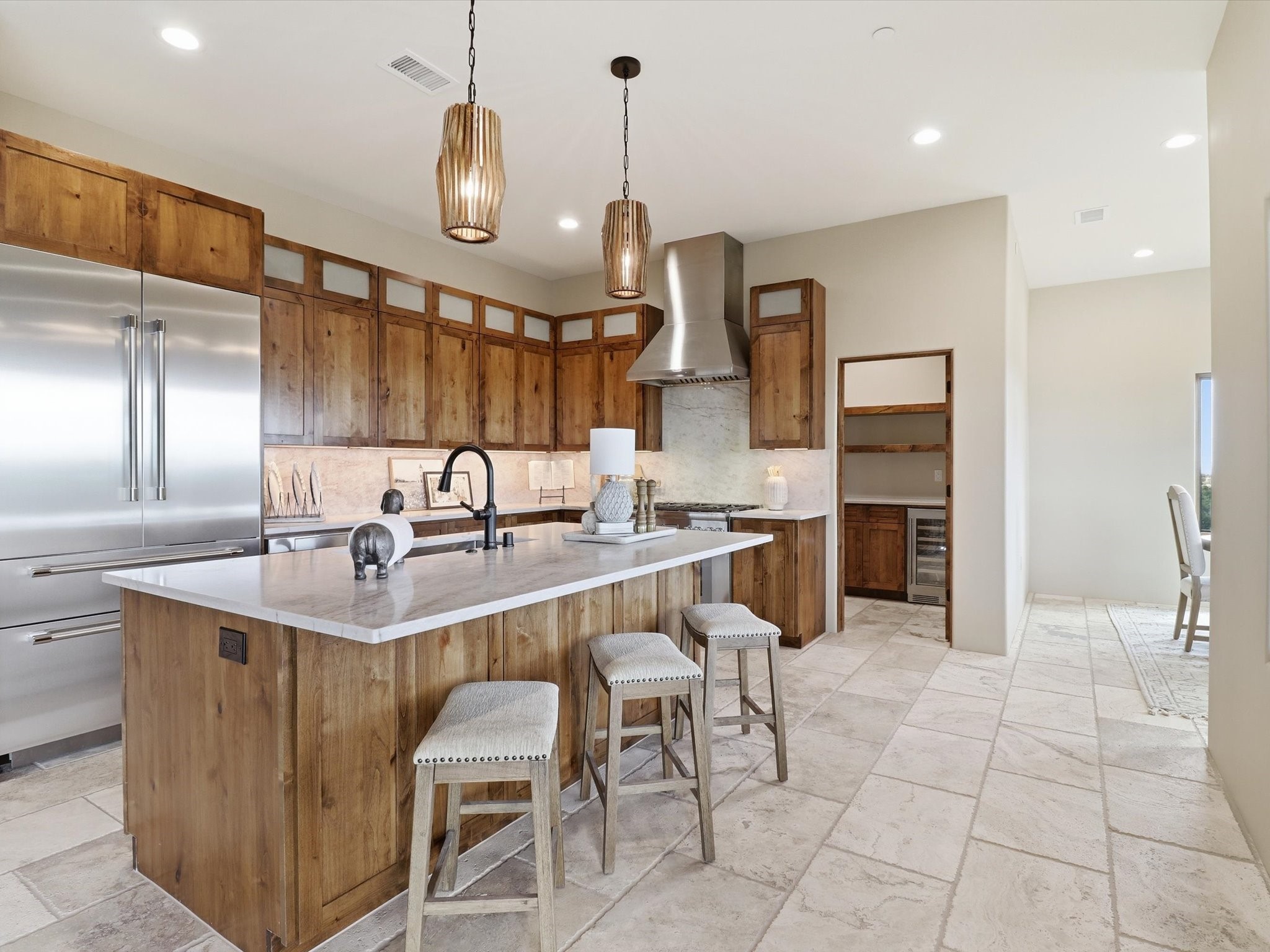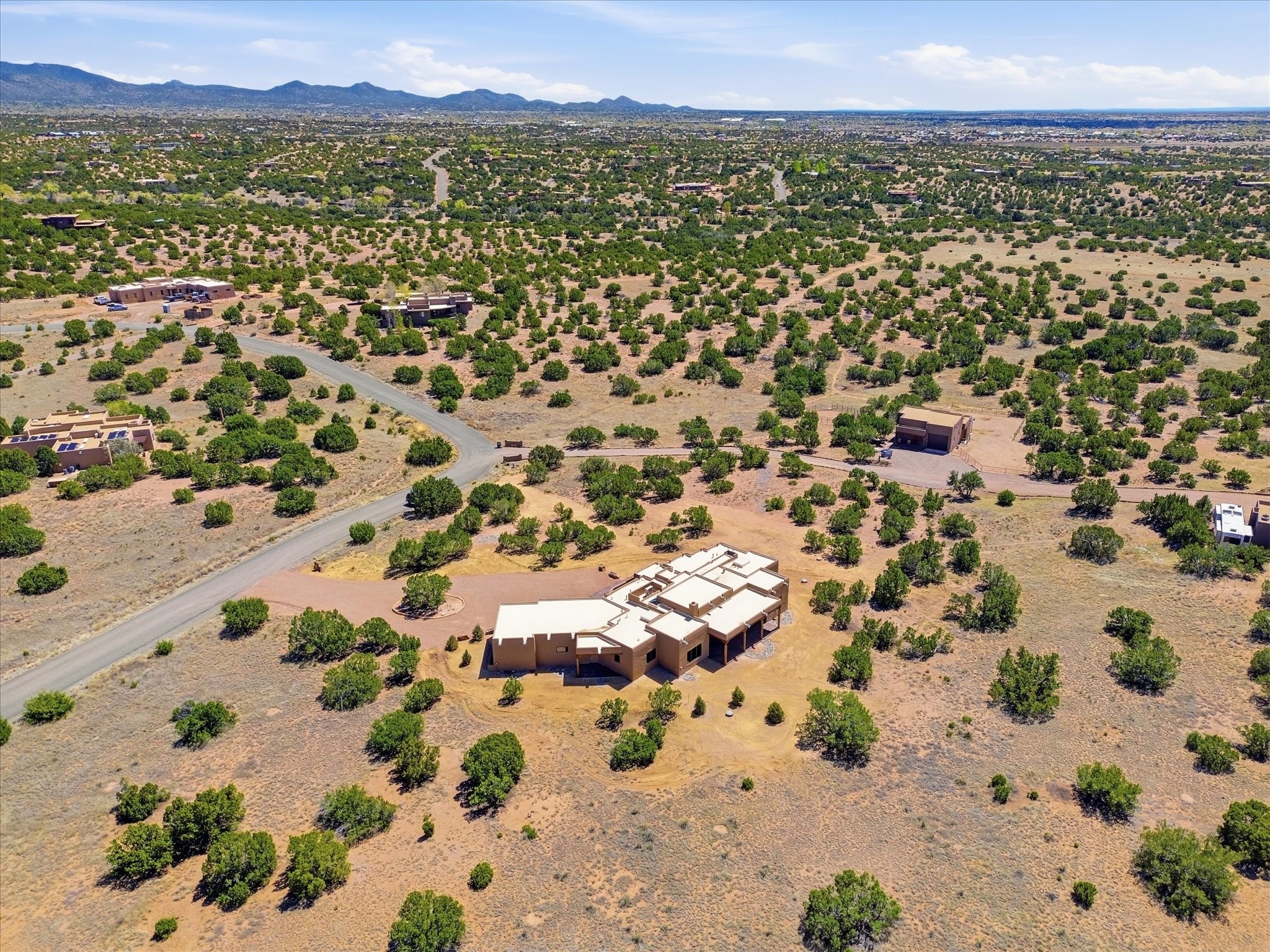 33 Tierra Grande is set on 3.1 equestrian-friendly acres and this sophisticated single-level home offers a seamless layout framed by dramatic vigas, travertine throughout the main living area, and hickory chestnut floors in the three bedrooms and office. The home's centerpiece is a true gourmet kitchen thoughtfully designed featuring Thermador appliances, a built-in wine cooler, elegant quartz countertops, and custom knotty alder cabinetry. This chef's sanctuary flows effortlessly into a dedicated separate dining area, perfect for hosting intimate dinners against a backdrop of the natural landscape and mountain views. Retreat to the primary suite or two additional ensuite bedrooms, all kept comfortable by in-floor radiant heat and high-efficiency ducted mini-splits. Beyond the large brick covered portal and xeriscaped grounds, residents enjoy direct access to miles of private community riding and hiking trails, blending refined modern luxury with the ultimate Santa Fe outdoor lifestyle.