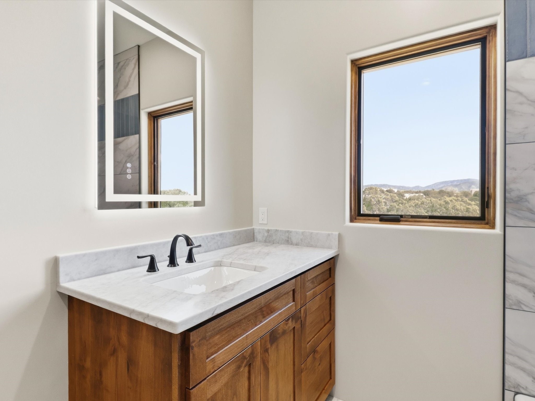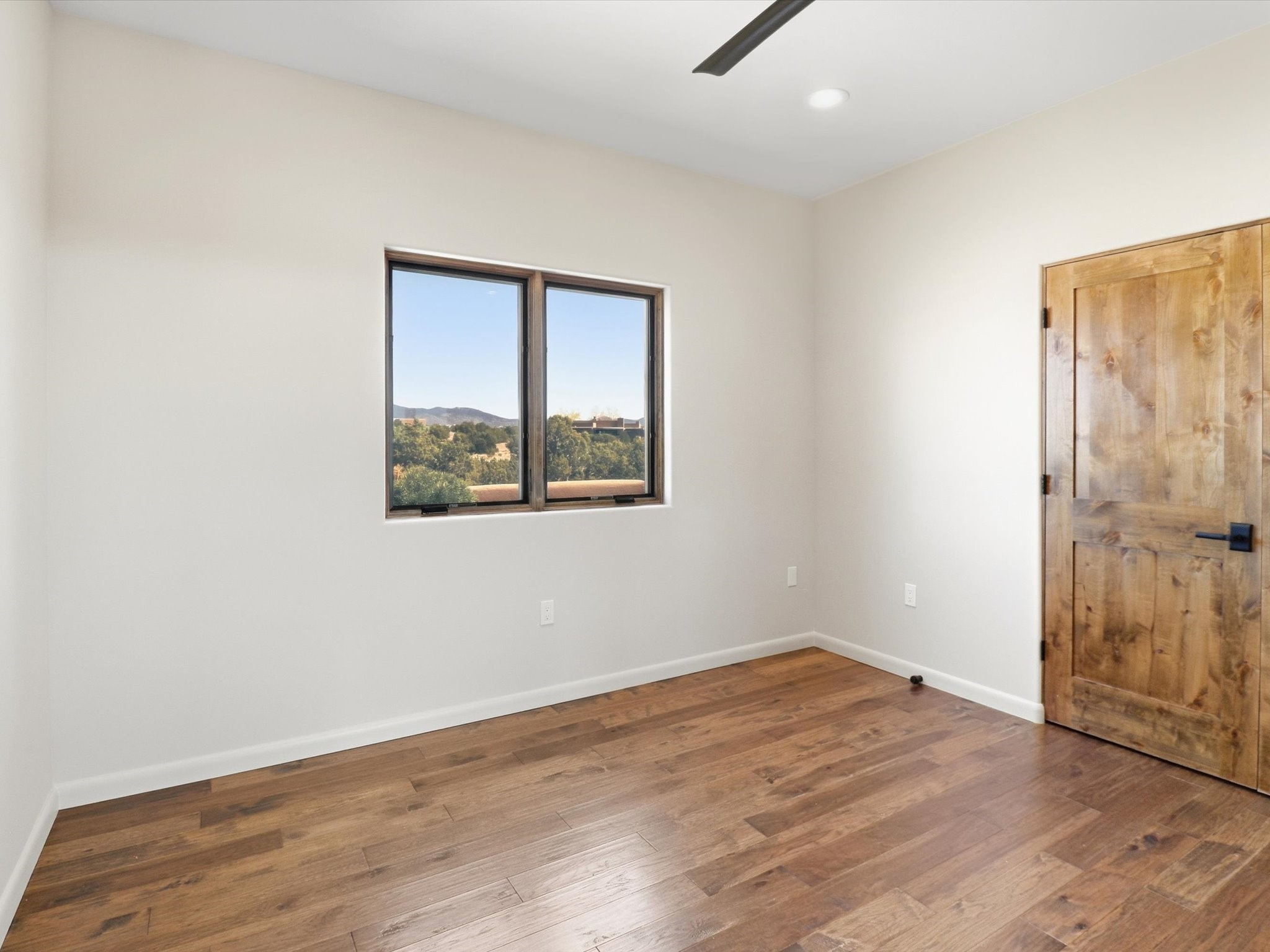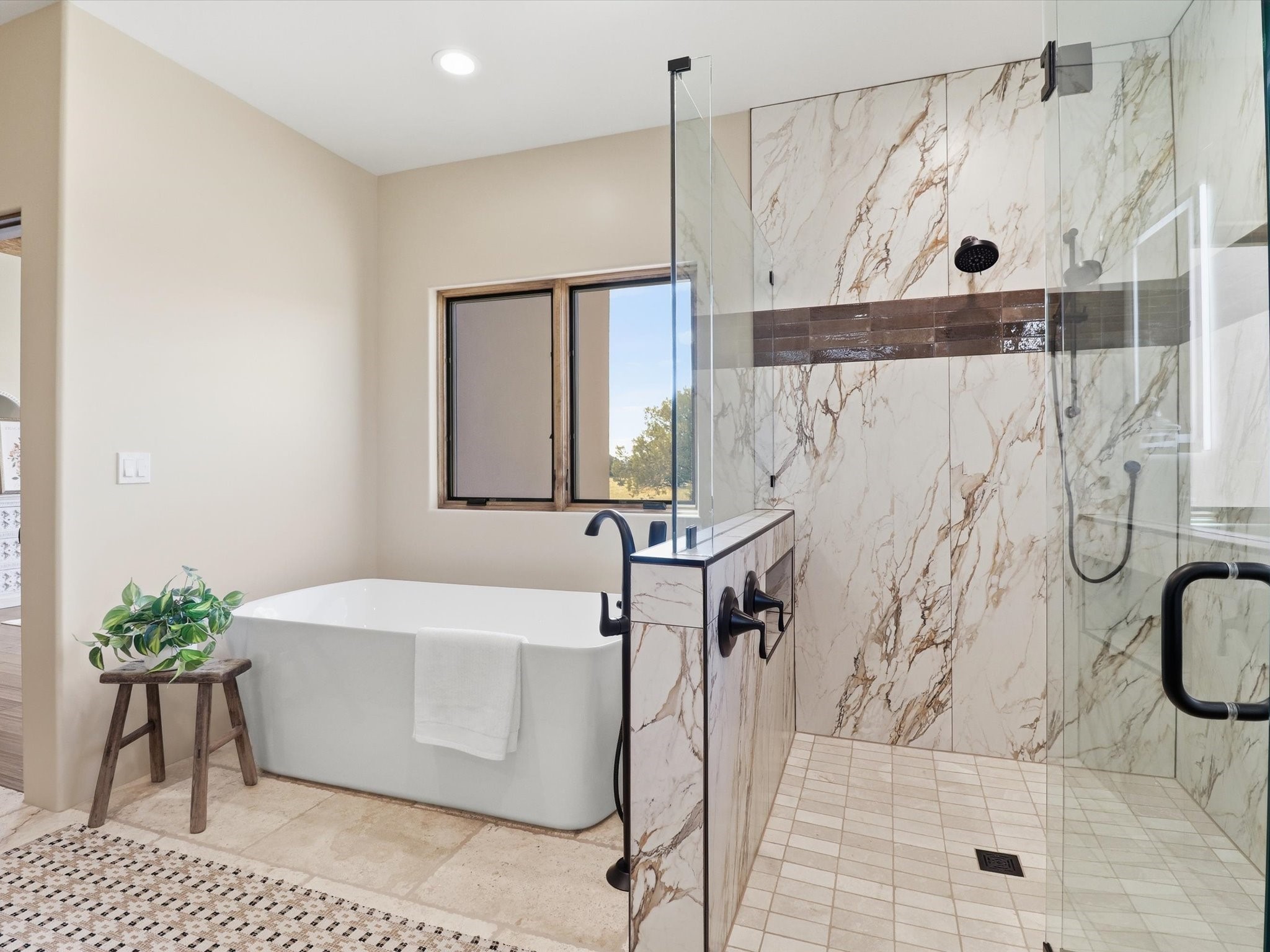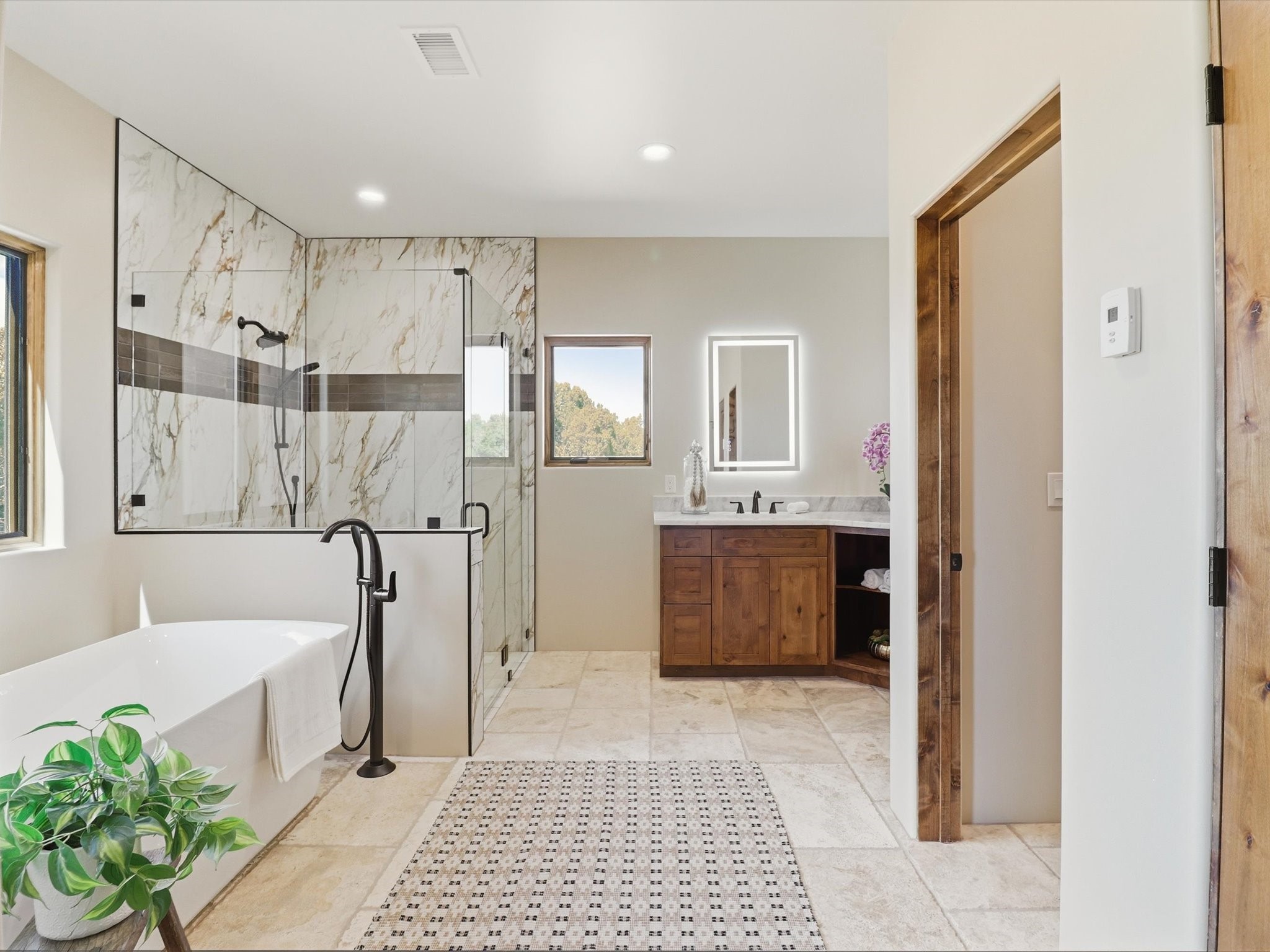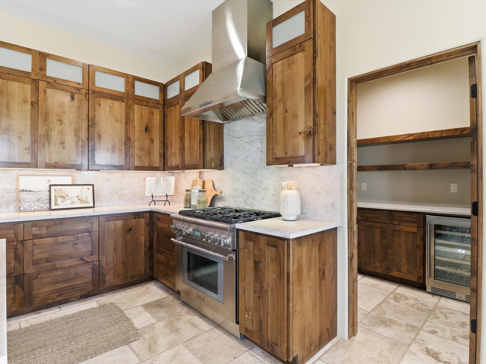 33 Tierra Grande is set on 3.1 equestrian-friendly acres and this sophisticated single-level home offers a seamless layout framed by dramatic vigas, travertine throughout the main living area, and hickory chestnut floors in the three bedrooms and office. The home's centerpiece is a true gourmet kitchen thoughtfully designed featuring Thermador appliances, a built-in wine cooler, elegant quartz countertops, and custom knotty alder cabinetry. This chef's sanctuary flows effortlessly into a dedicated separate dining area, perfect for hosting intimate dinners against a backdrop of the natural landscape and mountain views. Retreat to the primary suite or two additional ensuite bedrooms, all kept comfortable by in-floor radiant heat and high-efficiency ducted mini-splits. Beyond the large brick covered portal and xeriscaped grounds, residents enjoy direct access to miles of private community riding and hiking trails, blending refined modern luxury with the ultimate Santa Fe outdoor lifestyle.