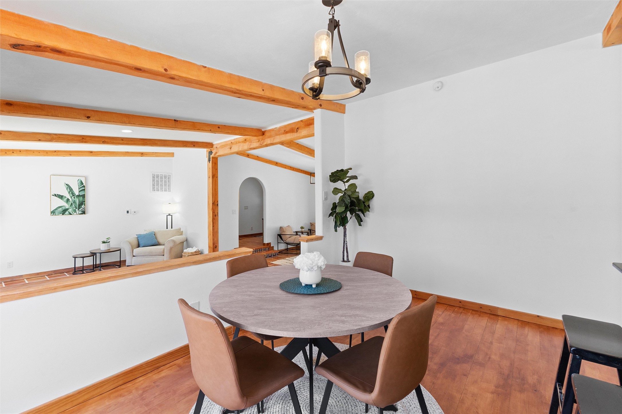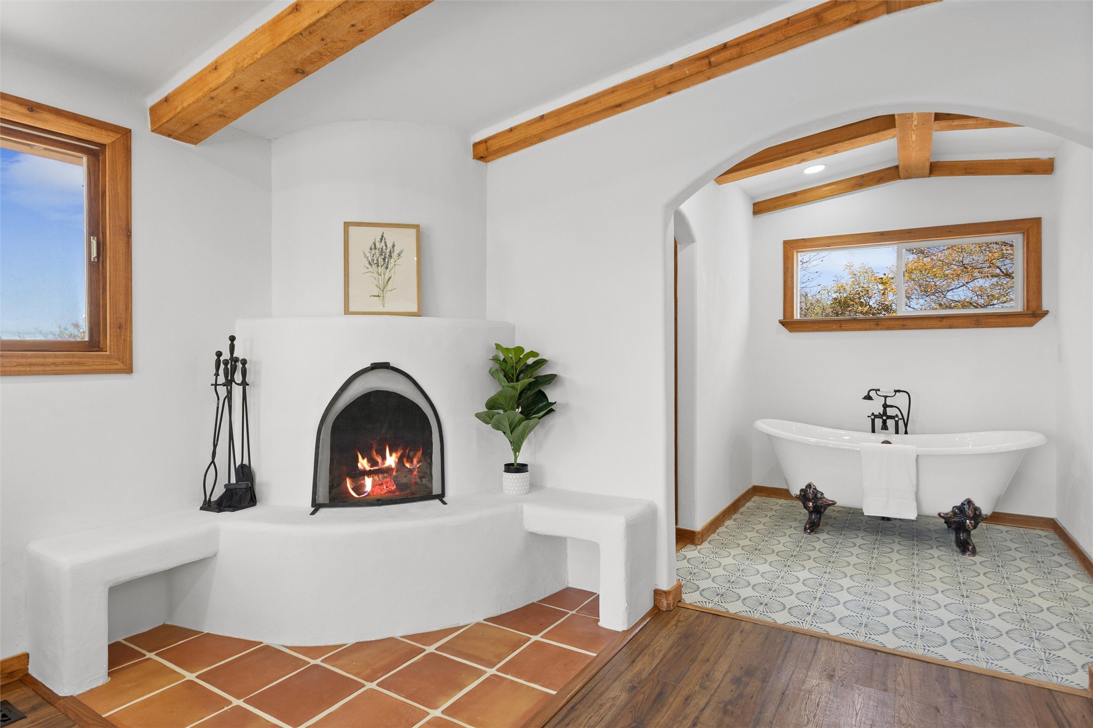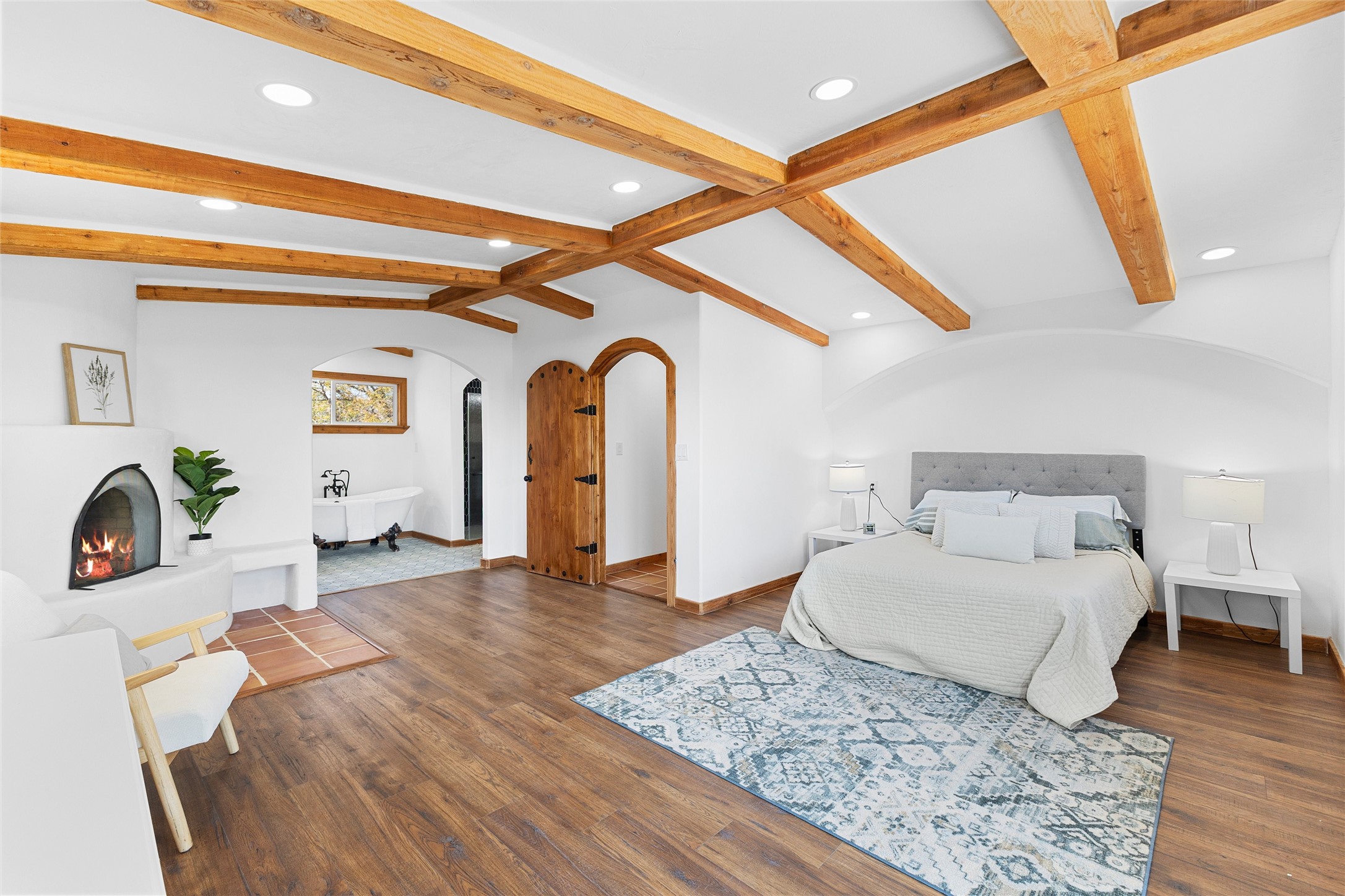 Tucked into a quiet cul-de-sac on desirable Barranca Mesa, 10 Tesuque offers over 3,000 square feet on a spacious .37-acre lot. Extensively remodeled in 2026 with nearly $225,000 worth of updates, this warm and welcoming 3-bedroom, 2-bathroom home blends Southwest character with thoughtful modern updates, including plaster walls, Saltillo tile floors, wood beams, in-floor radiant heat, updated lighting, a new tankless water heater, new furnace, and AC.The private primary suite has been transformed into a true sanctuary, featuring a kiva fireplace, abundant natural light, a Juliet balcony, walk-in closet, custom tile work, and a standalone clawfoot tub. Downstairs, you'll find two additional bedrooms with closet systems, a full bathroom, and a basement space perfect for a theater room, playroom, or extra storage.The living room fireplace features a plaster surround, custom tile, and a substantial mantel perfect for holiday decorating. Nichos, built-in shelving, and inviting architectural details add charm throughout. The open-concept kitchen is highly functional and offers generous cabinet space.Outside, the large lot provides room to roam, entertain, garden, and store your RV or toys with ease thanks to the wide double gate. With so much to offer, and move in ready ease, schedule your showing today, this one won't last long!