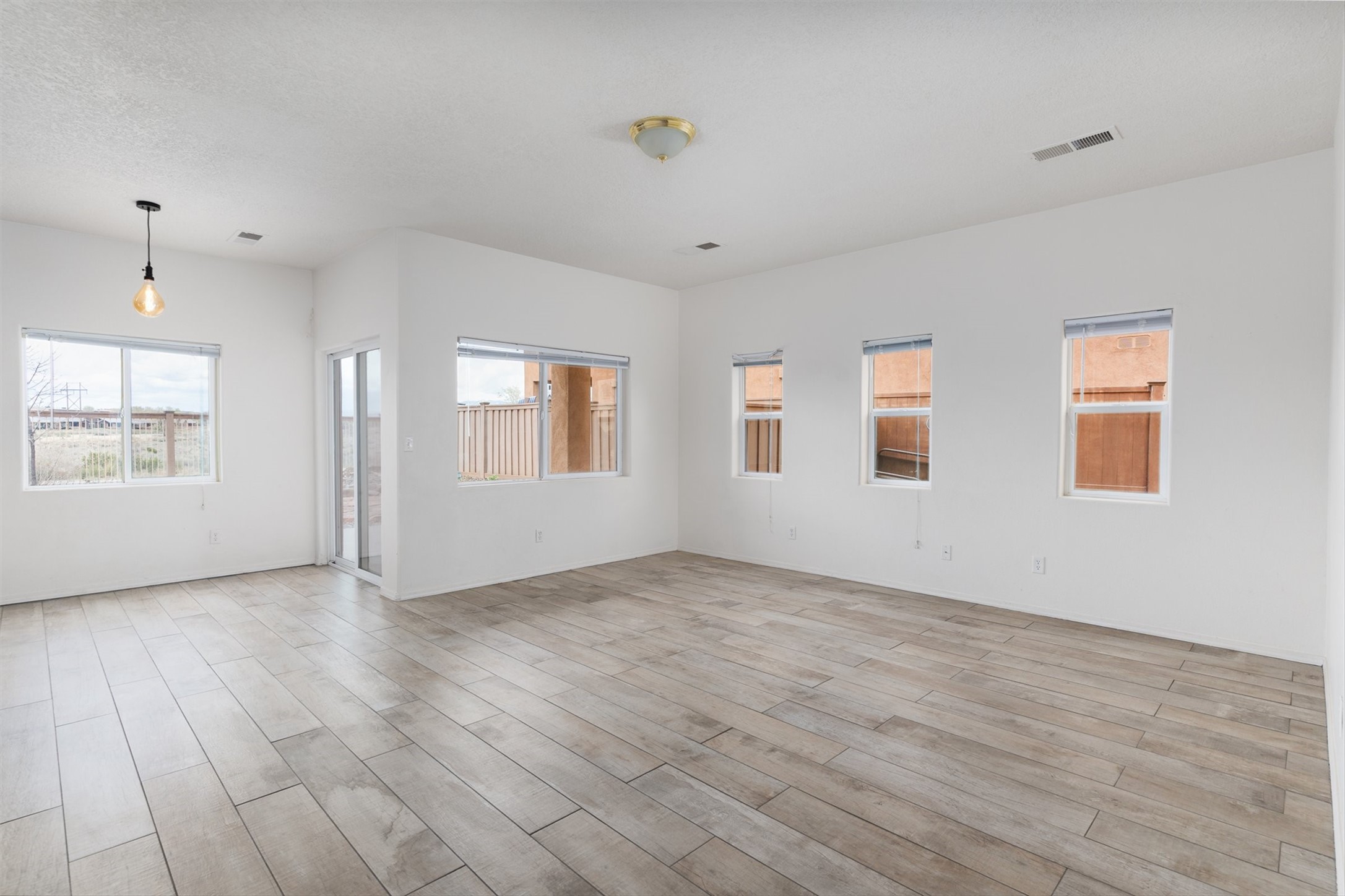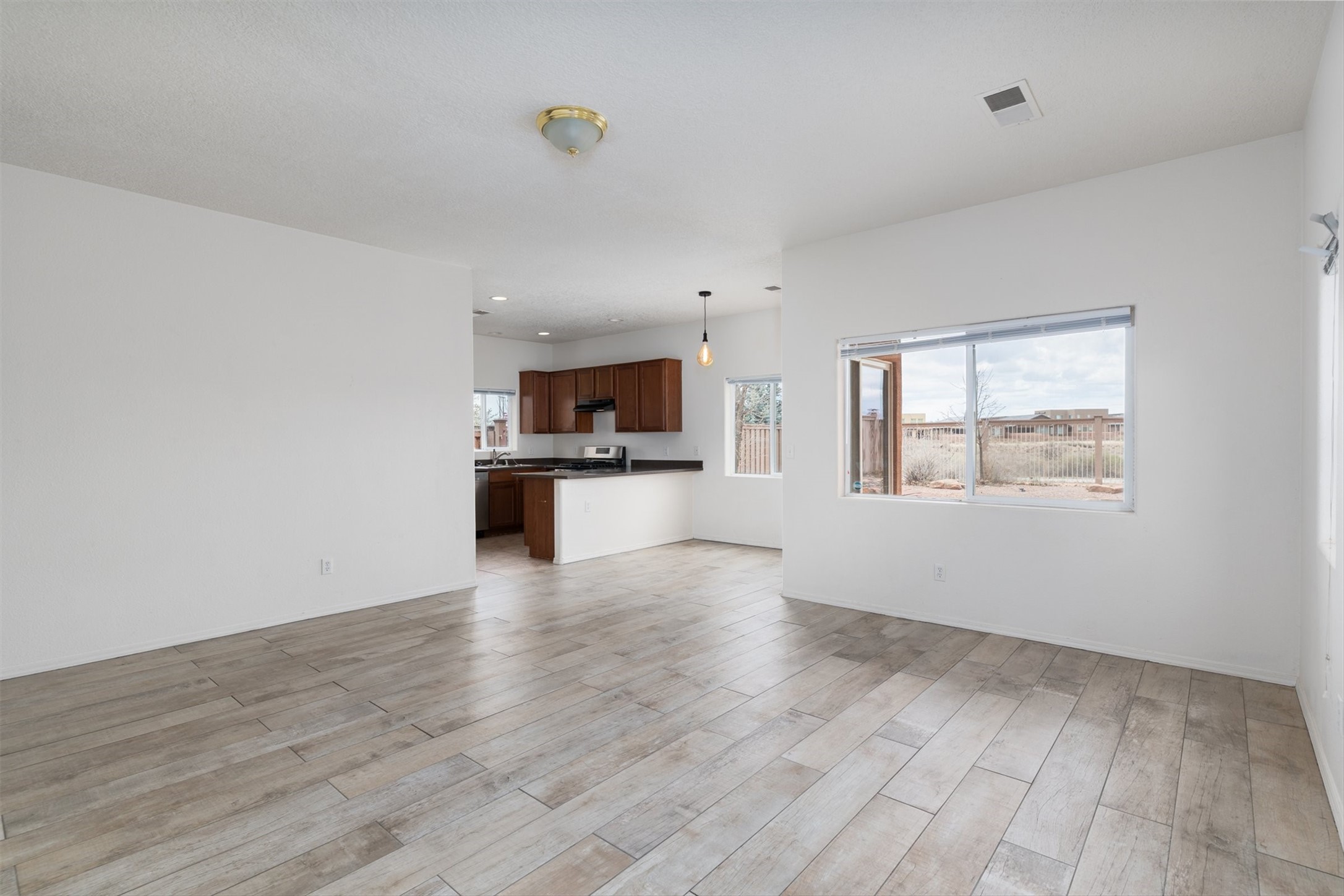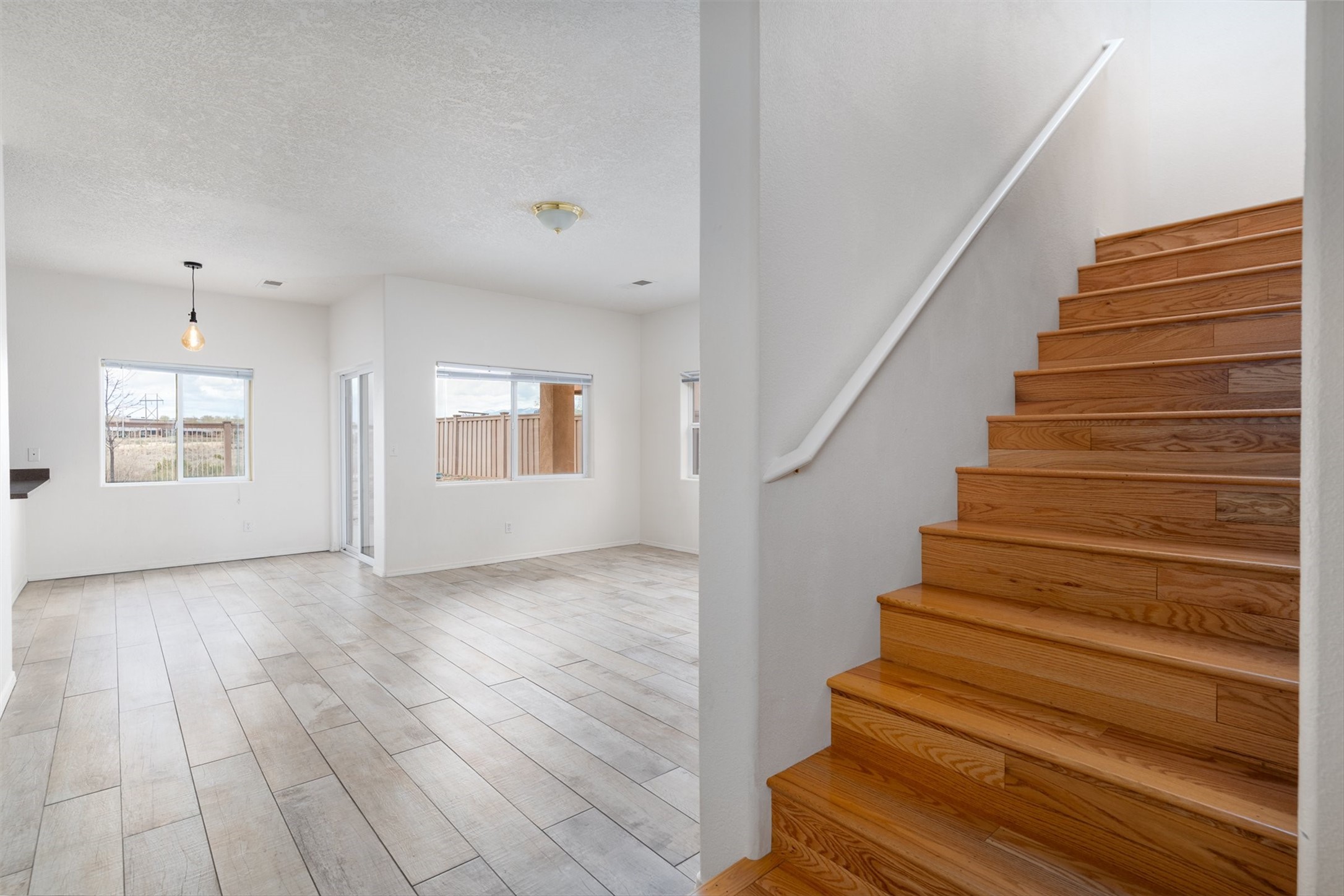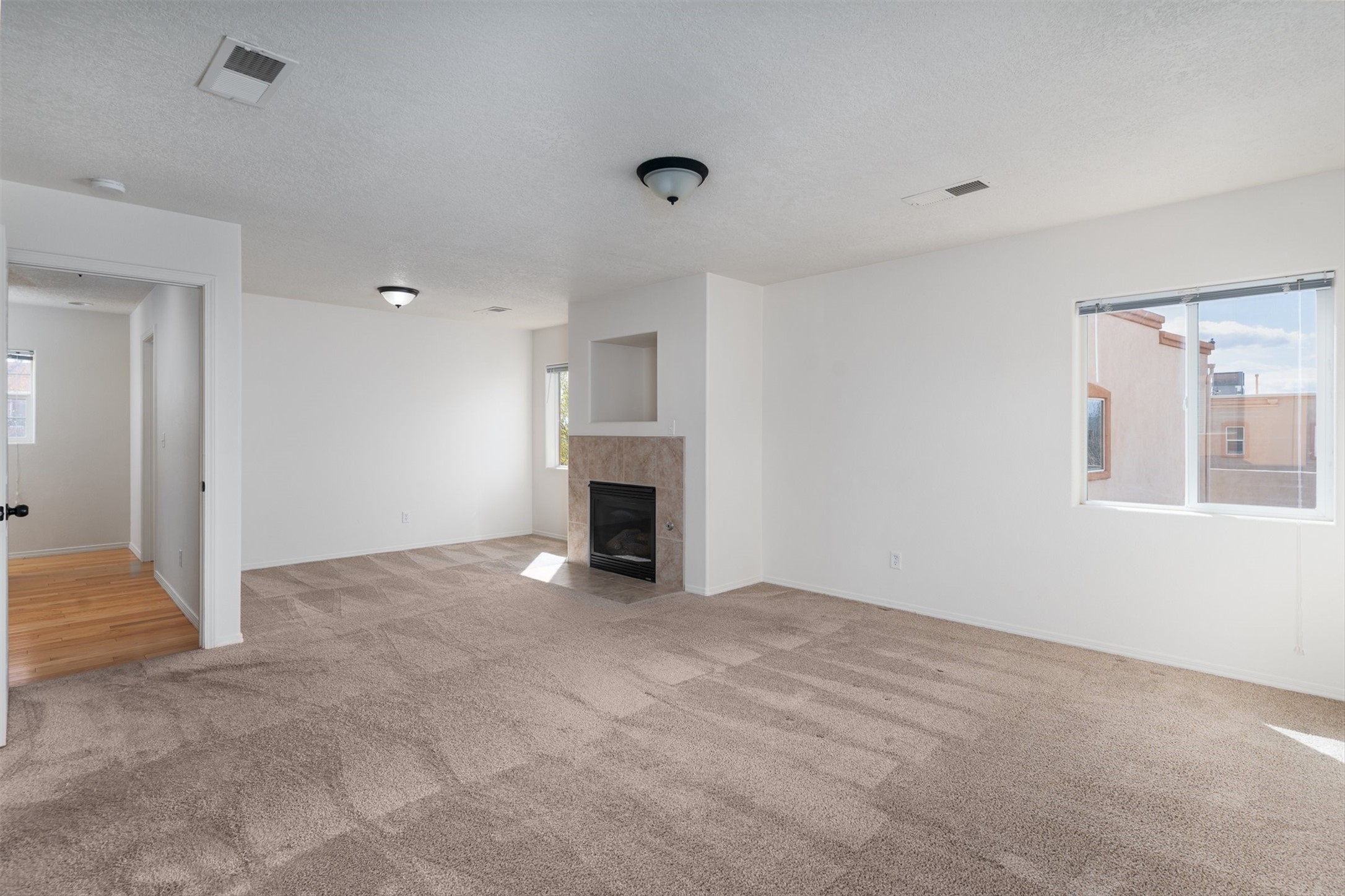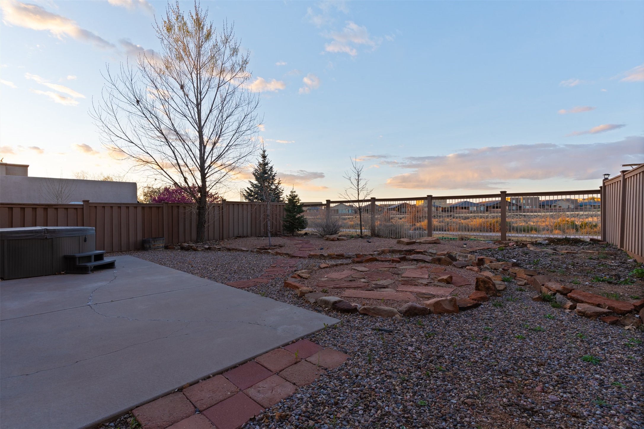 Light-filled contemporary home backing directly to open space and a paved trail, offering unobstructed views, a more open setting than typical neighborhood homes, and immediate access to outdoor recreation. This two-story residence features 3 bedrooms, 3 full bathrooms, and approximately 1,688 square feet, along with a 1-car attached garage. The main living area is bright and open, with a functional layout and easy flow between living, dining, and kitchen spaces. The kitchen offers warm wood cabinetry, ample counter space, and bar seating, making it well-suited for both everyday living and entertaining. Large windows bring in natural light throughout the home. Upstairs, wood flooring along the stairway and hallway adds warmth and contrast to the home's clean interior finishes. The primary bedroom includes a tile-faced fireplace, creating a comfortable and inviting retreat. One of the secondary bedrooms features a French door with an iron railing, allowing for additional light and architectural detail. The backyard opens directly to the trail and surrounding open space, enhancing the sense of privacy and connection to the outdoors. The low-maintenance outdoor area includes a hot tub that conveys with the property, ideal for enjoying Santa Fe evenings. Recent improvements include a modified bitumen roof replaced in 2020 with a 10-year warranty, and a newer Rheem HVAC system installed in 2024. The home also features central refrigerated air, forced air heating, county water, and city sewer. Located near neighborhood parks with convenient access to I-25, 599, and the Santa Fe Brewery, this property offers a well-located option in a popular area with direct access to trails and open space.