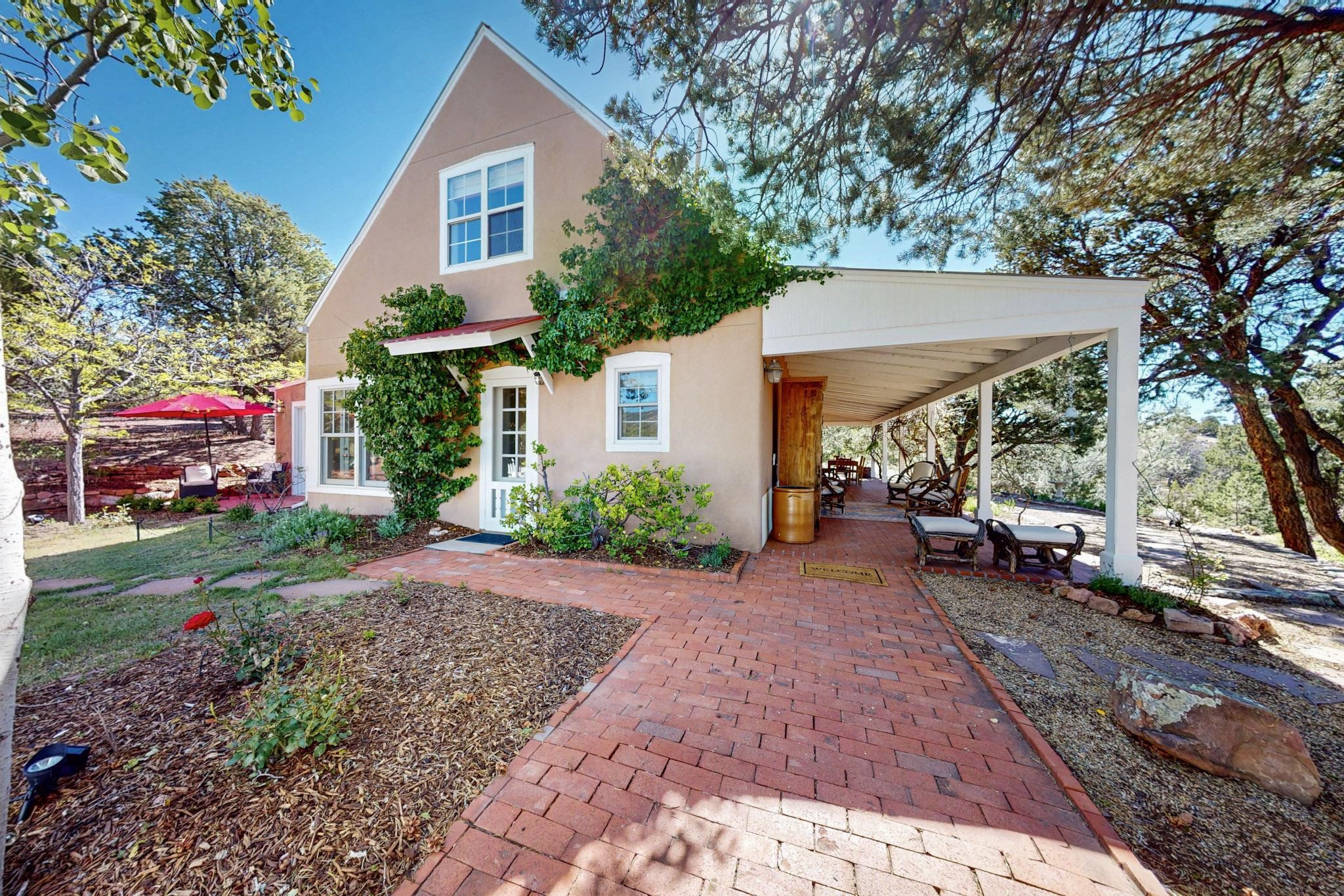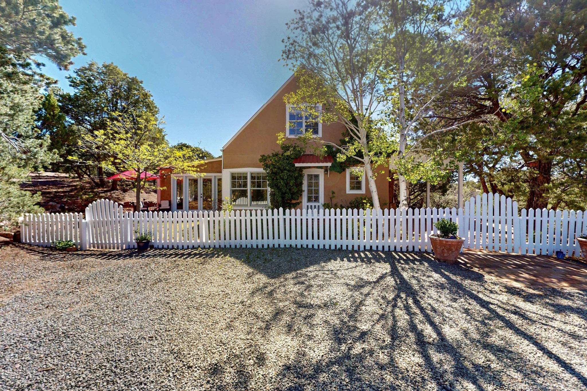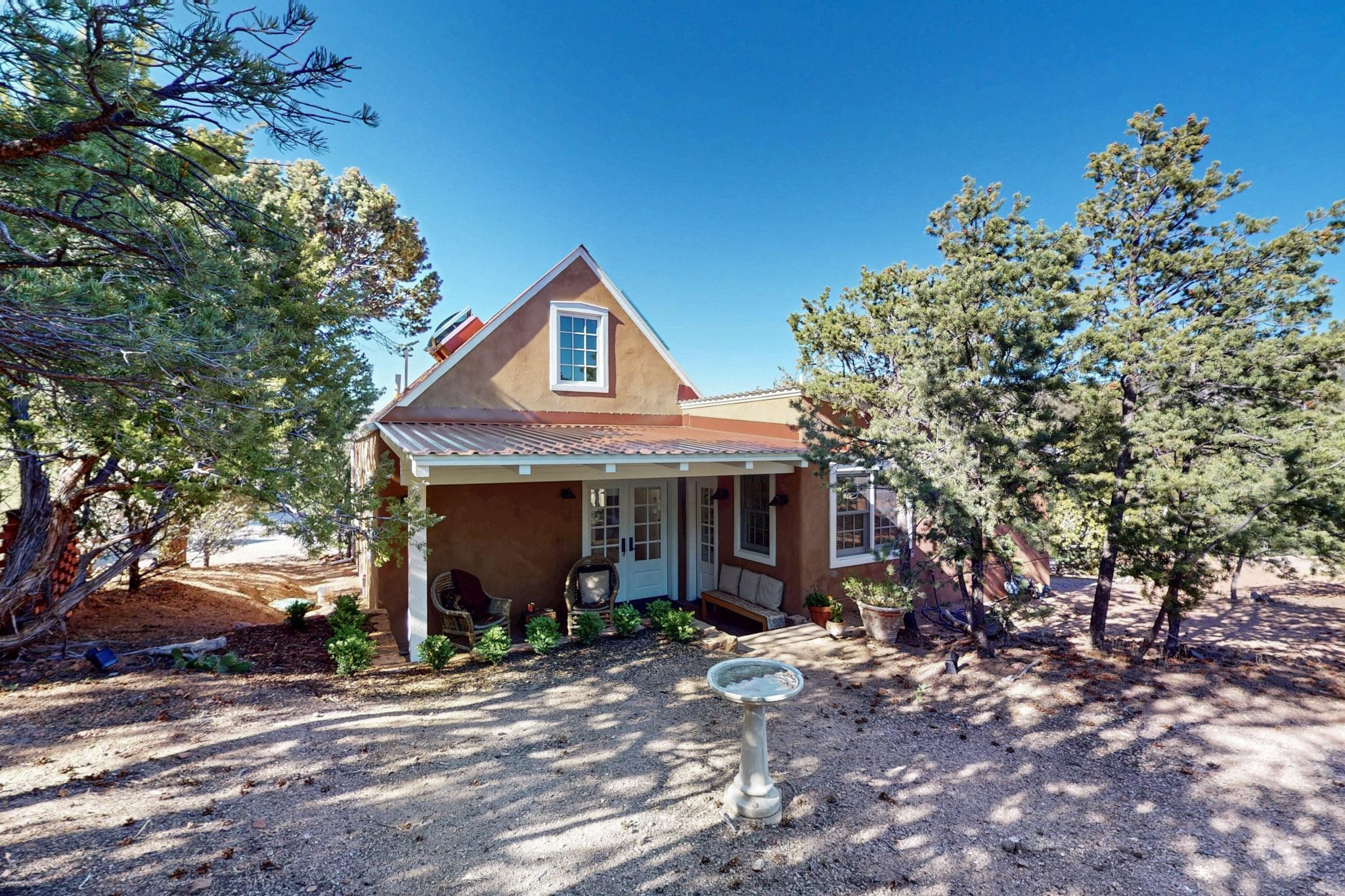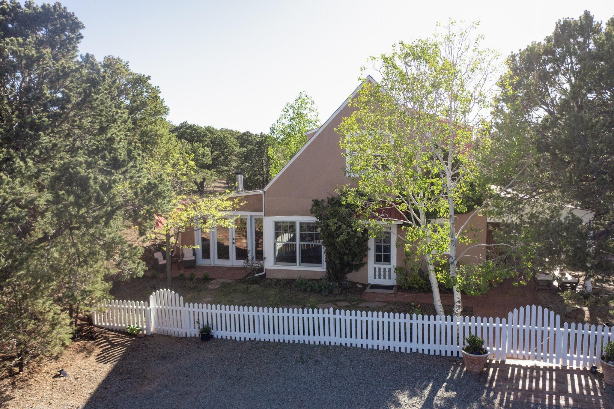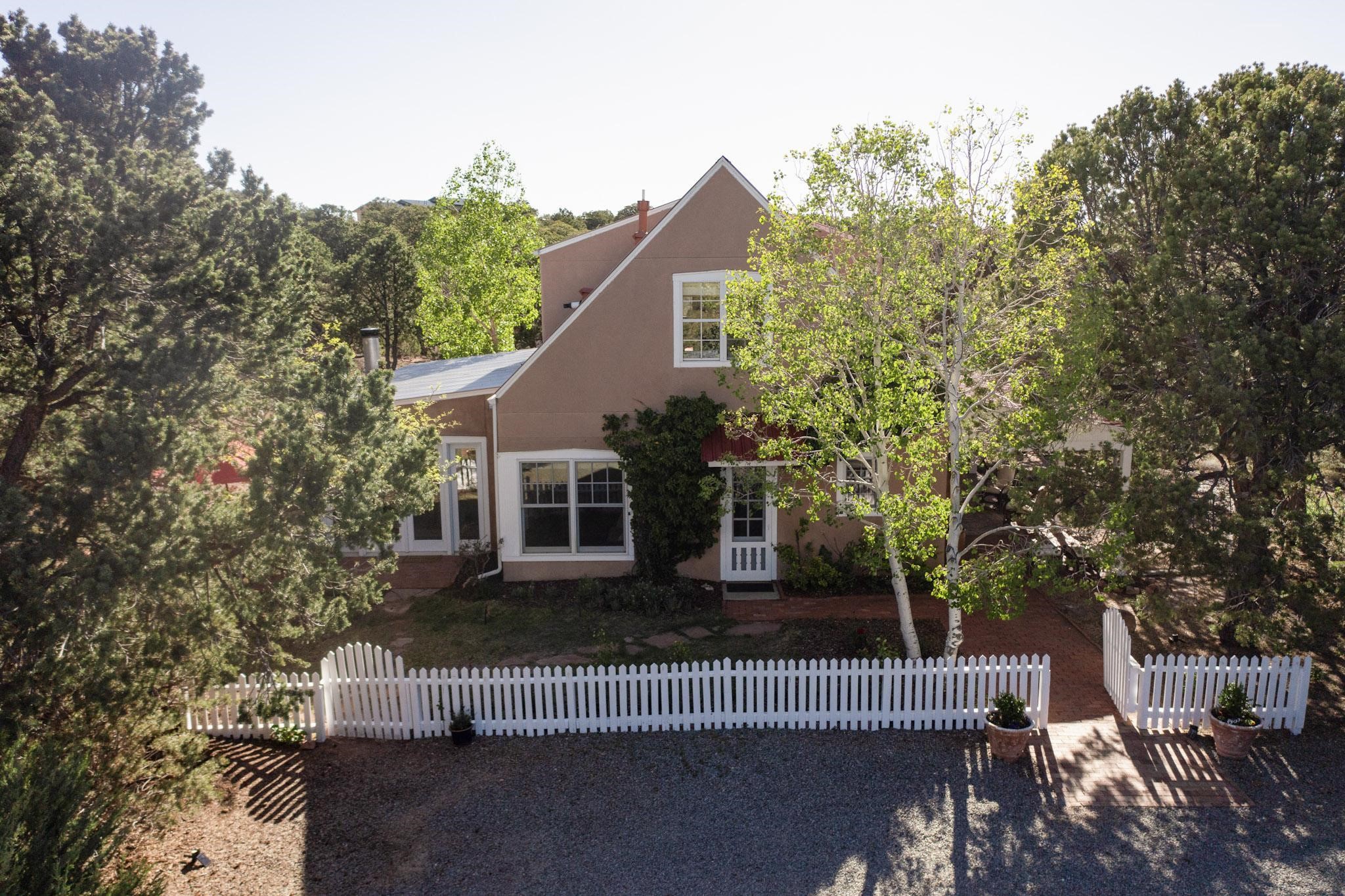 Romantic, Northern New Mexico style country compound nestled among the trees on the eastern flank of the Hondo Hills, on 7.4 acres only a few minutes drive to 3 sports clubs (including golf at Quail Run) and Santa Fe itself. With a nod to Betty Stewart, this pretty home, built by a structural engineer in 1987, has been extensively remodeled and expanded by the current architect owner to create this charming, peaceful haven. The main house construction uses Structural Insulated Panels (SIPs) making for a well insulated home, warm in winter and cool in summer. The first floor, with ample natural light from French doors and the many windows, flows serenely between the open plan kitchen/living/dining, a sunny office nook, a TV den and down the hallway to the chic primary suite with outside access to a shady brick patio. Upstairs beneath the tall pitched ceilings is a large office/occasional 3rd bedroom on one side and a large guest suite the other with a light filled sitting area between. A 10 ft wide portal spans the length of the house for outdoor enjoyment of the natural pinon woodland and views to the Jemez mountains to the NW, and north and east to the nearby foothills and rocky hilltops above the Old Santa Fe Trail. The nearby full guest house off the circular driveway, created in 2021, is a little gem entered through French doors to a delightful and cozy living room with a separate gourmet kitchen, a sunny dining room/studio (potential additional bedroom) and upstairs to the bedroom suite. This charming compound is completed by the new pitched roof studio hidden in the trees a short stroll from the main house. Gardeners will love the cottage garden in front of the main house and a fenced vegetable garden out back. Such a sweet home!
