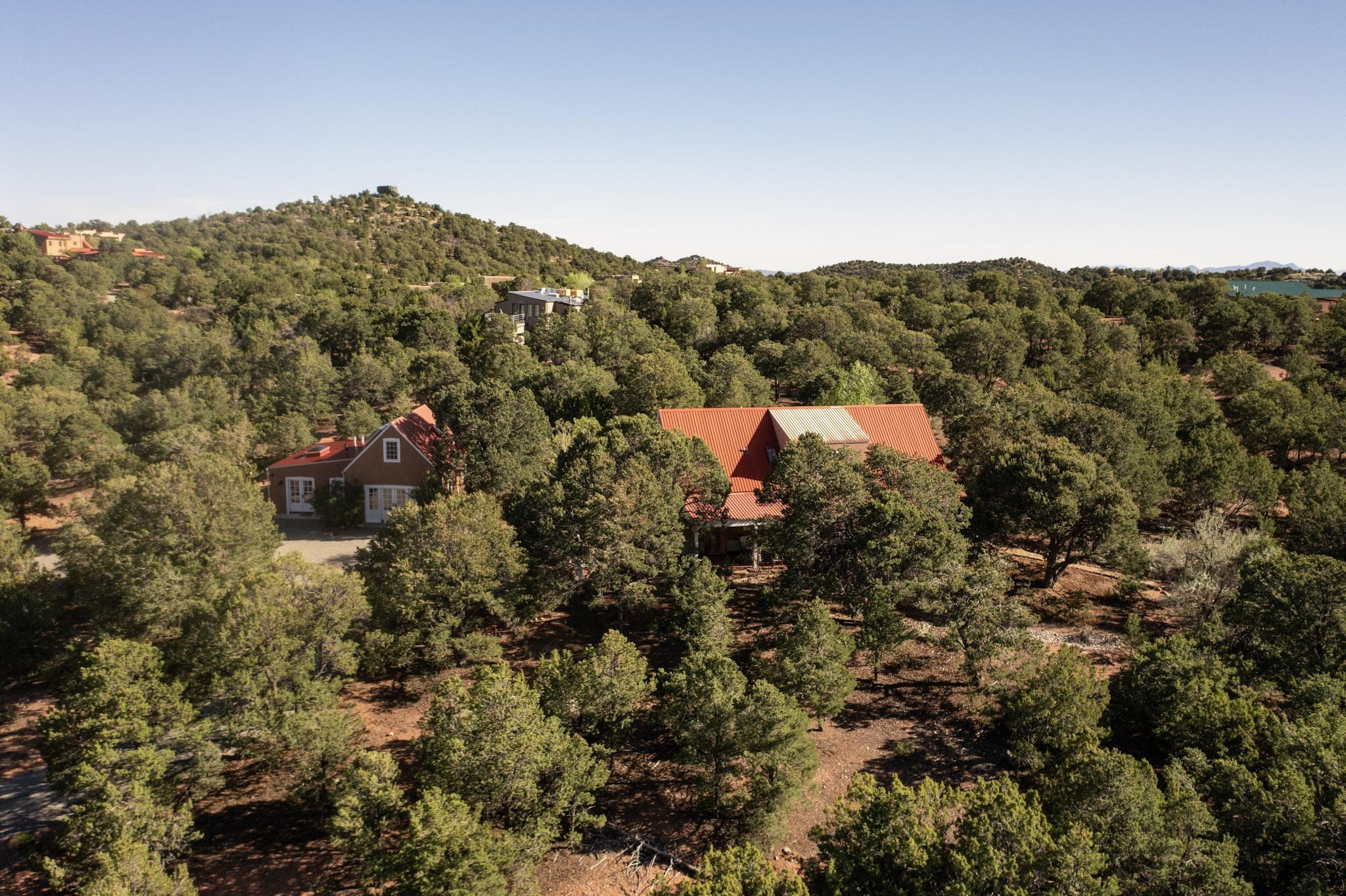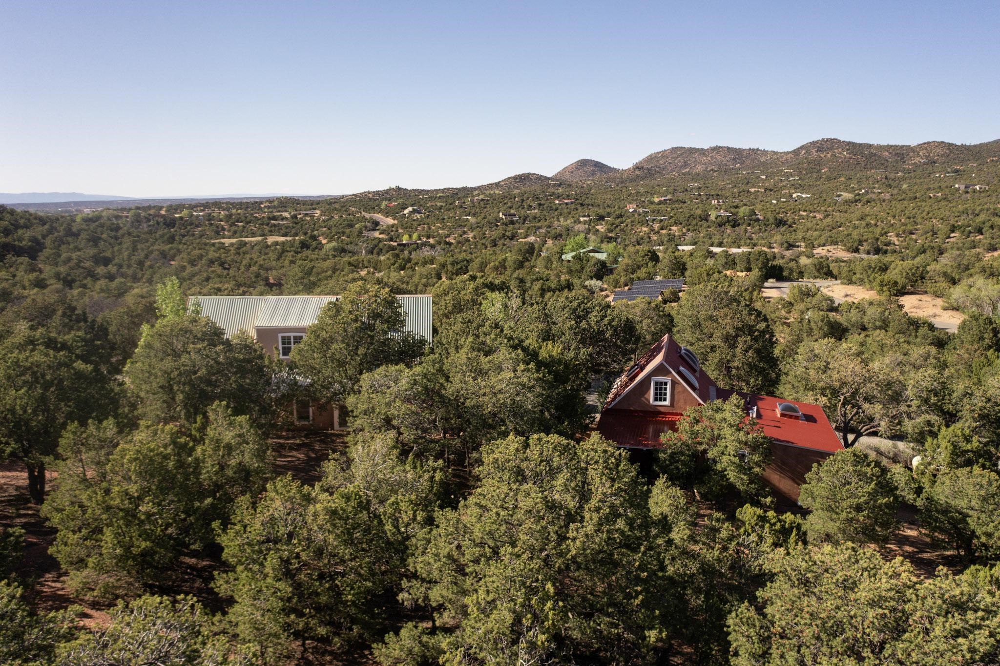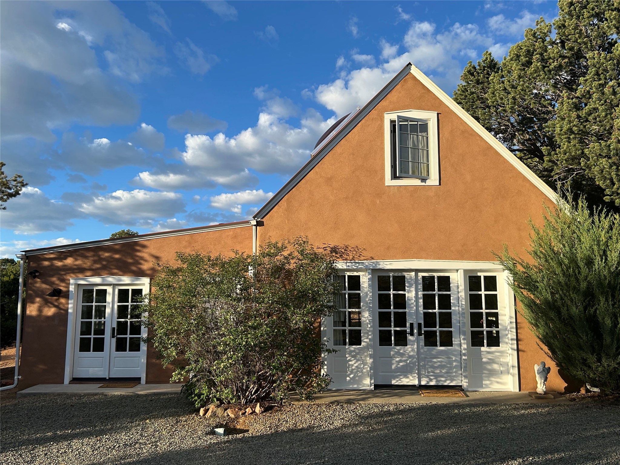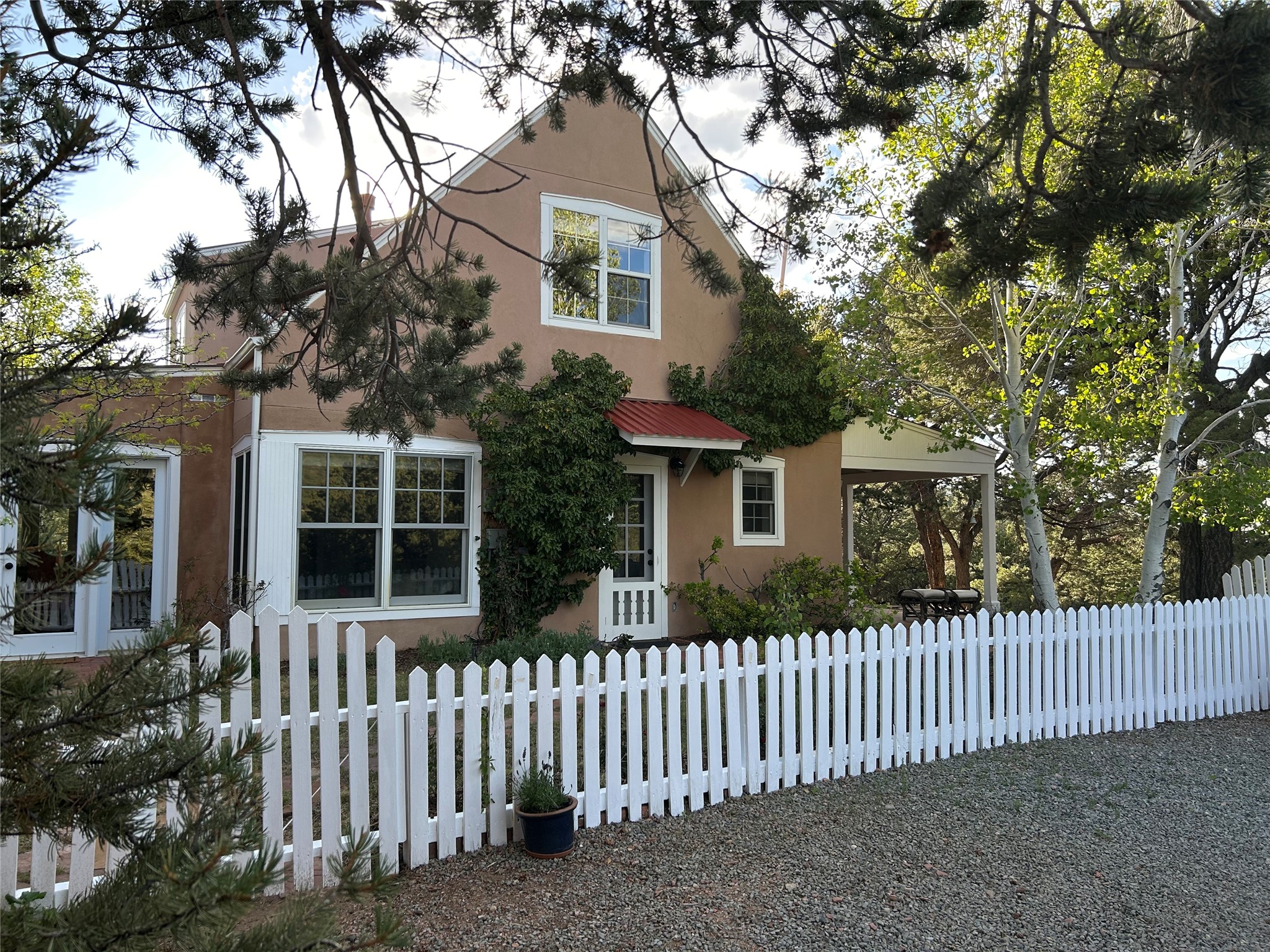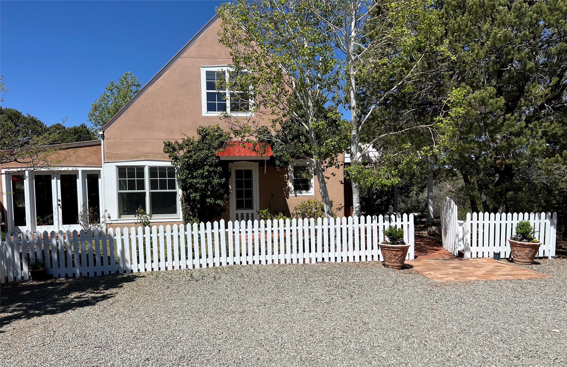 Romantic, Northern New Mexico style country compound nestled among the trees on the eastern flank of the Hondo Hills, on 7.4 acres only a few minutes drive to 3 sports clubs (including golf at Quail Run) and Santa Fe itself. With a nod to Betty Stewart, this pretty home, built by a structural engineer in 1987, has been extensively remodeled and expanded by the current architect owner to create this charming, peaceful haven. The main house construction uses Structural Insulated Panels (SIPs) making for a well insulated home, warm in winter and cool in summer. The first floor, with ample natural light from French doors and the many windows, flows serenely between the open plan kitchen/living/dining, a sunny office nook, a TV den and down the hallway to the chic primary suite with outside access to a shady brick patio. Upstairs beneath the tall pitched ceilings is a large office/occasional 3rd bedroom on one side and a large guest suite the other with a light filled sitting area between. A 10 ft wide portal spans the length of the house for outdoor enjoyment of the natural pinon woodland and views to the Jemez mountains to the NW, and north and east to the nearby foothills and rocky hilltops above the Old Santa Fe Trail. The nearby full guest house off the circular driveway, created in 2021, is a little gem entered through French doors to a delightful and cozy living room with a separate gourmet kitchen, a sunny dining room/studio (potential additional bedroom) and upstairs to the bedroom suite. This charming compound is completed by the new pitched roof studio hidden in the trees a short stroll from the main house. Gardeners will love the cottage garden in front of the main house and a fenced vegetable garden out back. Such a sweet home!