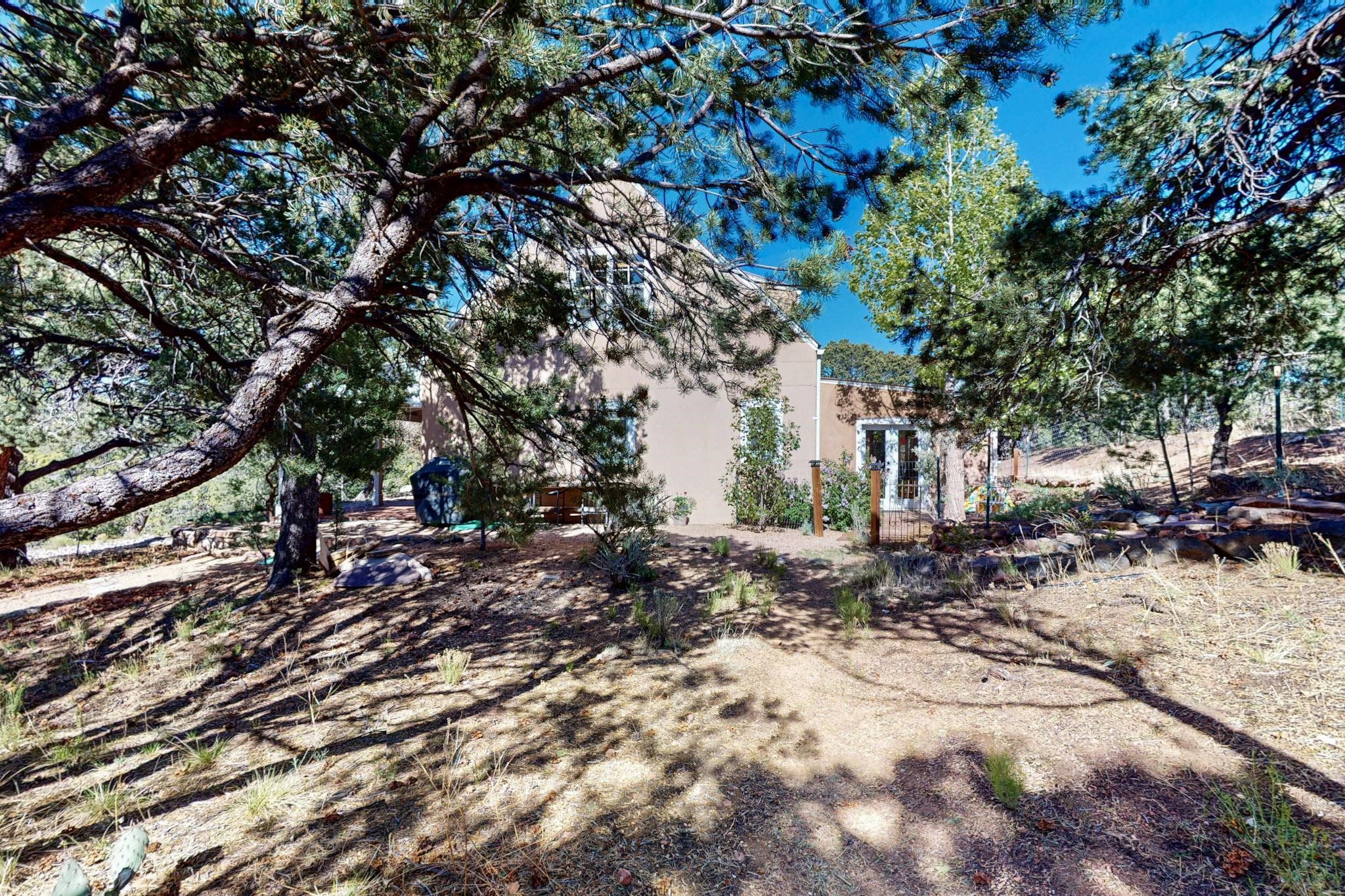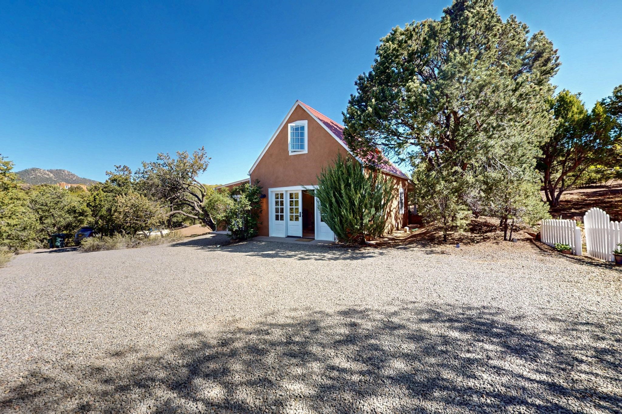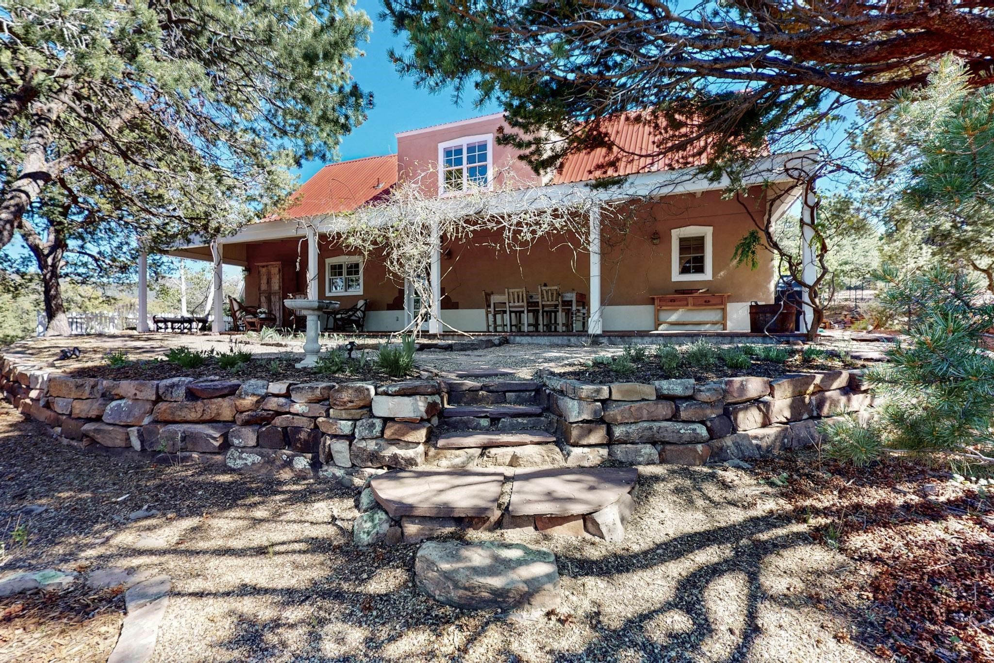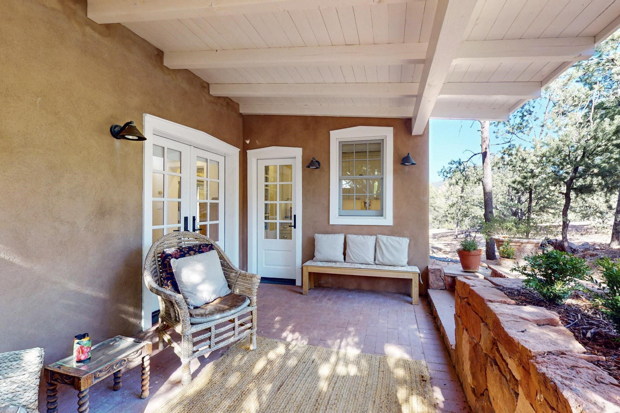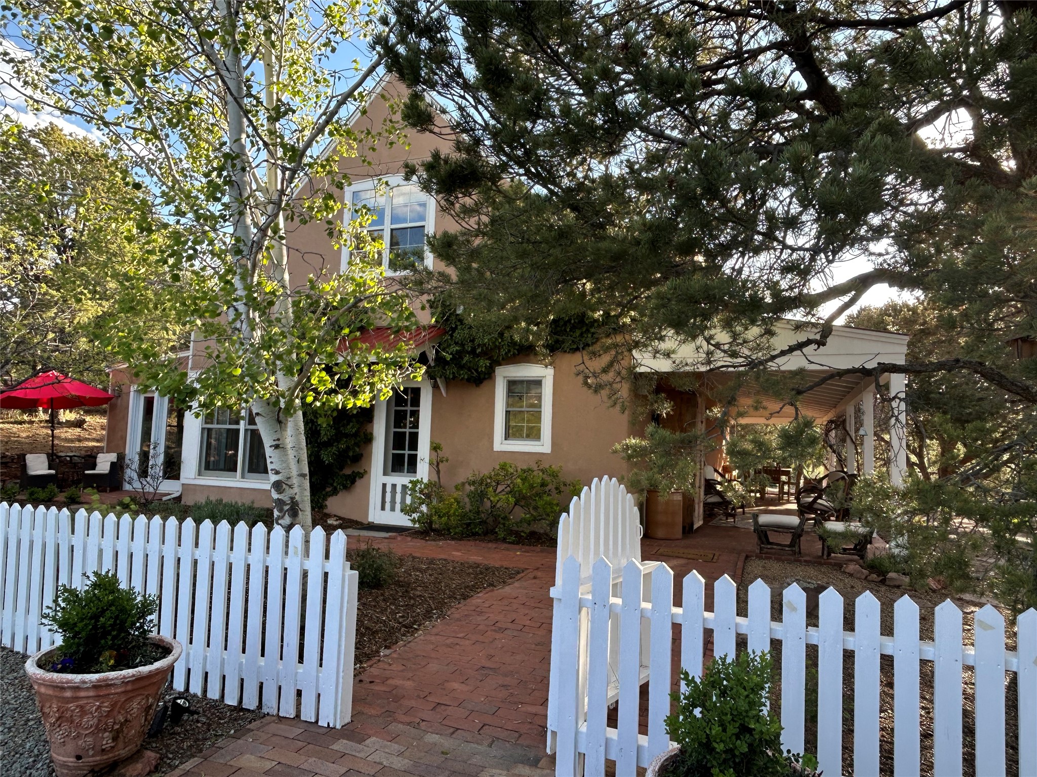 Romantic, Northern New Mexico style country compound nestled among the trees on the eastern flank of the Hondo Hills, on 7.4 acres only a few minutes drive to 3 sports clubs (including golf at Quail Run) and Santa Fe itself. With a nod to Betty Stewart, this pretty home, built by a structural engineer in 1987, has been extensively remodeled and expanded by the current architect owner to create this charming, peaceful haven. The main house construction uses Structural Insulated Panels (SIPs) making for a well insulated home, warm in winter and cool in summer. The first floor, with ample natural light from French doors and the many windows, flows serenely between the open plan kitchen/living/dining, a sunny office nook, a TV den and down the hallway to the chic primary suite with outside access to a shady brick patio. Upstairs beneath the tall pitched ceilings is a large office/occasional 3rd bedroom on one side and a large guest suite the other with a light filled sitting area between. A 10 ft wide portal spans the length of the house for outdoor enjoyment of the natural pinon woodland and views to the Jemez mountains to the NW, and north and east to the nearby foothills and rocky hilltops above the Old Santa Fe Trail. The nearby full guest house off the circular driveway, created in 2021, is a little gem entered through French doors to a delightful and cozy living room with a separate gourmet kitchen, a sunny dining room/studio (potential additional bedroom) and upstairs to the bedroom suite. This charming compound is completed by the new pitched roof studio hidden in the trees a short stroll from the main house. Gardeners will love the cottage garden in front of the main house and a fenced vegetable garden out back. Such a sweet home!