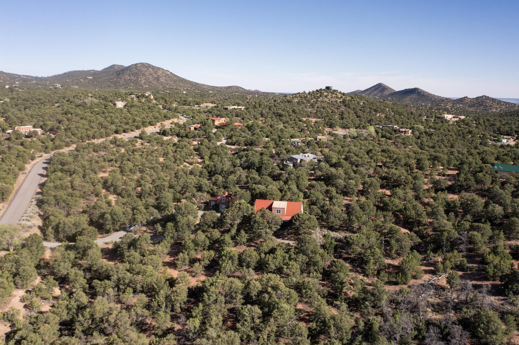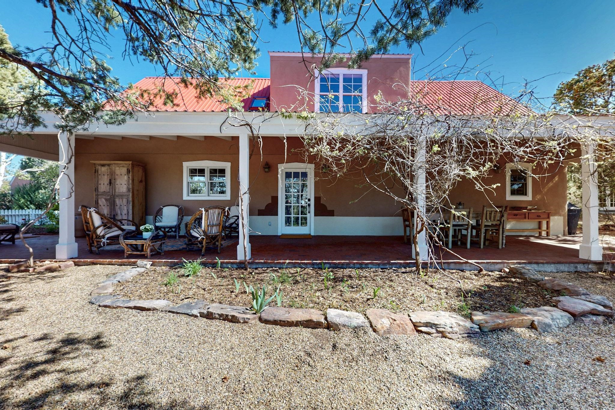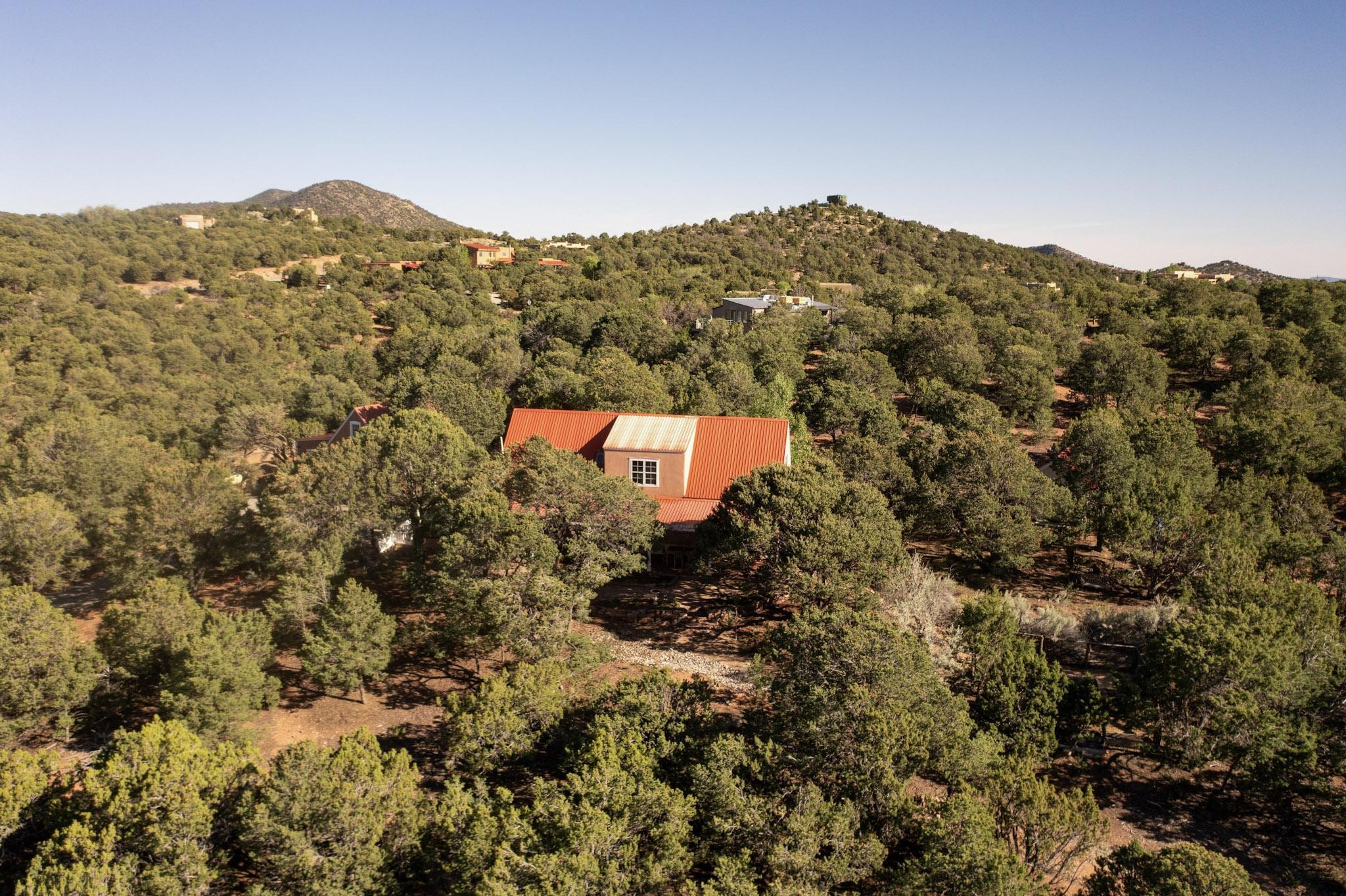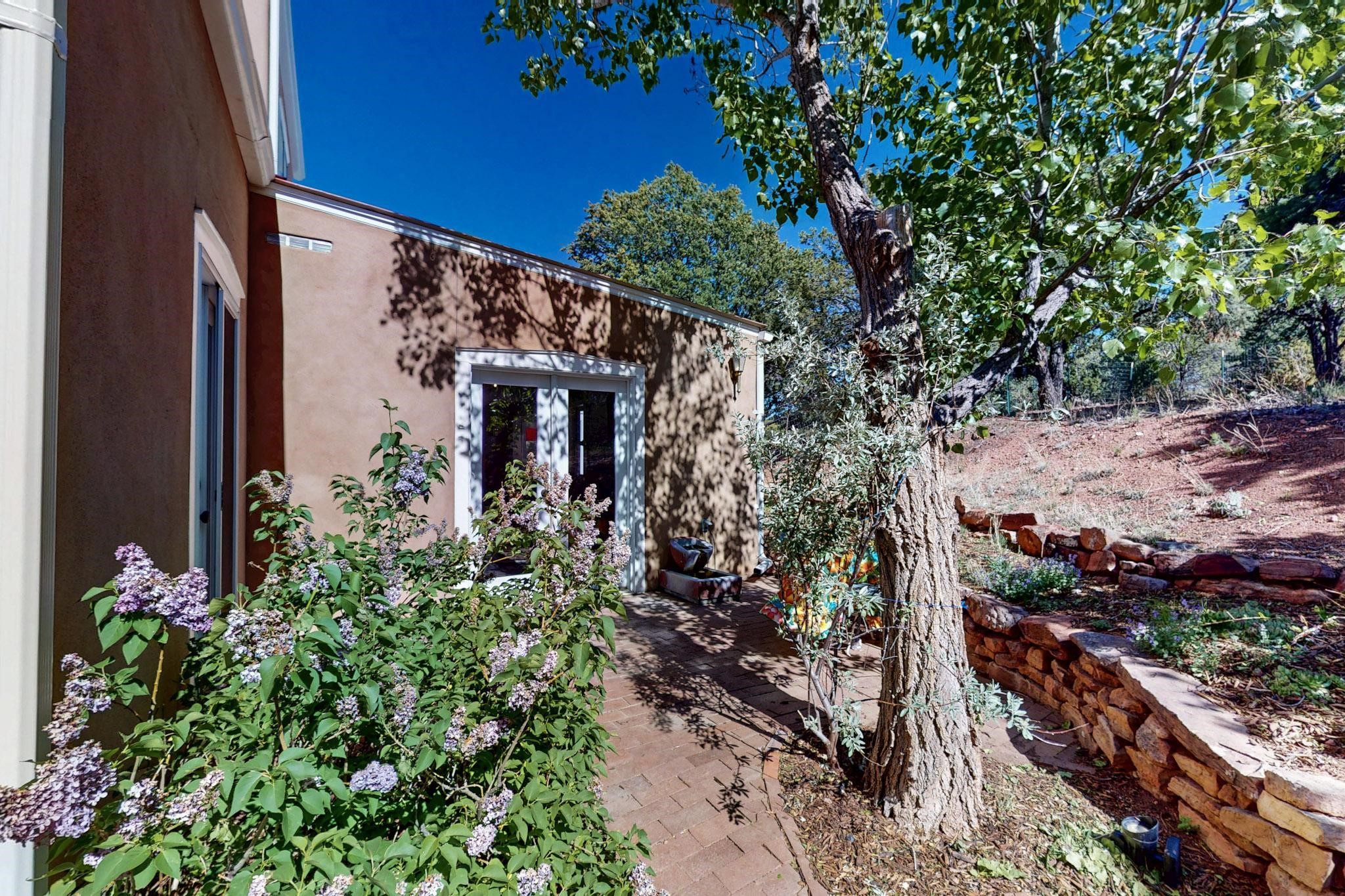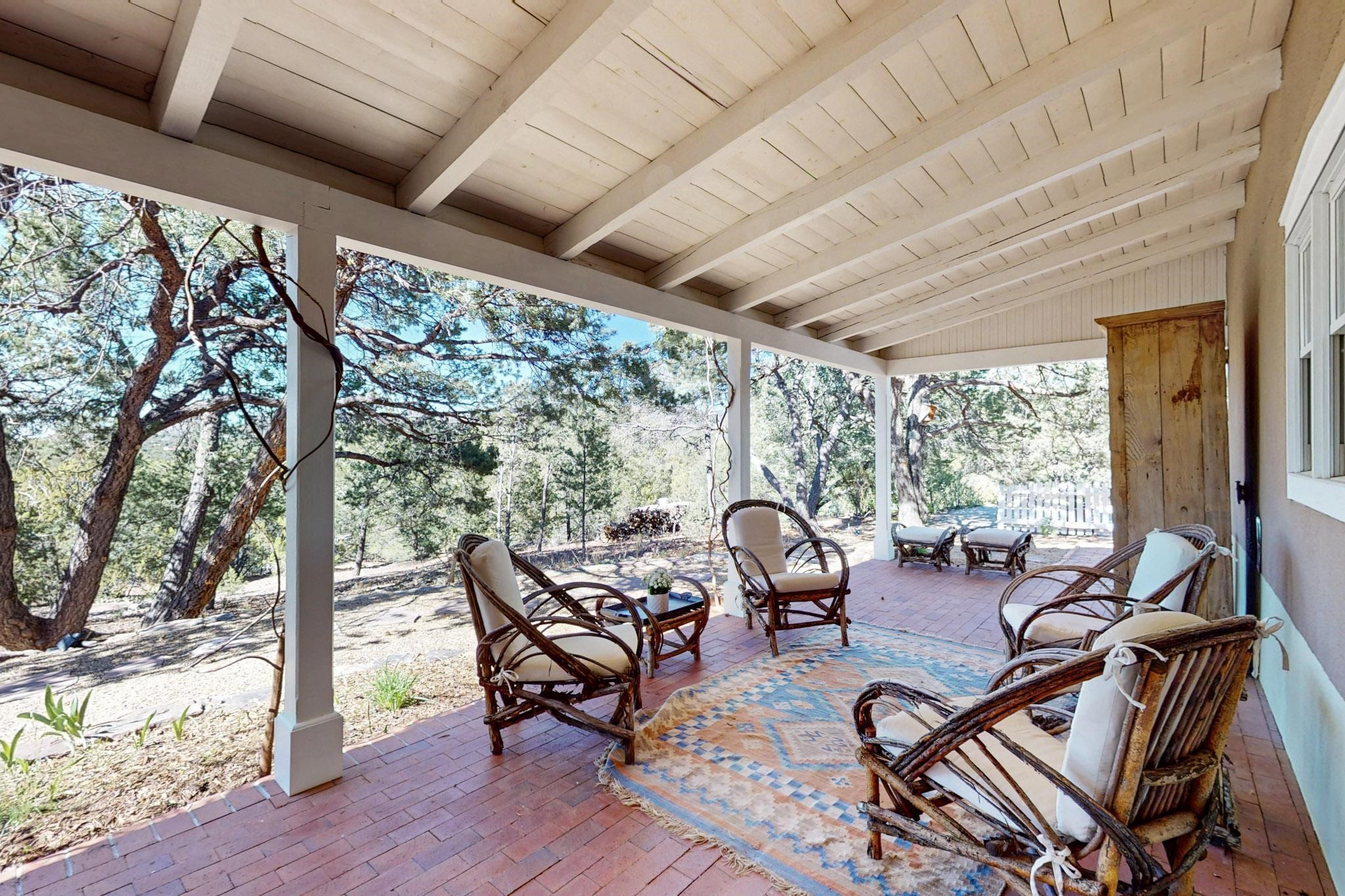 Romantic, Northern New Mexico style country compound nestled among the trees on the eastern flank of the Hondo Hills, on 7.4 acres only a few minutes drive to 3 sports clubs (including golf at Quail Run) and Santa Fe itself. With a nod to Betty Stewart, this pretty home, built by a structural engineer in 1987, has been extensively remodeled and expanded by the current architect owner to create this charming, peaceful haven. The main house construction uses Structural Insulated Panels (SIPs) making for a well insulated home, warm in winter and cool in summer. The first floor, with ample natural light from French doors and the many windows, flows serenely between the open plan kitchen/living/dining, a sunny office nook, a TV den and down the hallway to the chic primary suite with outside access to a shady brick patio. Upstairs beneath the tall pitched ceilings is a large office/occasional 3rd bedroom on one side and a large guest suite the other with a light filled sitting area between. A 10 ft wide portal spans the length of the house for outdoor enjoyment of the natural pinon woodland and views to the Jemez mountains to the NW, and north and east to the nearby foothills and rocky hilltops above the Old Santa Fe Trail. The nearby full guest house off the circular driveway, created in 2021, is a little gem entered through French doors to a delightful and cozy living room with a separate gourmet kitchen, a sunny dining room/studio (potential additional bedroom) and upstairs to the bedroom suite. This charming compound is completed by the new pitched roof studio hidden in the trees a short stroll from the main house. Gardeners will love the cottage garden in front of the main house and a fenced vegetable garden out back. Such a sweet home!