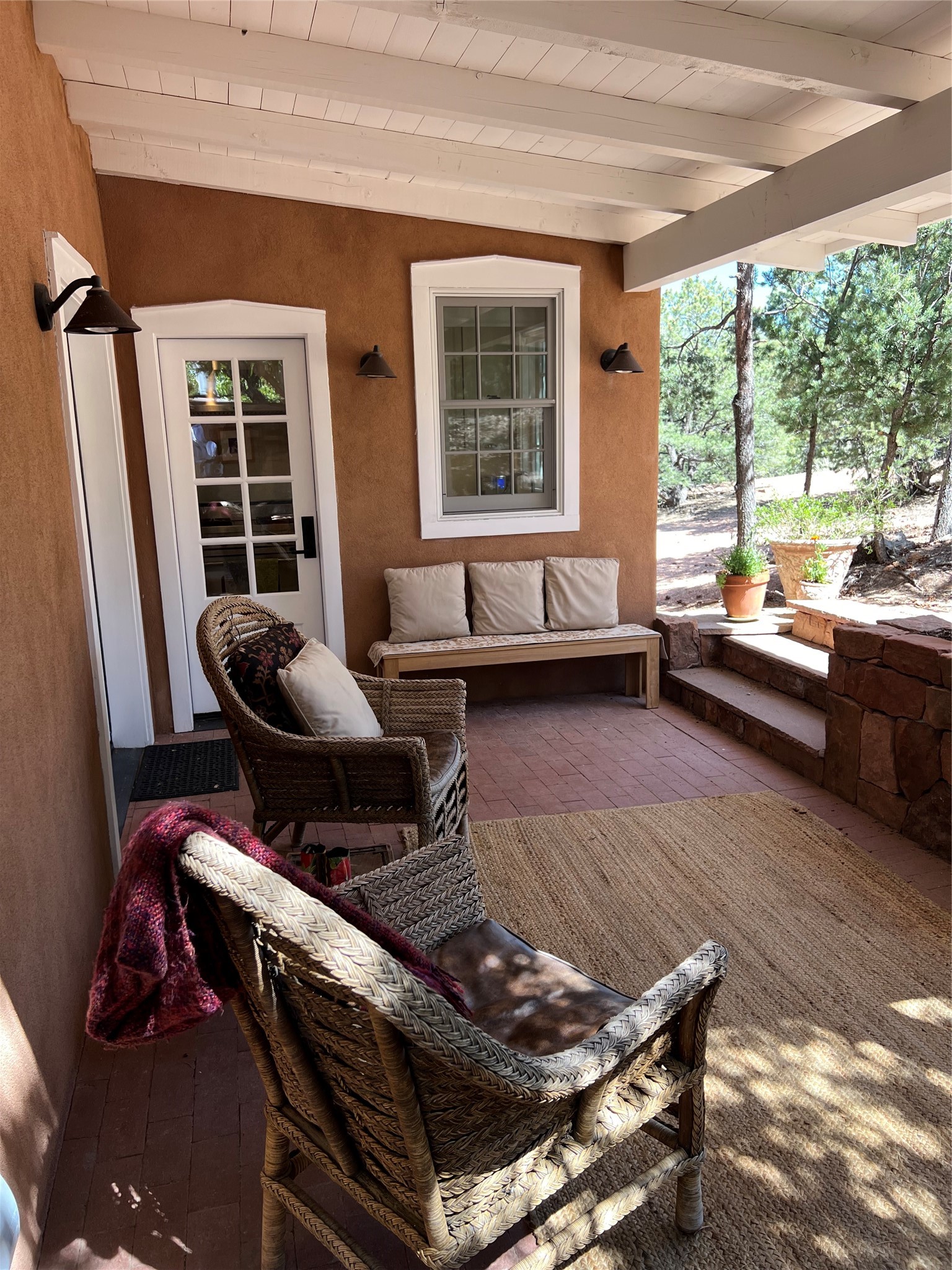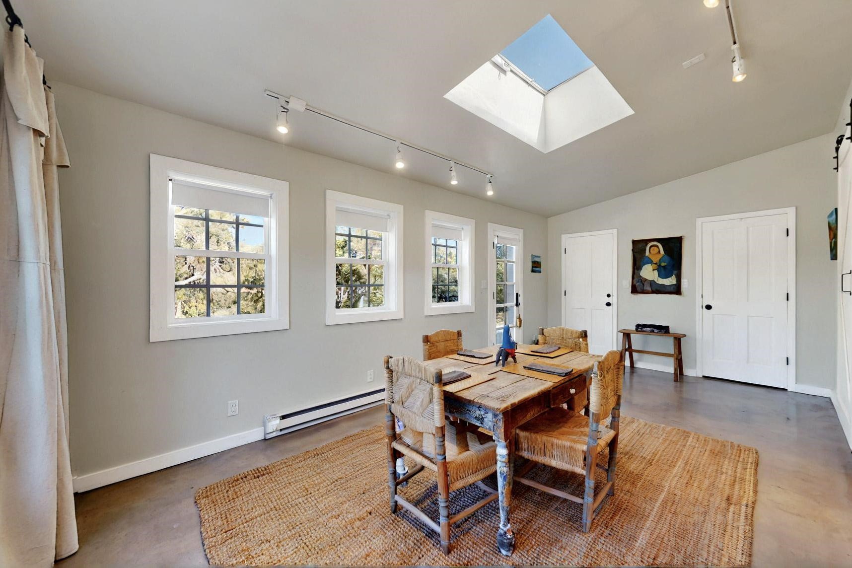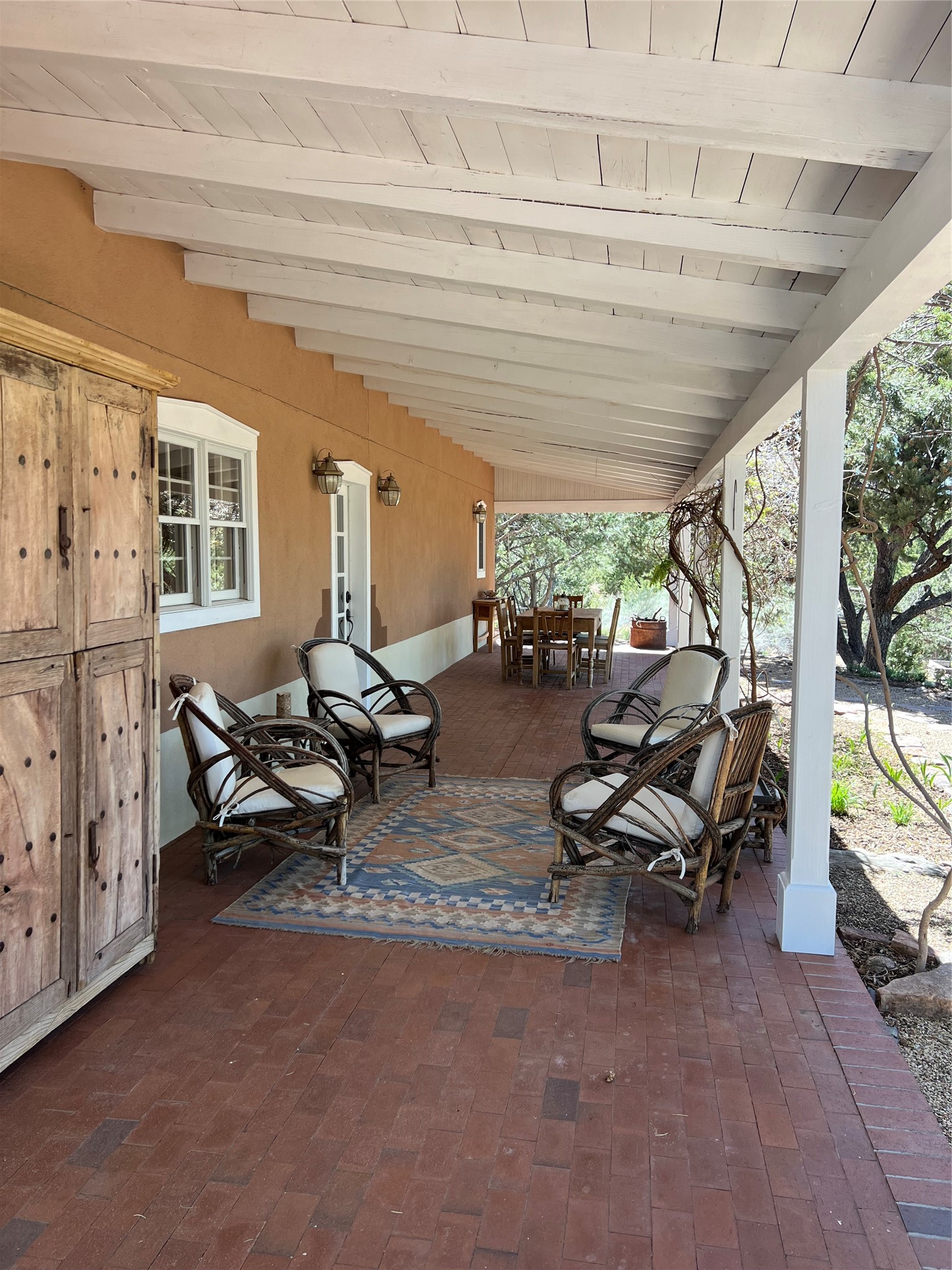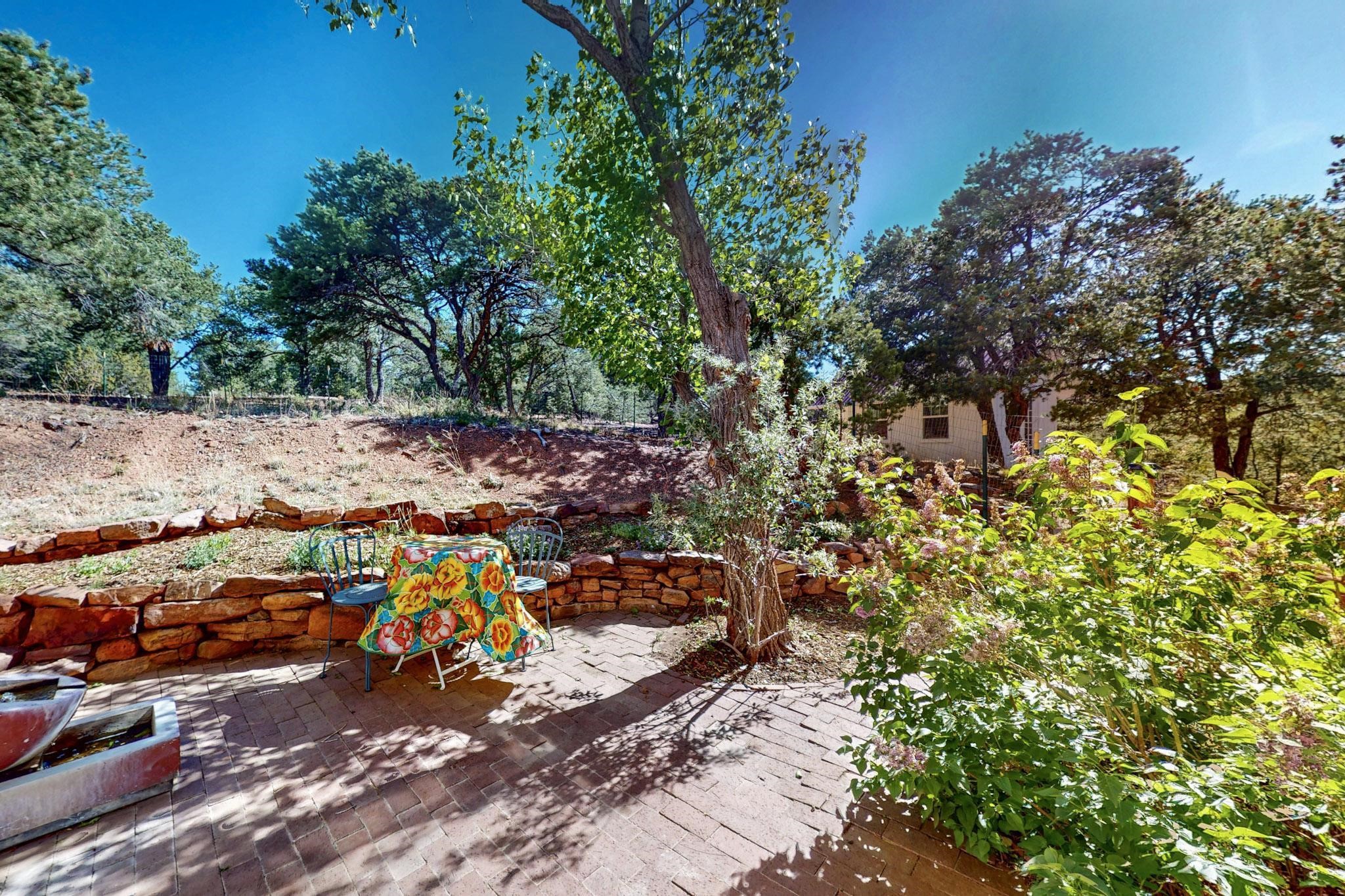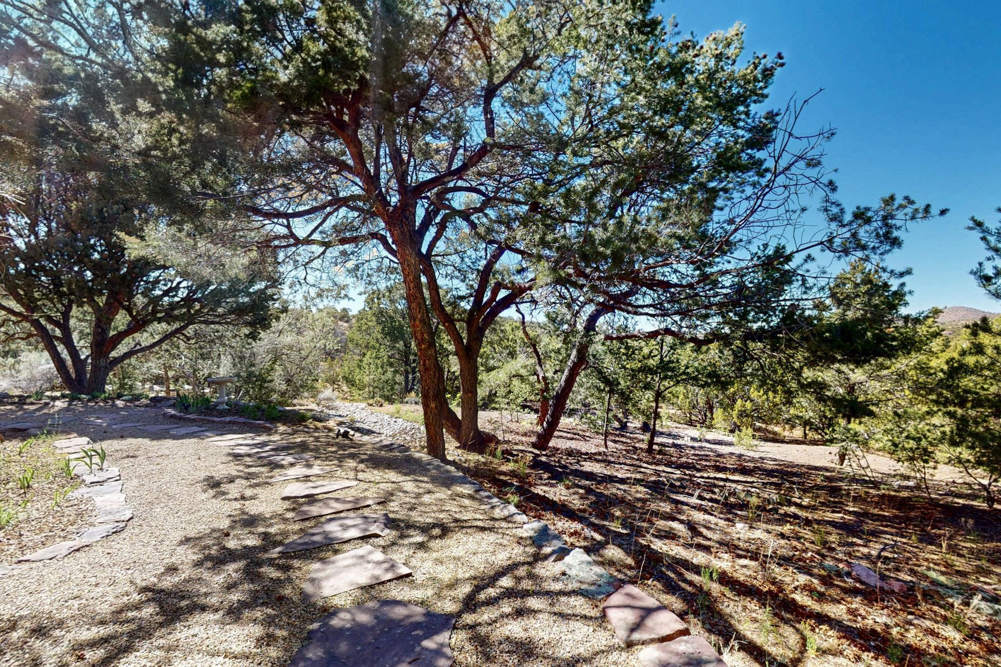 Romantic, Northern New Mexico style country compound nestled among the trees on the eastern flank of the Hondo Hills, on 7.4 acres only a few minutes drive to 3 sports clubs (including golf at Quail Run) and Santa Fe itself. With a nod to Betty Stewart, this pretty home, built by a structural engineer in 1987, has been extensively remodeled and expanded by the current architect owner to create this charming, peaceful haven. The main house construction uses Structural Insulated Panels (SIPs) making for a well insulated home, warm in winter and cool in summer. The first floor, with ample natural light from French doors and the many windows, flows serenely between the open plan kitchen/living/dining, a sunny office nook, a TV den and down the hallway to the chic primary suite with outside access to a shady brick patio. Upstairs beneath the tall pitched ceilings is a large office/occasional 3rd bedroom on one side and a large guest suite the other with a light filled sitting area between. A 10 ft wide portal spans the length of the house for outdoor enjoyment of the natural pinon woodland and views to the Jemez mountains to the NW, and north and east to the nearby foothills and rocky hilltops above the Old Santa Fe Trail. The nearby full guest house off the circular driveway, created in 2021, is a little gem entered through French doors to a delightful and cozy living room with a separate gourmet kitchen, a sunny dining room/studio (potential additional bedroom) and upstairs to the bedroom suite. This charming compound is completed by the new pitched roof studio hidden in the trees a short stroll from the main house. Gardeners will love the cottage garden in front of the main house and a fenced vegetable garden out back. Such a sweet home!