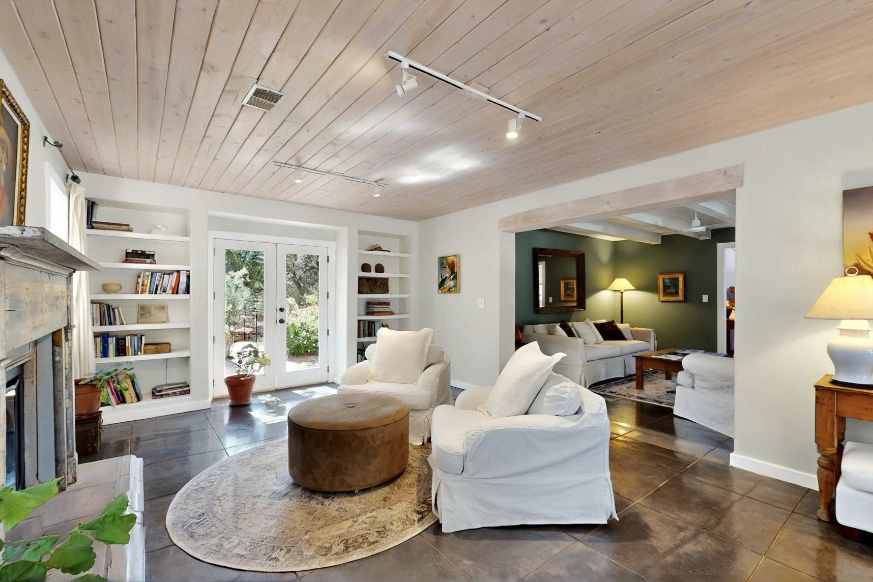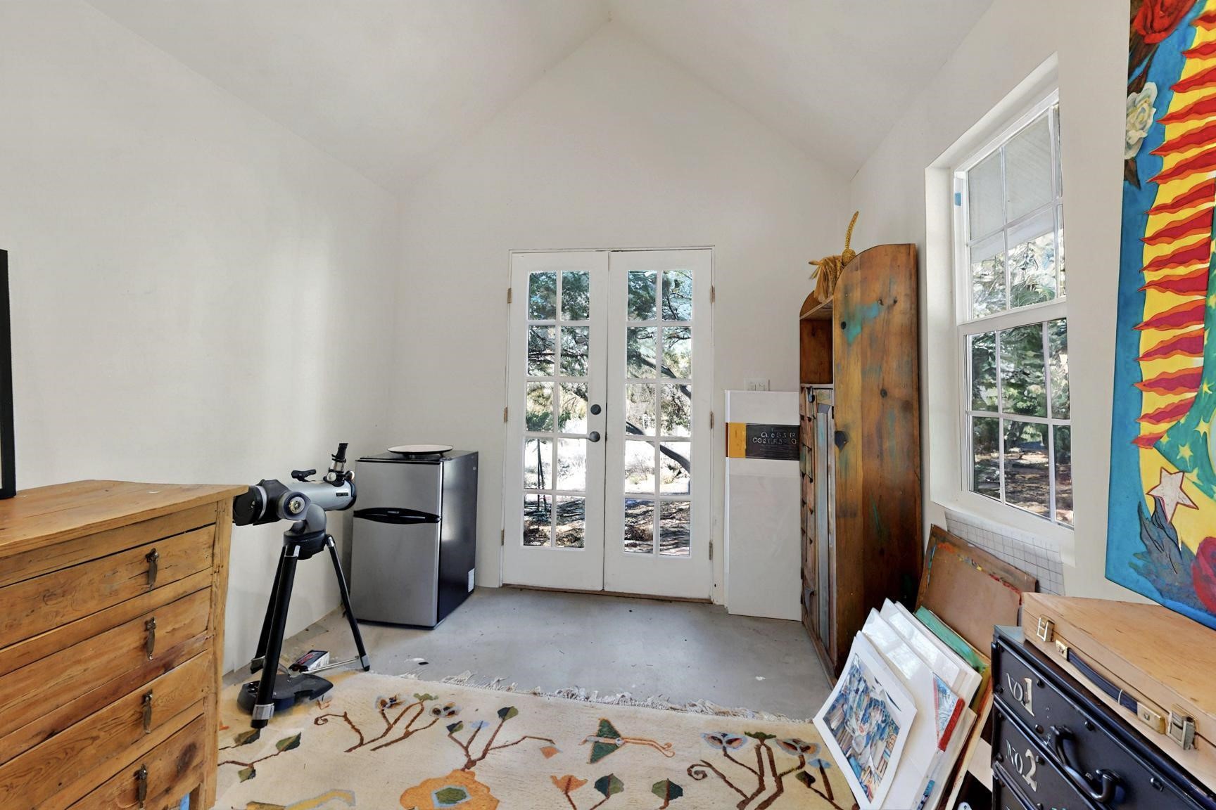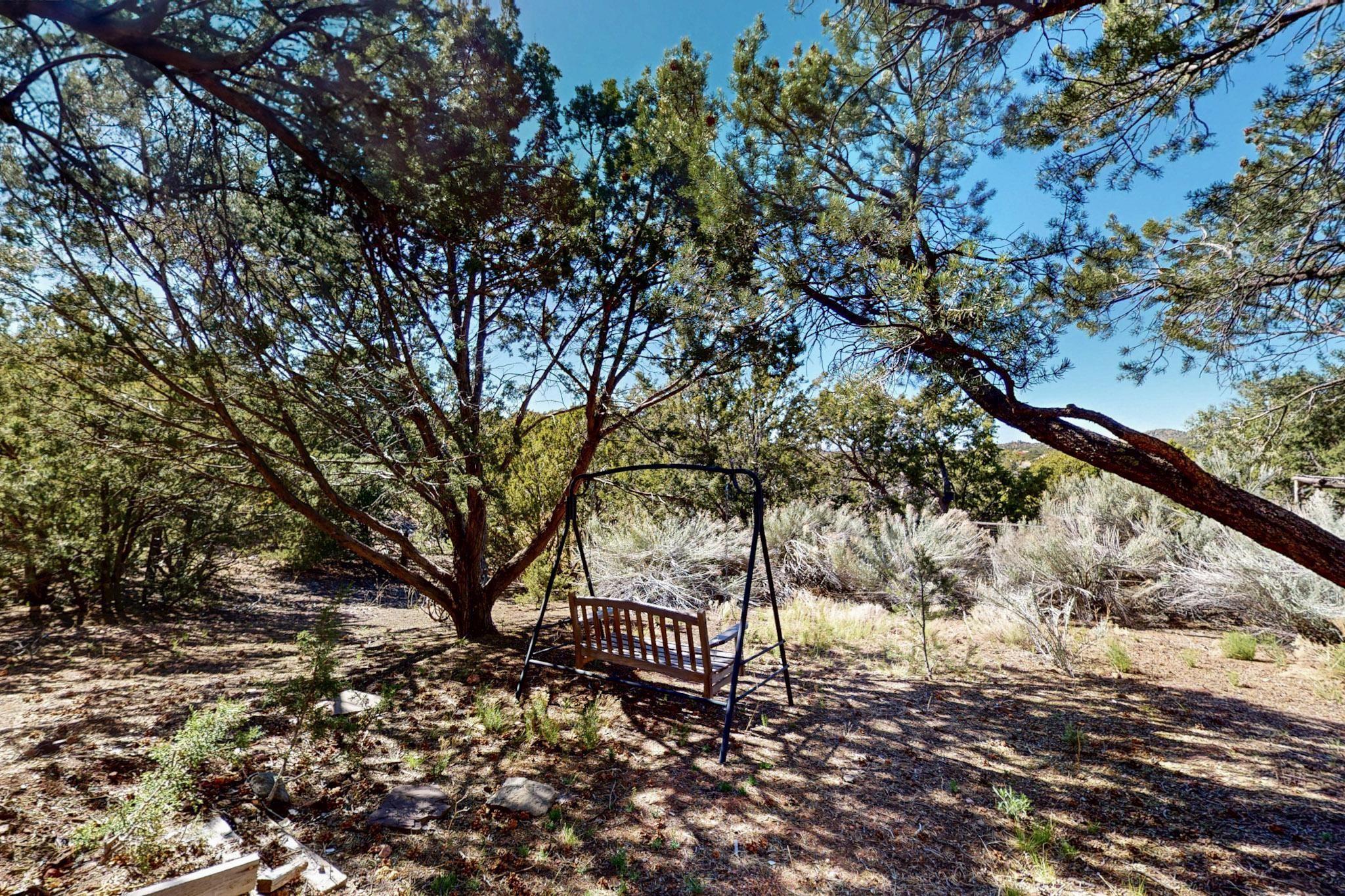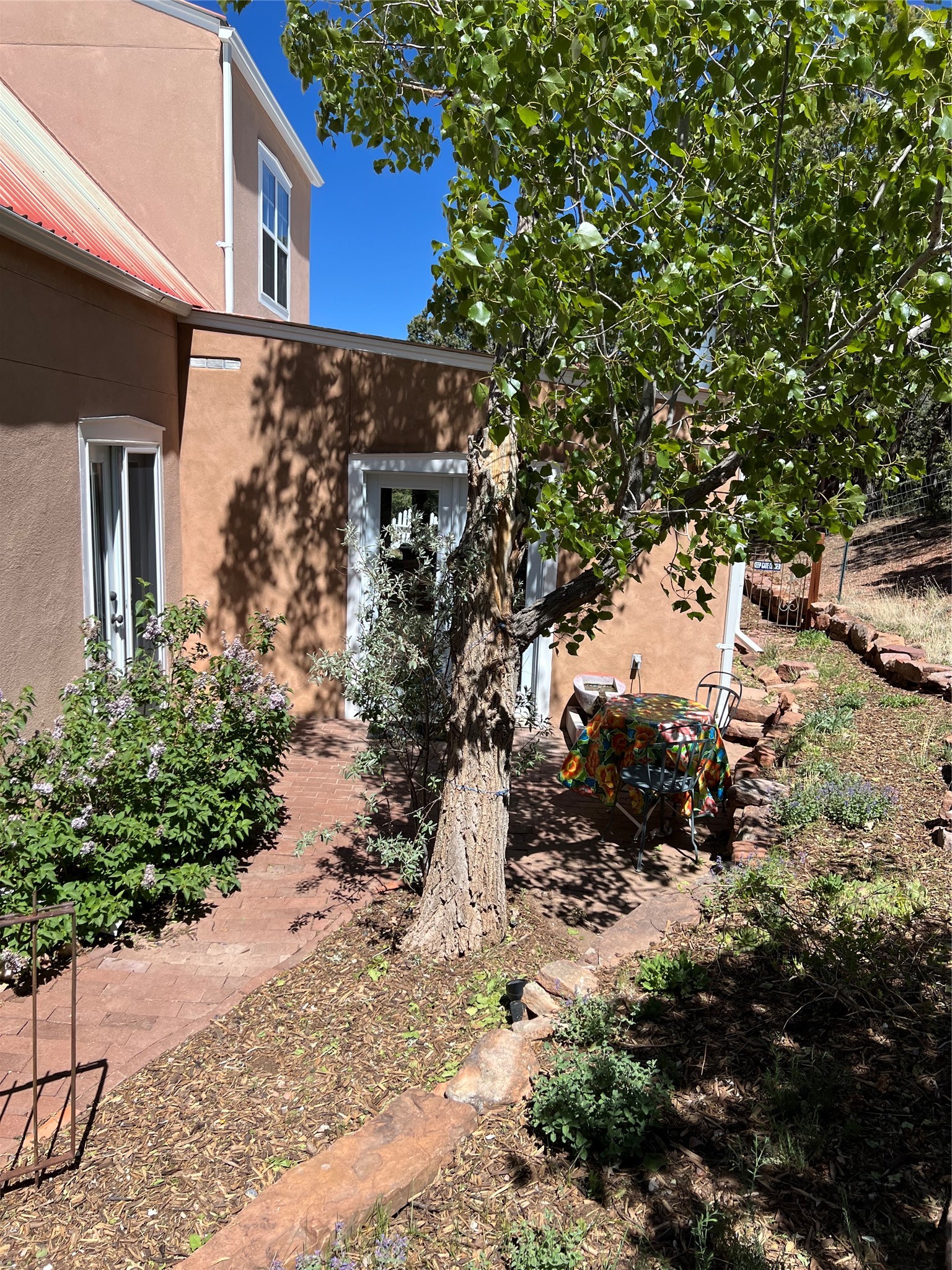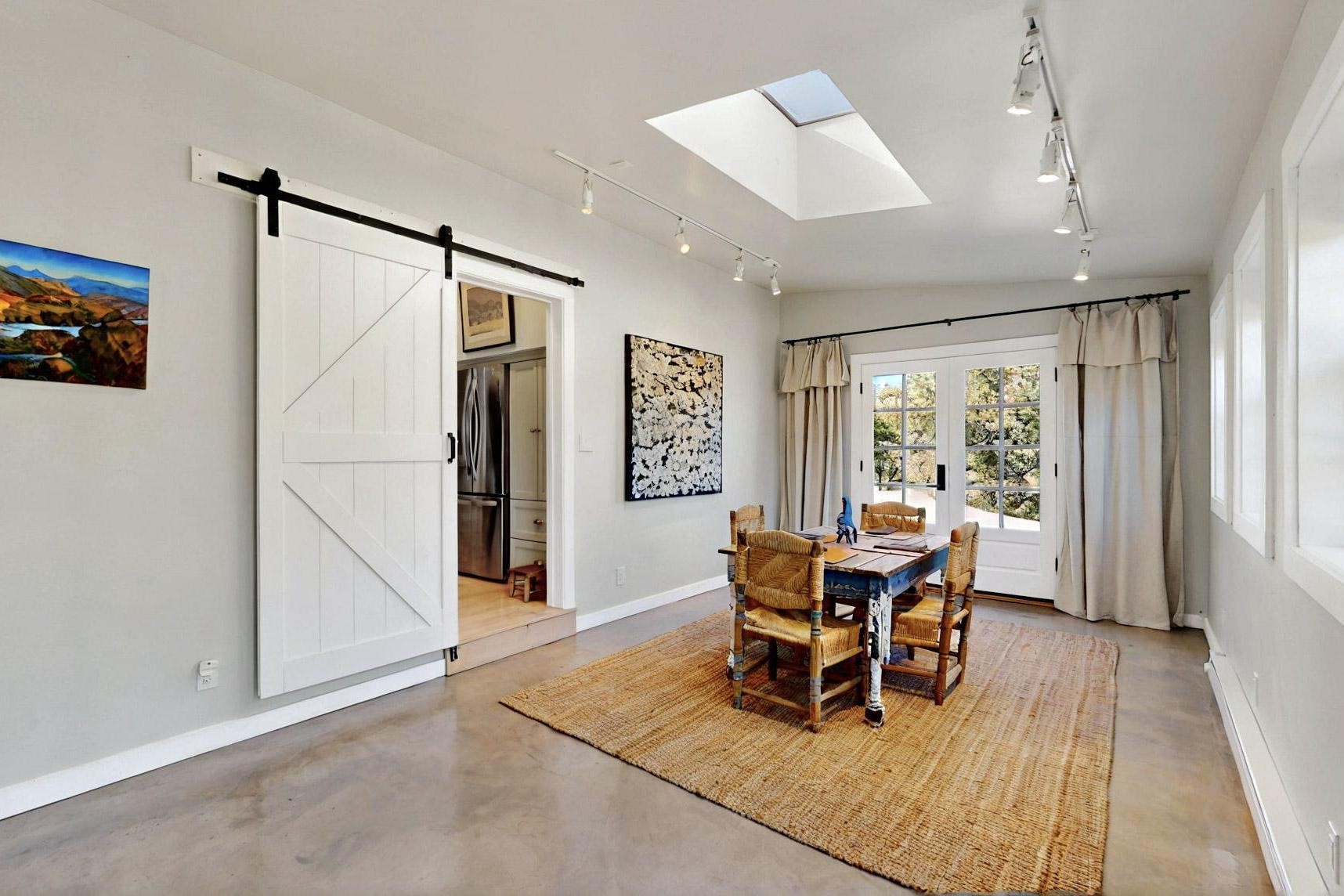 Romantic, Northern New Mexico style country compound nestled among the trees on the eastern flank of the Hondo Hills, on 7.4 acres only a few minutes drive to 3 sports clubs (including golf at Quail Run) and Santa Fe itself. With a nod to Betty Stewart, this pretty home, built by a structural engineer in 1987, has been extensively remodeled and expanded by the current architect owner to create this charming, peaceful haven. The main house construction uses Structural Insulated Panels (SIPs) making for a well insulated home, warm in winter and cool in summer. The first floor, with ample natural light from French doors and the many windows, flows serenely between the open plan kitchen/living/dining, a sunny office nook, a TV den and down the hallway to the chic primary suite with outside access to a shady brick patio. Upstairs beneath the tall pitched ceilings is a large office/occasional 3rd bedroom on one side and a large guest suite the other with a light filled sitting area between. A 10 ft wide portal spans the length of the house for outdoor enjoyment of the natural pinon woodland and views to the Jemez mountains to the NW, and north and east to the nearby foothills and rocky hilltops above the Old Santa Fe Trail. The nearby full guest house off the circular driveway, created in 2021, is a little gem entered through French doors to a delightful and cozy living room with a separate gourmet kitchen, a sunny dining room/studio (potential additional bedroom) and upstairs to the bedroom suite. This charming compound is completed by the new pitched roof studio hidden in the trees a short stroll from the main house. Gardeners will love the cottage garden in front of the main house and a fenced vegetable garden out back. Such a sweet home!