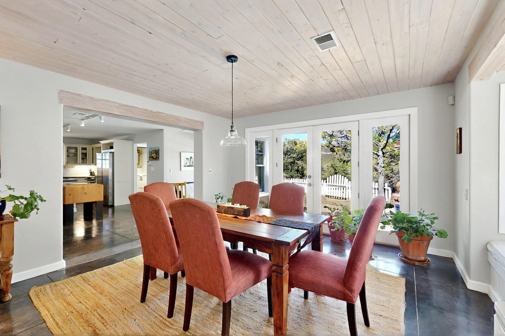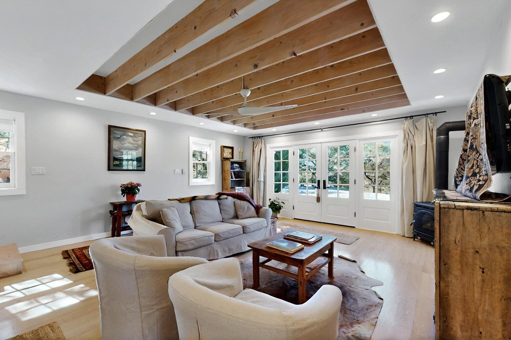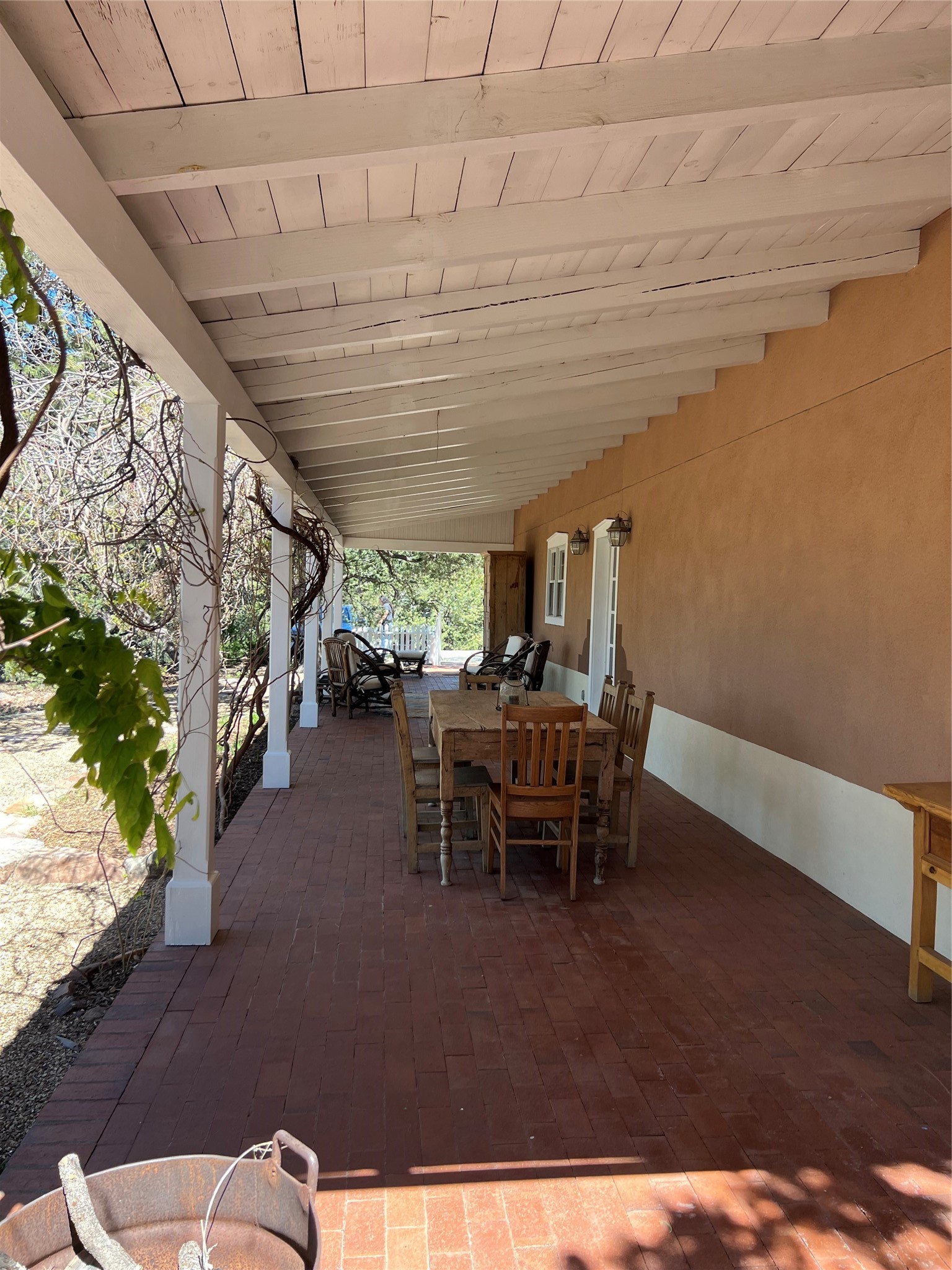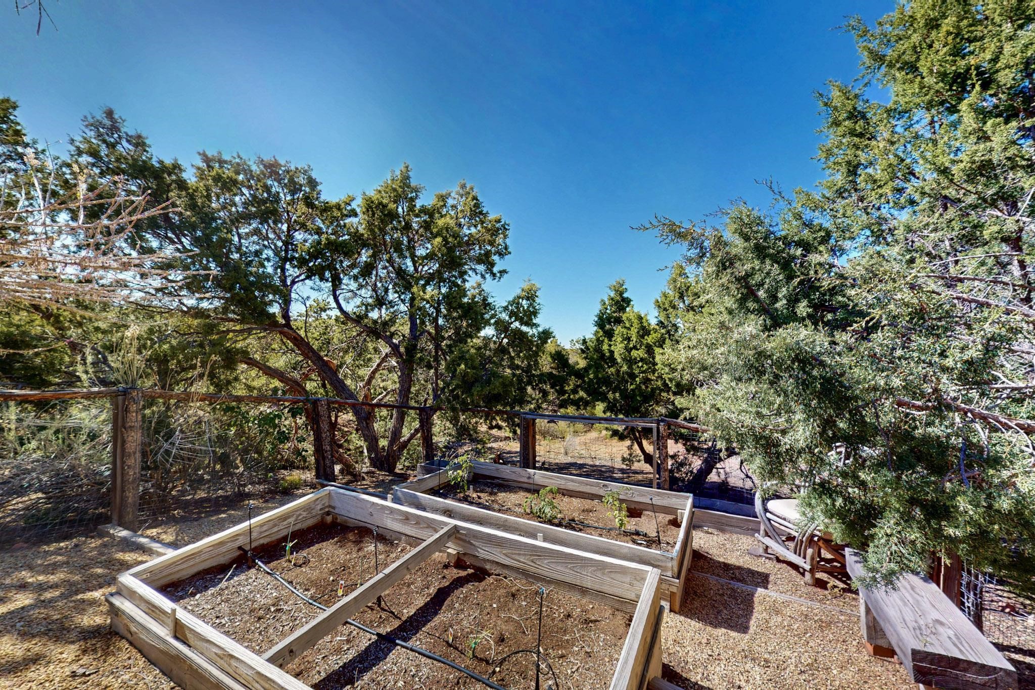 Romantic, Northern New Mexico style country compound nestled among the trees on the eastern flank of the Hondo Hills, on 7.4 acres only a few minutes drive to 3 sports clubs (including golf at Quail Run) and Santa Fe itself. With a nod to Betty Stewart, this pretty home, built by a structural engineer in 1987, has been extensively remodeled and expanded by the current architect owner to create this charming, peaceful haven. The main house construction uses Structural Insulated Panels (SIPs) making for a well insulated home, warm in winter and cool in summer. The first floor, with ample natural light from French doors and the many windows, flows serenely between the open plan kitchen/living/dining, a sunny office nook, a TV den and down the hallway to the chic primary suite with outside access to a shady brick patio. Upstairs beneath the tall pitched ceilings is a large office/occasional 3rd bedroom on one side and a large guest suite the other with a light filled sitting area between. A 10 ft wide portal spans the length of the house for outdoor enjoyment of the natural pinon woodland and views to the Jemez mountains to the NW, and north and east to the nearby foothills and rocky hilltops above the Old Santa Fe Trail. The nearby full guest house off the circular driveway, created in 2021, is a little gem entered through French doors to a delightful and cozy living room with a separate gourmet kitchen, a sunny dining room/studio (potential additional bedroom) and upstairs to the bedroom suite. This charming compound is completed by the new pitched roof studio hidden in the trees a short stroll from the main house. Gardeners will love the cottage garden in front of the main house and a fenced vegetable garden out back. Such a sweet home!