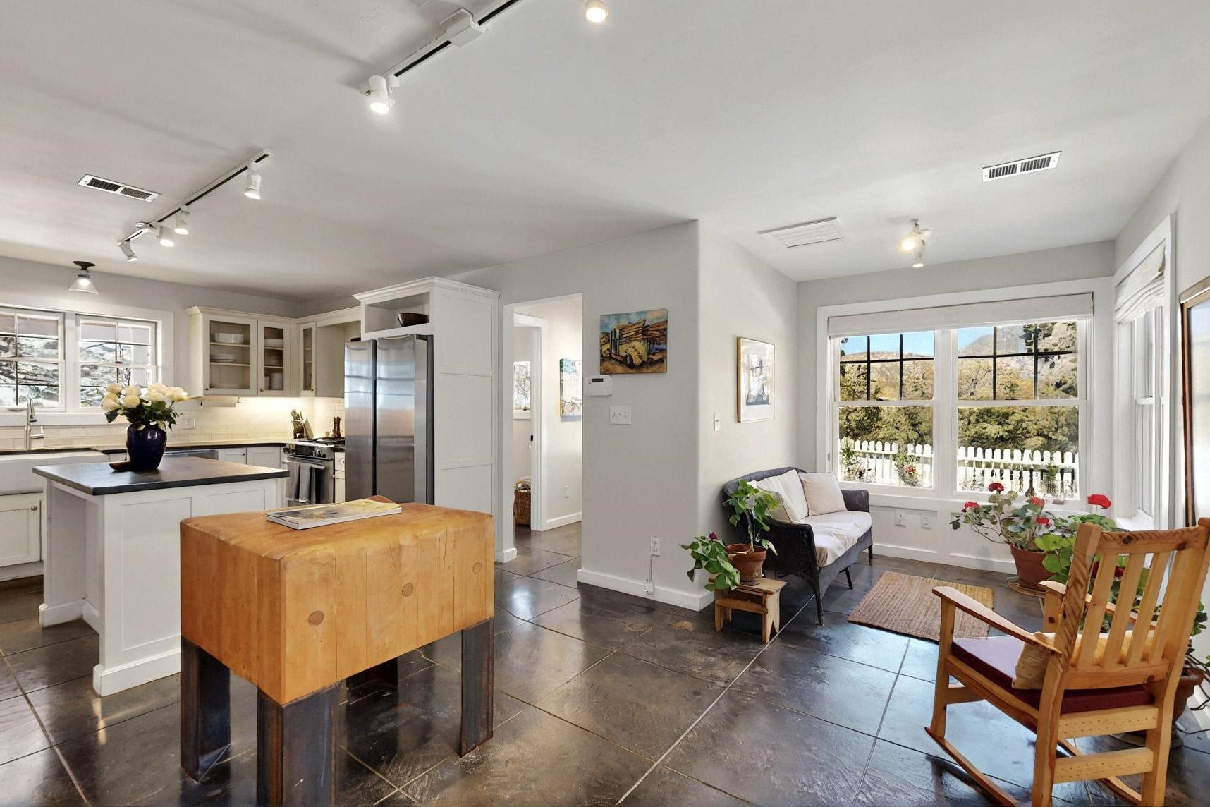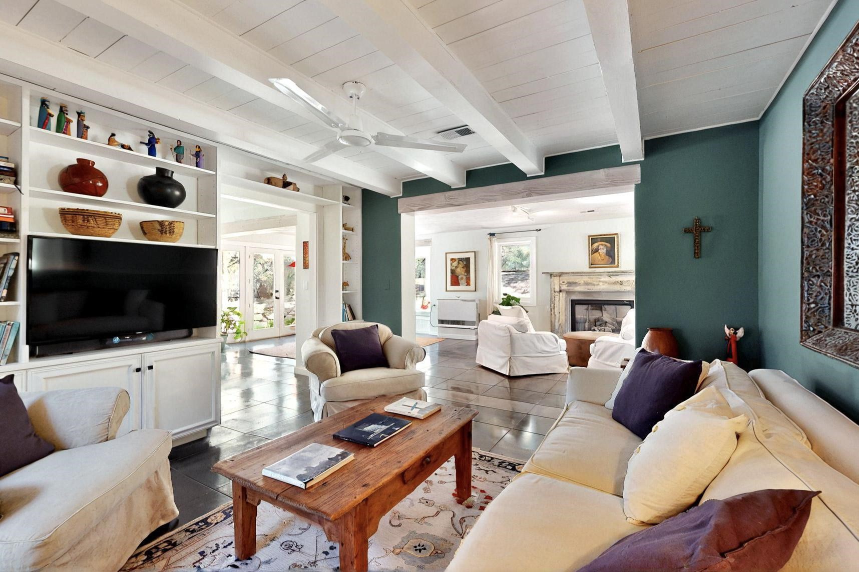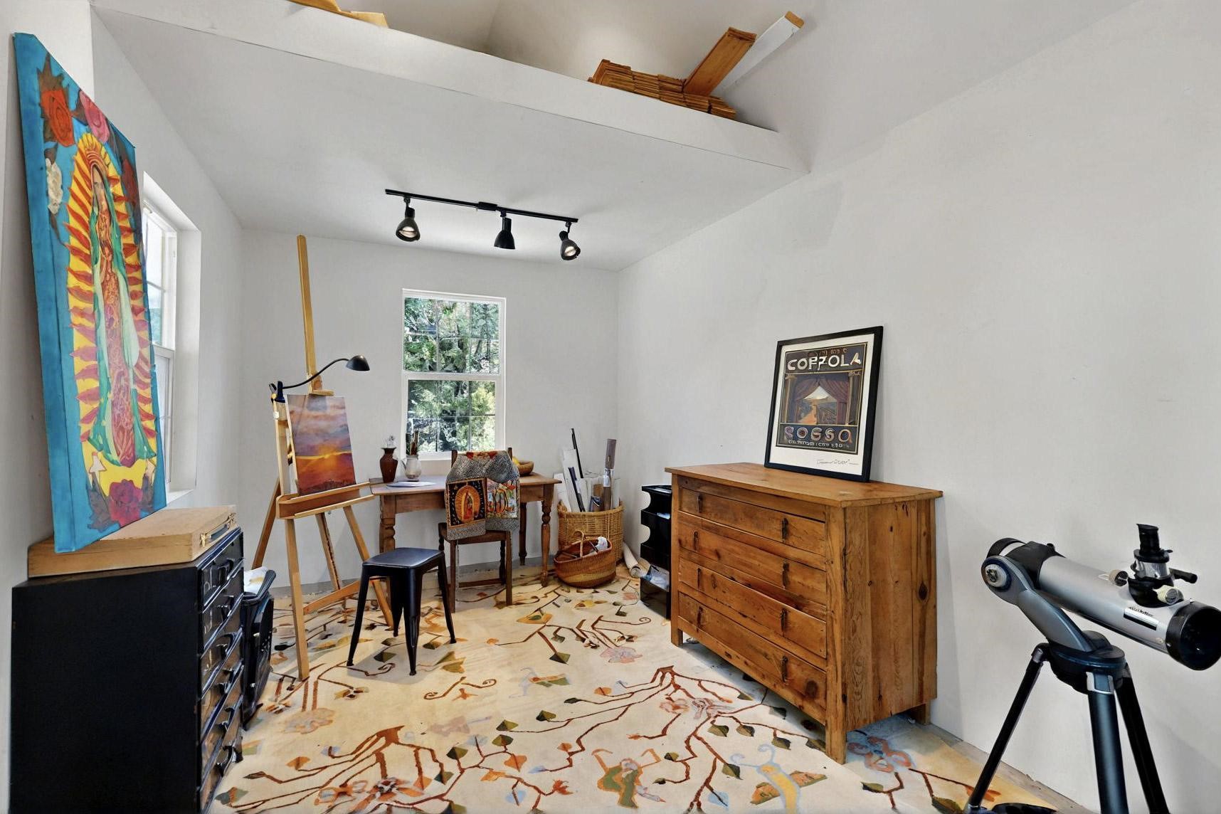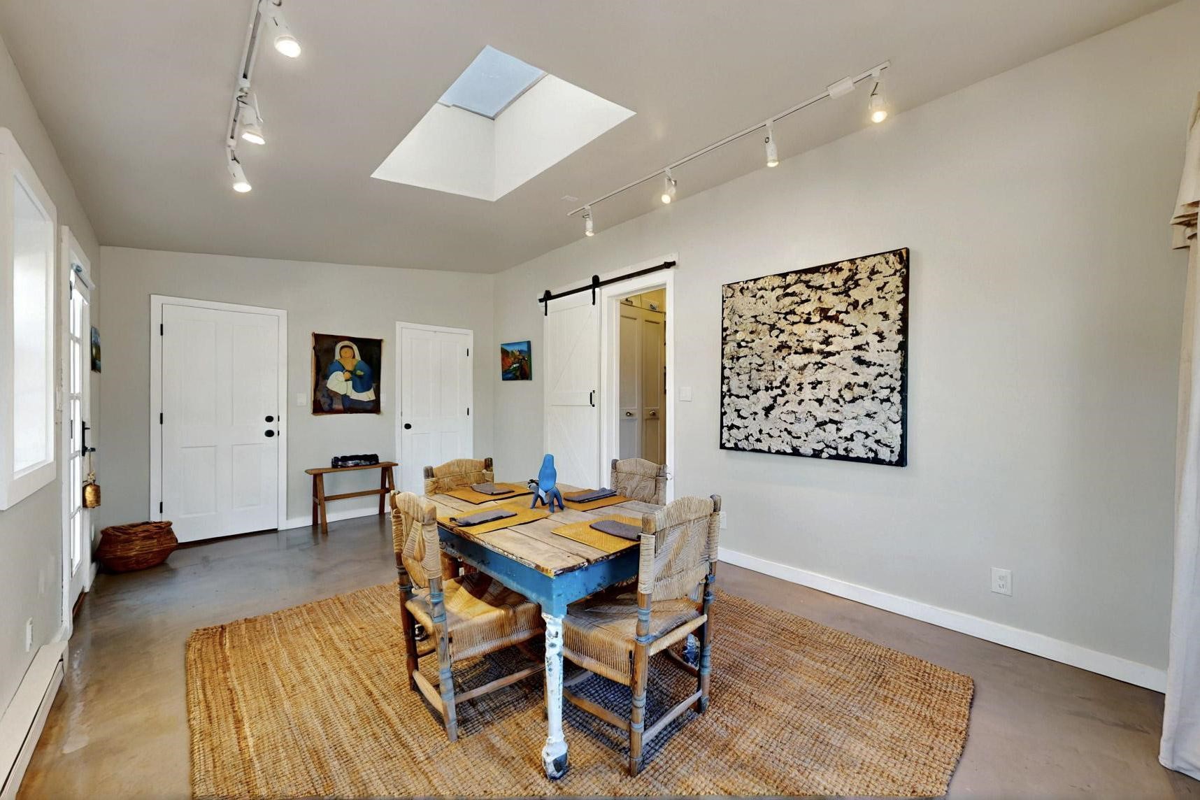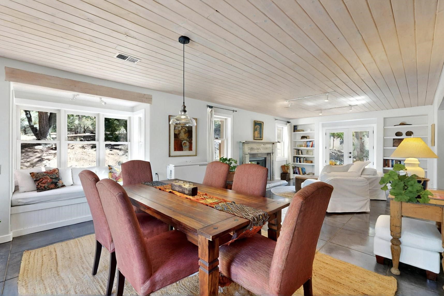 Romantic, Northern New Mexico style country compound nestled among the trees on the eastern flank of the Hondo Hills, on 7.4 acres only a few minutes drive to 3 sports clubs (including golf at Quail Run) and Santa Fe itself. With a nod to Betty Stewart, this pretty home, built by a structural engineer in 1987, has been extensively remodeled and expanded by the current architect owner to create this charming, peaceful haven. The main house construction uses Structural Insulated Panels (SIPs) making for a well insulated home, warm in winter and cool in summer. The first floor, with ample natural light from French doors and the many windows, flows serenely between the open plan kitchen/living/dining, a sunny office nook, a TV den and down the hallway to the chic primary suite with outside access to a shady brick patio. Upstairs beneath the tall pitched ceilings is a large office/occasional 3rd bedroom on one side and a large guest suite the other with a light filled sitting area between. A 10 ft wide portal spans the length of the house for outdoor enjoyment of the natural pinon woodland and views to the Jemez mountains to the NW, and north and east to the nearby foothills and rocky hilltops above the Old Santa Fe Trail. The nearby full guest house off the circular driveway, created in 2021, is a little gem entered through French doors to a delightful and cozy living room with a separate gourmet kitchen, a sunny dining room/studio (potential additional bedroom) and upstairs to the bedroom suite. This charming compound is completed by the new pitched roof studio hidden in the trees a short stroll from the main house. Gardeners will love the cottage garden in front of the main house and a fenced vegetable garden out back. Such a sweet home!