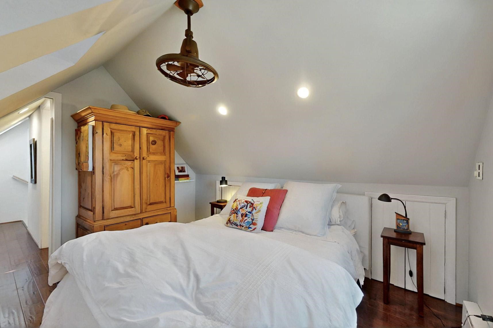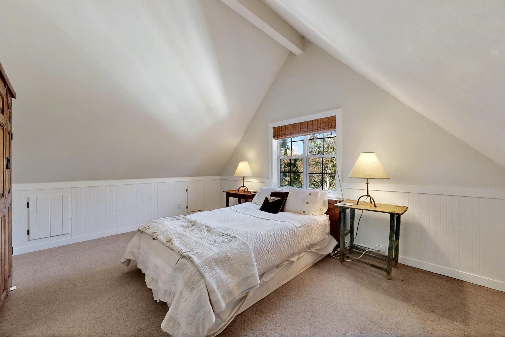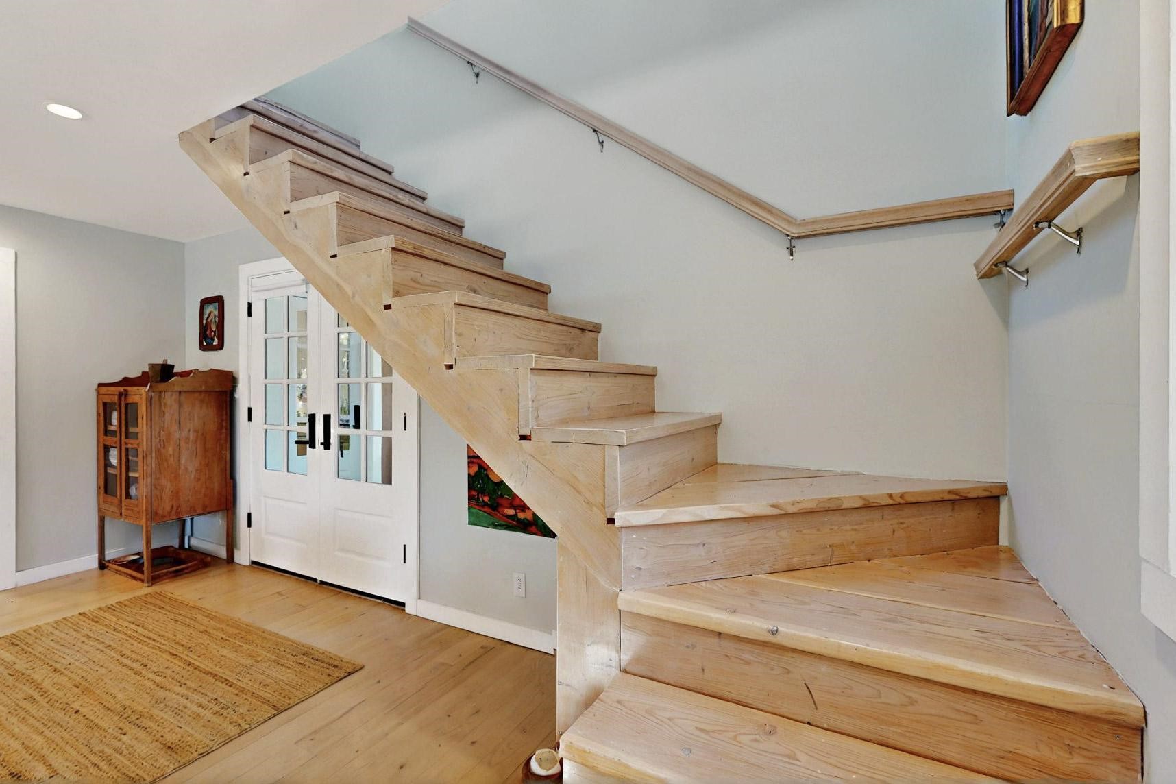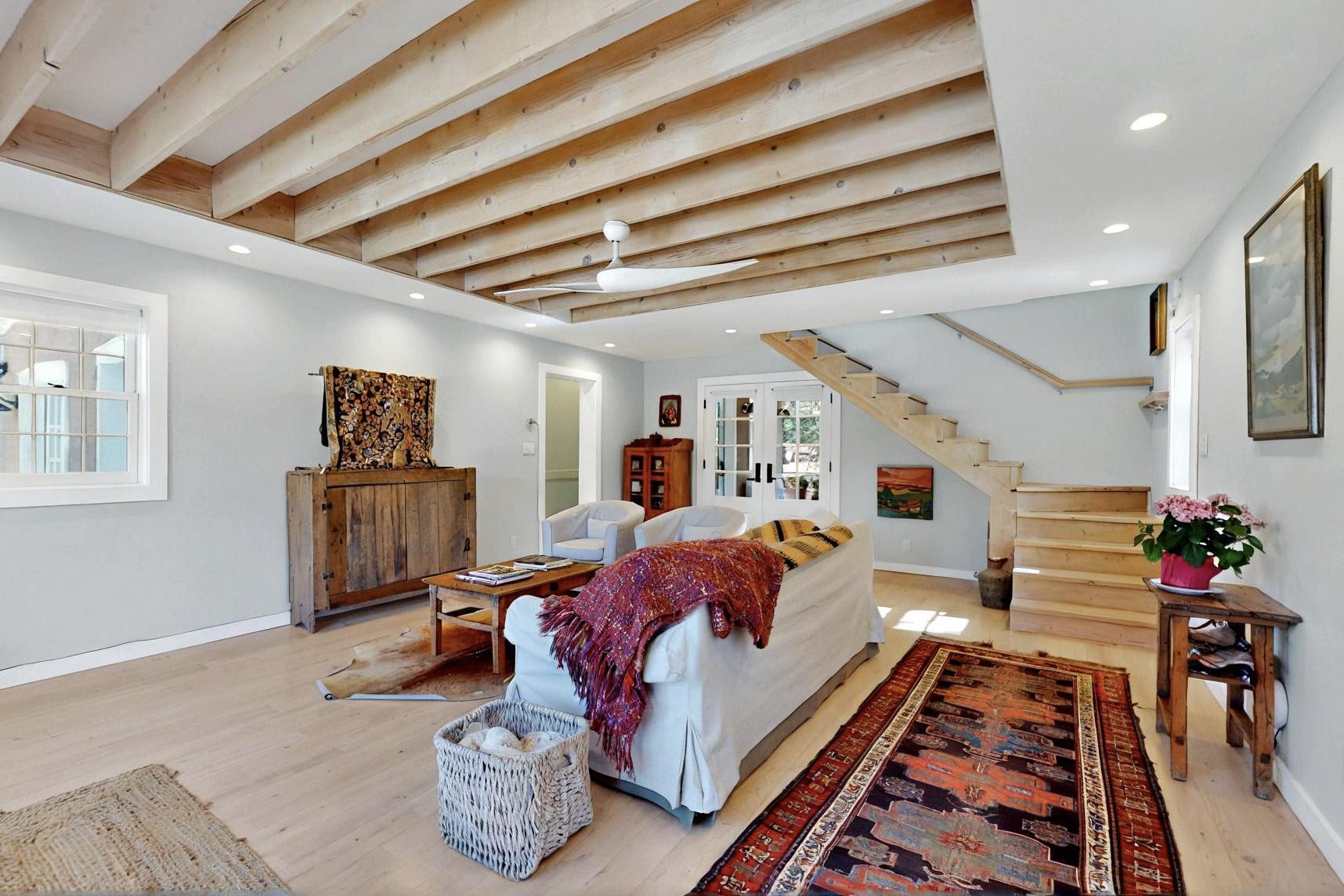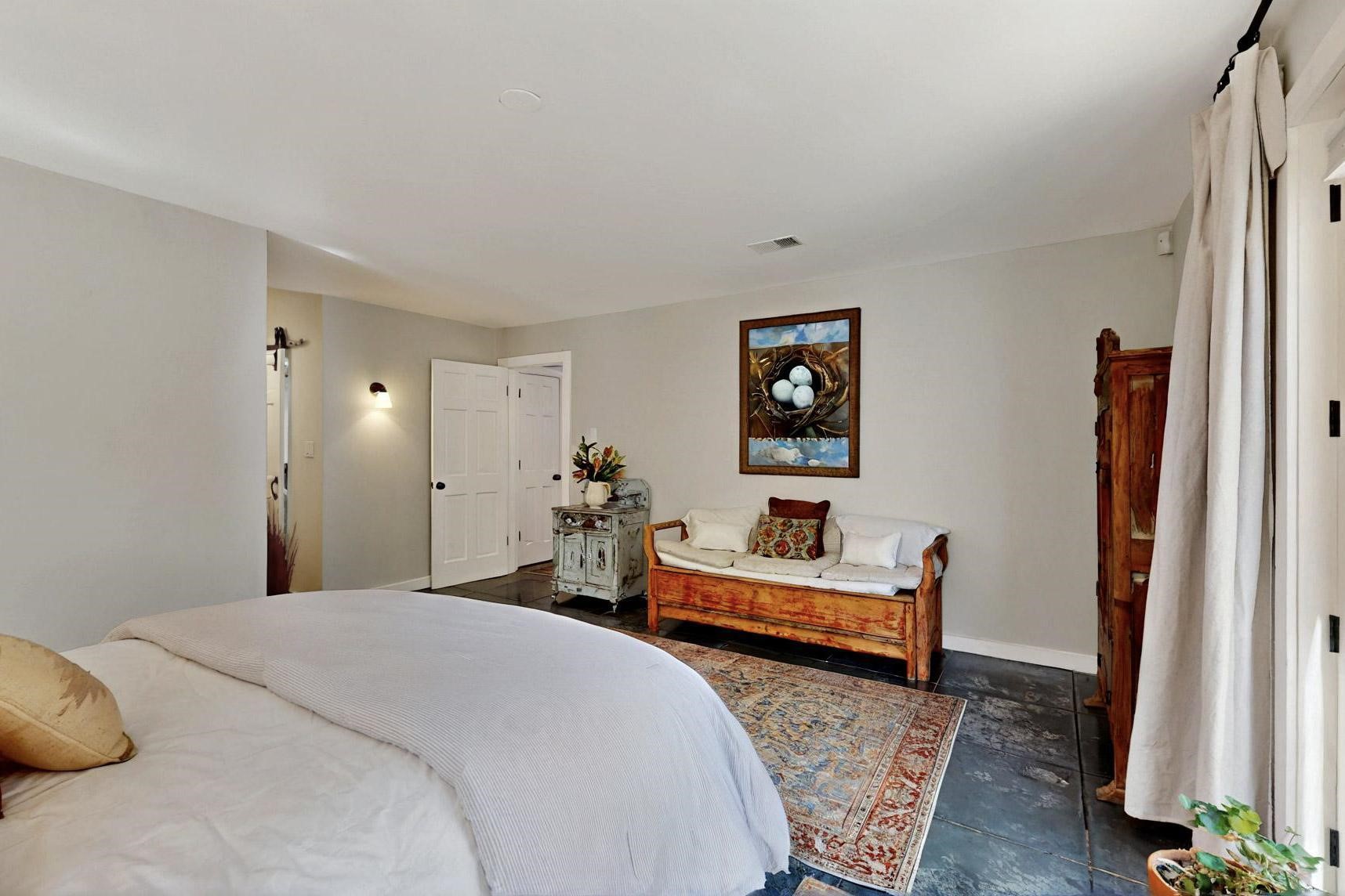 Romantic, Northern New Mexico style country compound nestled among the trees on the eastern flank of the Hondo Hills, on 7.4 acres only a few minutes drive to 3 sports clubs (including golf at Quail Run) and Santa Fe itself. With a nod to Betty Stewart, this pretty home, built by a structural engineer in 1987, has been extensively remodeled and expanded by the current architect owner to create this charming, peaceful haven. The main house construction uses Structural Insulated Panels (SIPs) making for a well insulated home, warm in winter and cool in summer. The first floor, with ample natural light from French doors and the many windows, flows serenely between the open plan kitchen/living/dining, a sunny office nook, a TV den and down the hallway to the chic primary suite with outside access to a shady brick patio. Upstairs beneath the tall pitched ceilings is a large office/occasional 3rd bedroom on one side and a large guest suite the other with a light filled sitting area between. A 10 ft wide portal spans the length of the house for outdoor enjoyment of the natural pinon woodland and views to the Jemez mountains to the NW, and north and east to the nearby foothills and rocky hilltops above the Old Santa Fe Trail. The nearby full guest house off the circular driveway, created in 2021, is a little gem entered through French doors to a delightful and cozy living room with a separate gourmet kitchen, a sunny dining room/studio (potential additional bedroom) and upstairs to the bedroom suite. This charming compound is completed by the new pitched roof studio hidden in the trees a short stroll from the main house. Gardeners will love the cottage garden in front of the main house and a fenced vegetable garden out back. Such a sweet home!