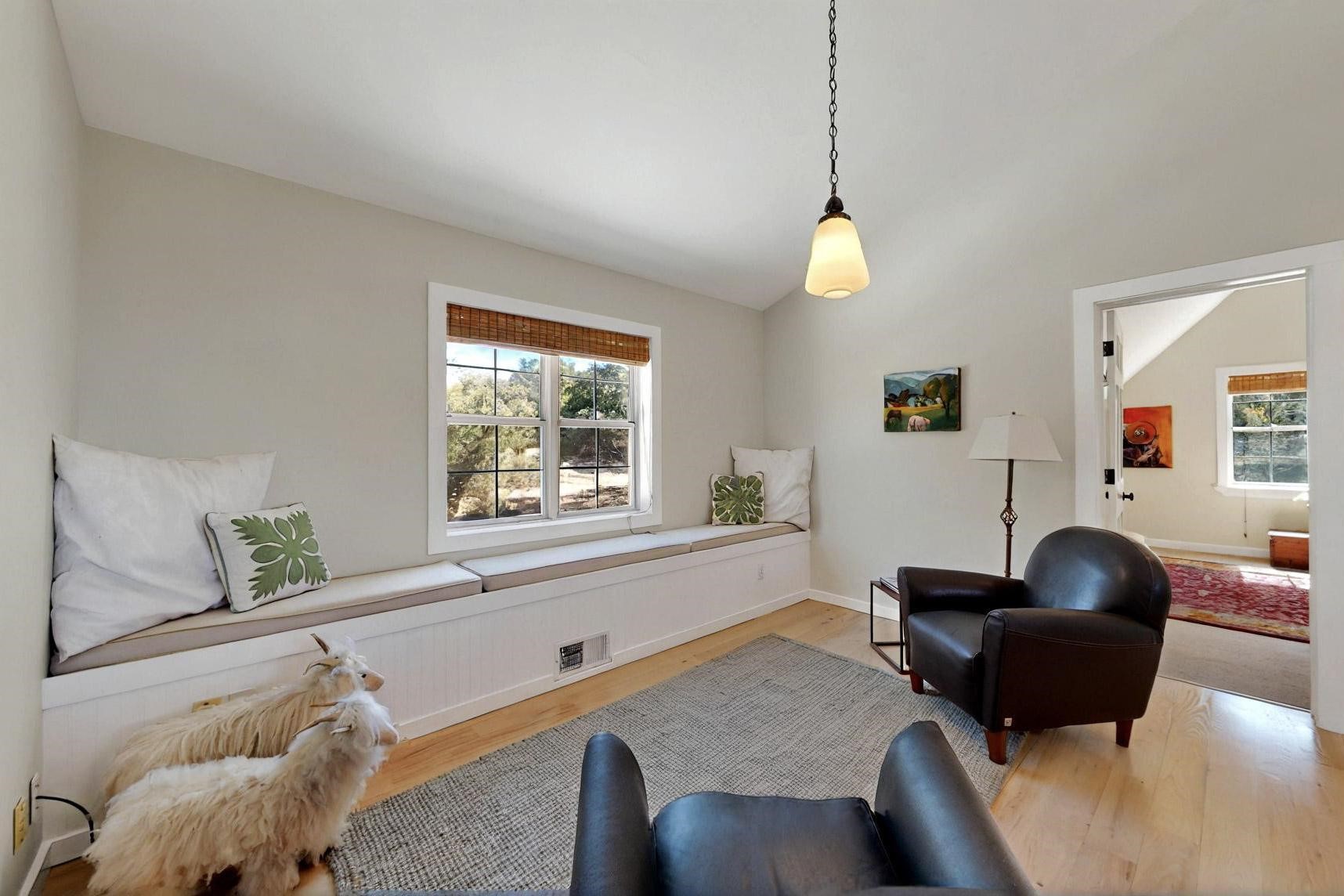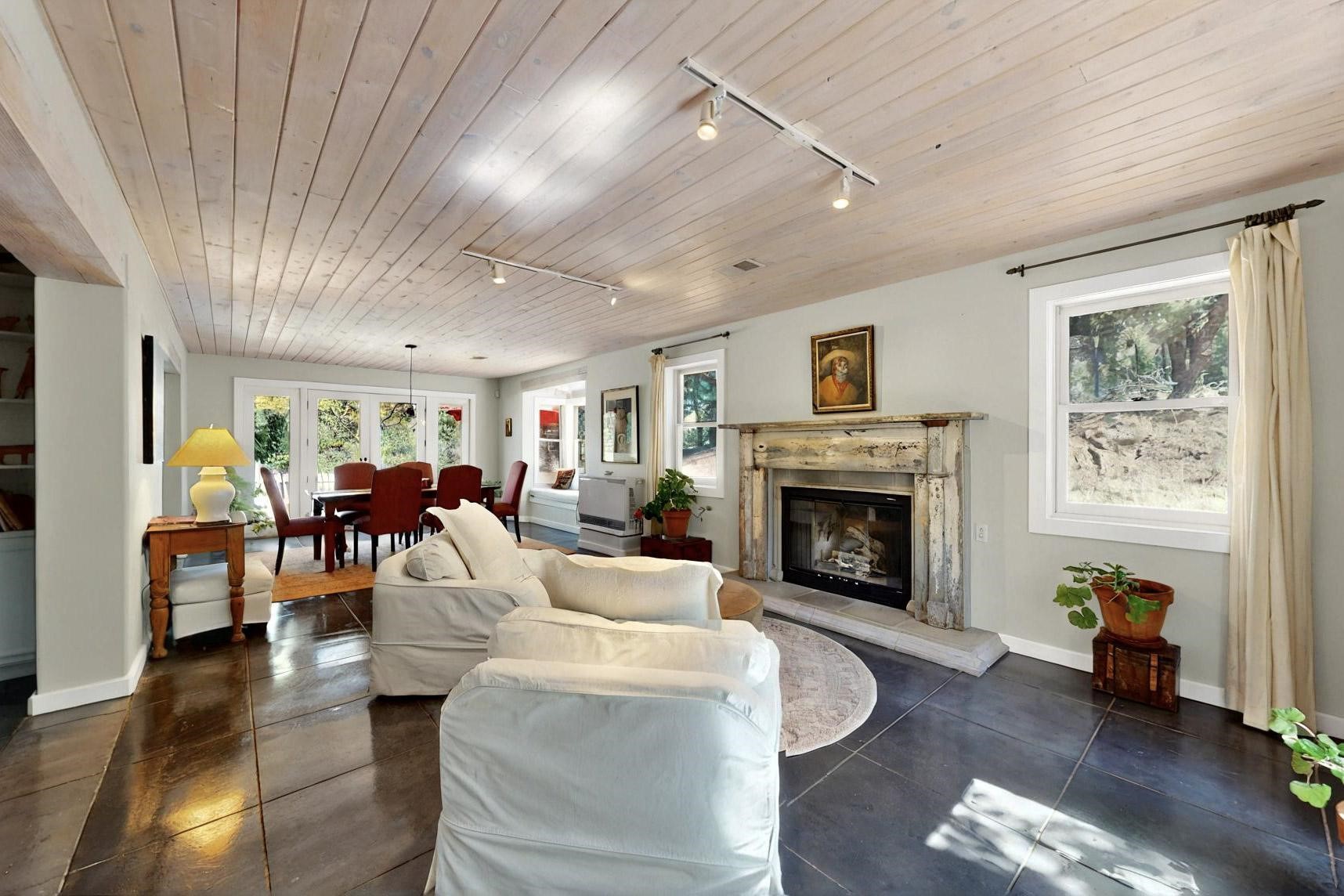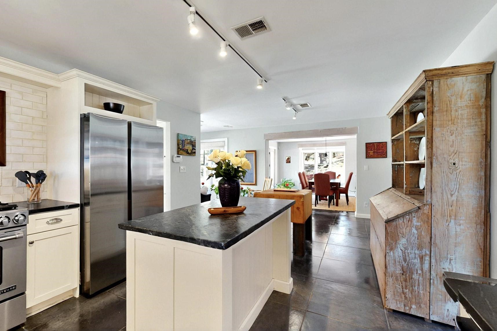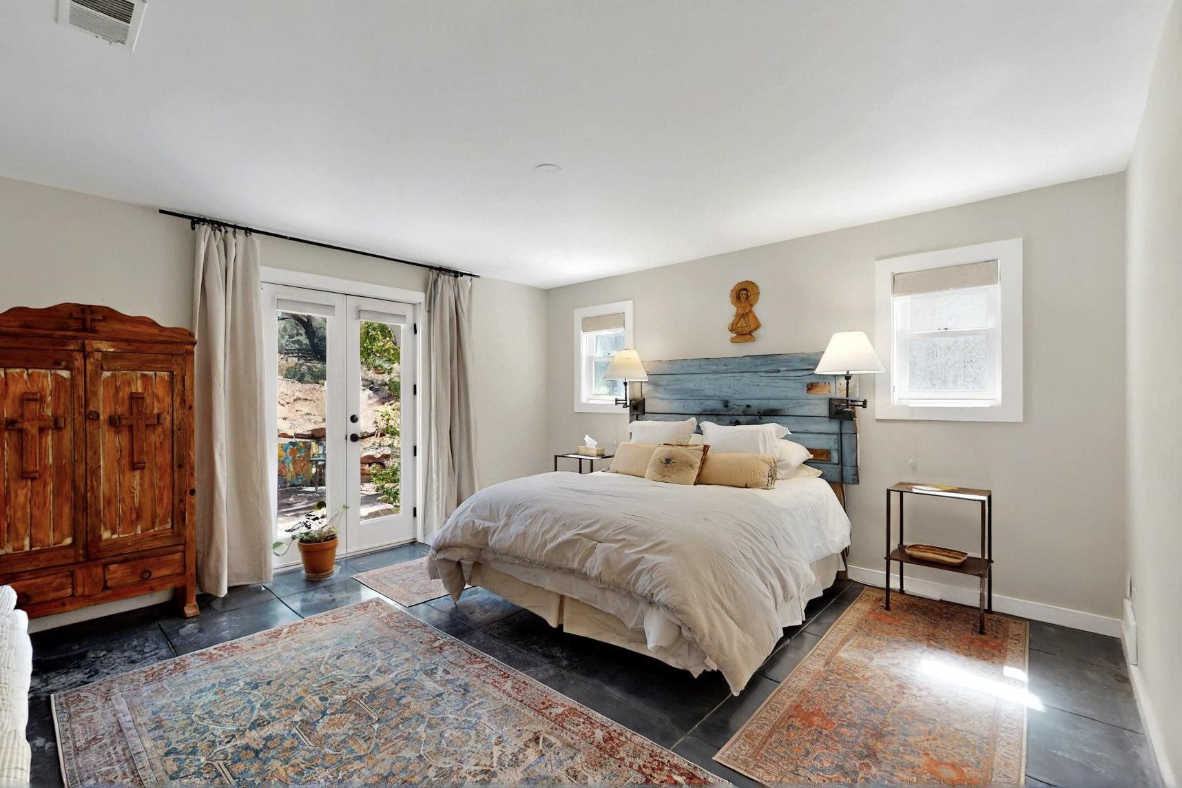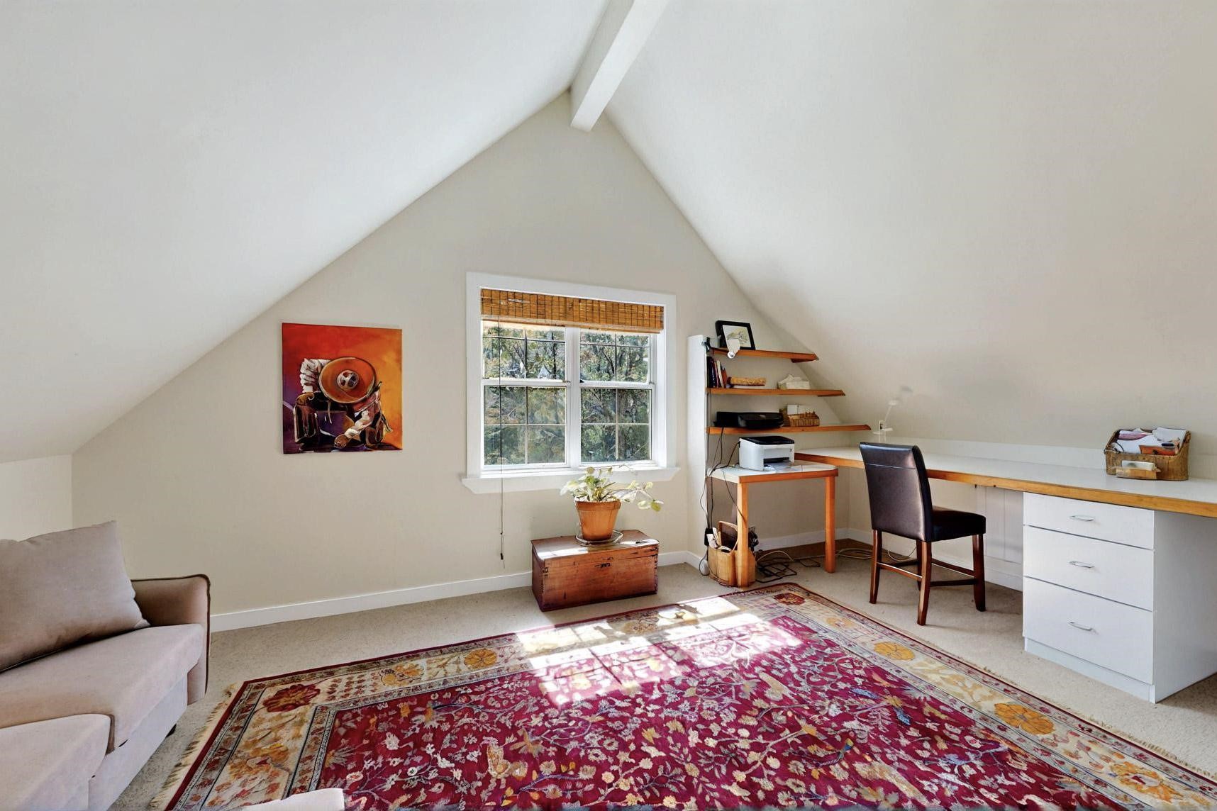 Romantic, Northern New Mexico style country compound nestled among the trees on the eastern flank of the Hondo Hills, on 7.4 acres only a few minutes drive to 3 sports clubs (including golf at Quail Run) and Santa Fe itself. With a nod to Betty Stewart, this pretty home, built by a structural engineer in 1987, has been extensively remodeled and expanded by the current architect owner to create this charming, peaceful haven. The main house construction uses Structural Insulated Panels (SIPs) making for a well insulated home, warm in winter and cool in summer. The first floor, with ample natural light from French doors and the many windows, flows serenely between the open plan kitchen/living/dining, a sunny office nook, a TV den and down the hallway to the chic primary suite with outside access to a shady brick patio. Upstairs beneath the tall pitched ceilings is a large office/occasional 3rd bedroom on one side and a large guest suite the other with a light filled sitting area between. A 10 ft wide portal spans the length of the house for outdoor enjoyment of the natural pinon woodland and views to the Jemez mountains to the NW, and north and east to the nearby foothills and rocky hilltops above the Old Santa Fe Trail. The nearby full guest house off the circular driveway, created in 2021, is a little gem entered through French doors to a delightful and cozy living room with a separate gourmet kitchen, a sunny dining room/studio (potential additional bedroom) and upstairs to the bedroom suite. This charming compound is completed by the new pitched roof studio hidden in the trees a short stroll from the main house. Gardeners will love the cottage garden in front of the main house and a fenced vegetable garden out back. Such a sweet home!