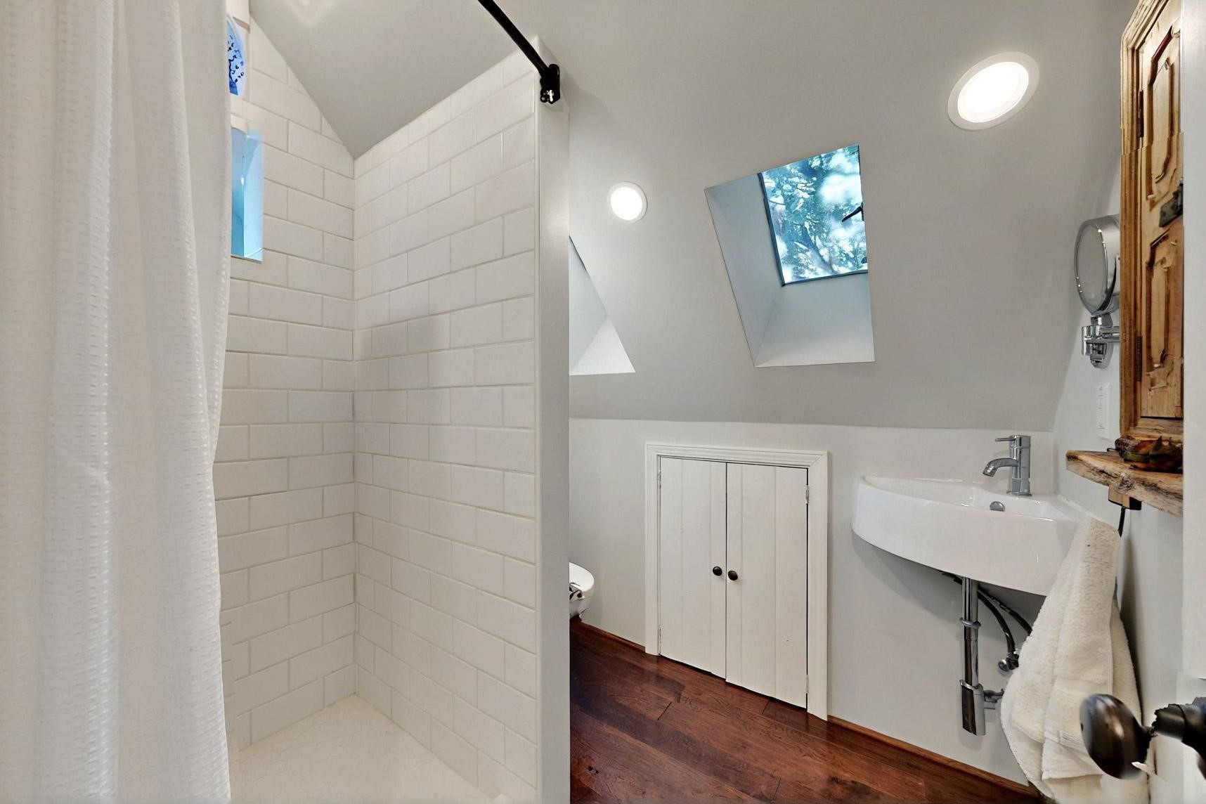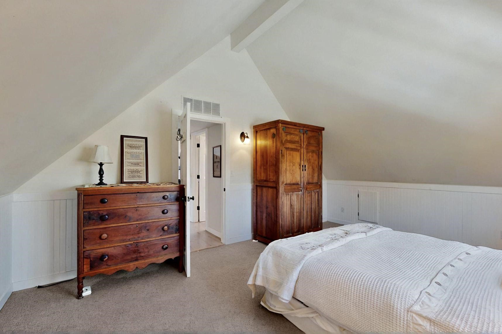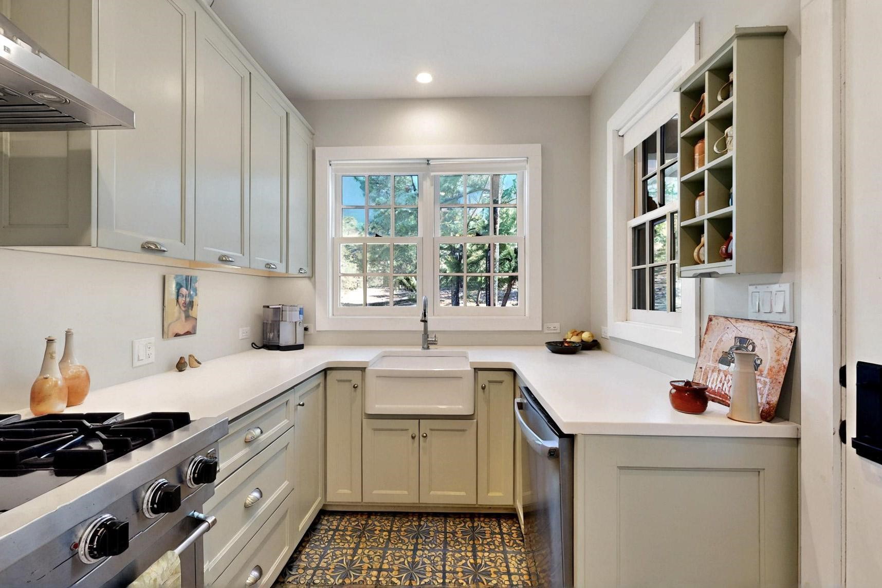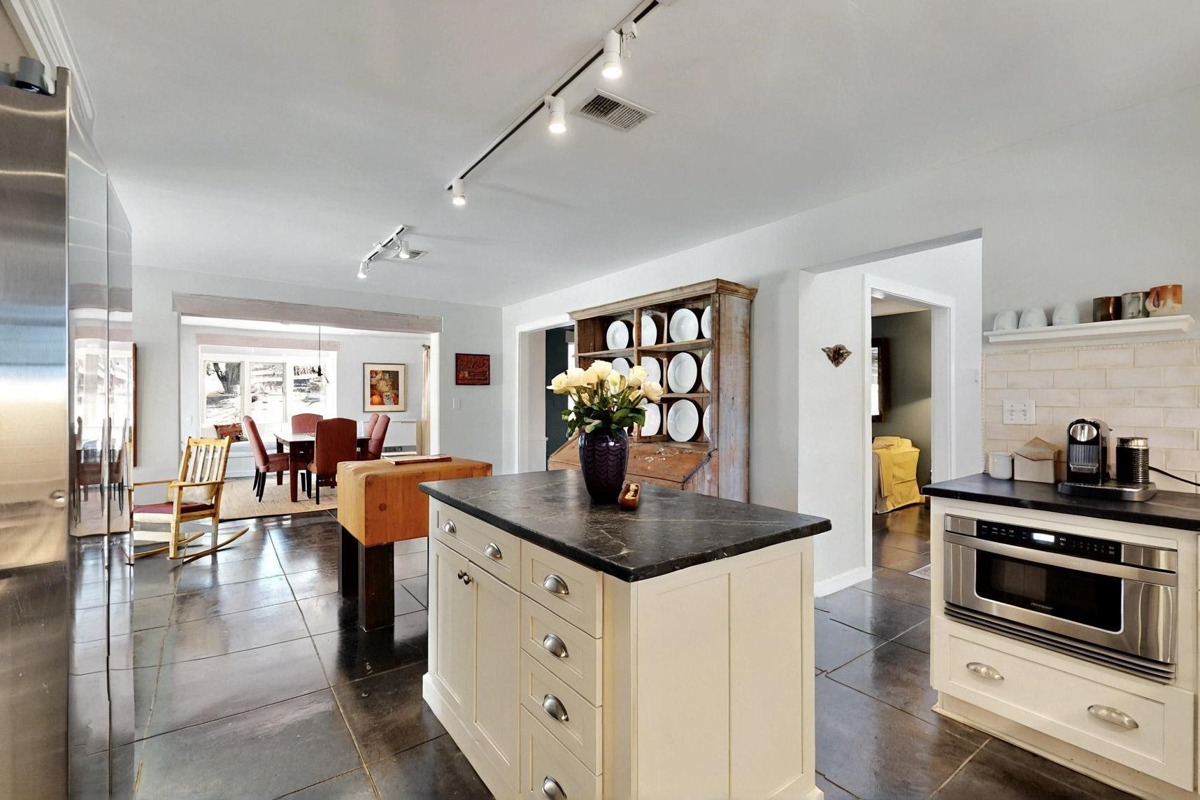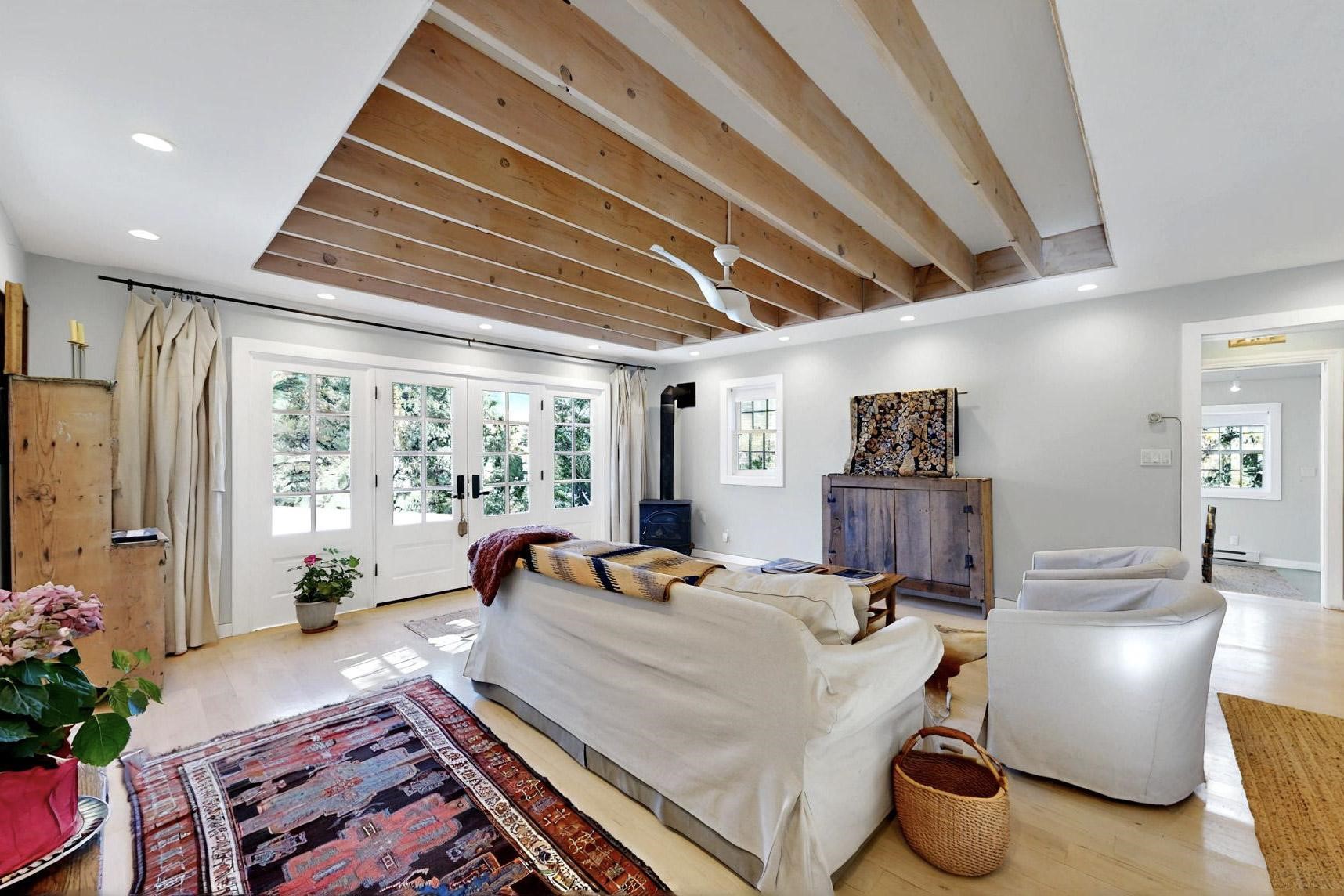 Romantic, Northern New Mexico style country compound nestled among the trees on the eastern flank of the Hondo Hills, on 7.4 acres only a few minutes drive to 3 sports clubs (including golf at Quail Run) and Santa Fe itself. With a nod to Betty Stewart, this pretty home, built by a structural engineer in 1987, has been extensively remodeled and expanded by the current architect owner to create this charming, peaceful haven. The main house construction uses Structural Insulated Panels (SIPs) making for a well insulated home, warm in winter and cool in summer. The first floor, with ample natural light from French doors and the many windows, flows serenely between the open plan kitchen/living/dining, a sunny office nook, a TV den and down the hallway to the chic primary suite with outside access to a shady brick patio. Upstairs beneath the tall pitched ceilings is a large office/occasional 3rd bedroom on one side and a large guest suite the other with a light filled sitting area between. A 10 ft wide portal spans the length of the house for outdoor enjoyment of the natural pinon woodland and views to the Jemez mountains to the NW, and north and east to the nearby foothills and rocky hilltops above the Old Santa Fe Trail. The nearby full guest house off the circular driveway, created in 2021, is a little gem entered through French doors to a delightful and cozy living room with a separate gourmet kitchen, a sunny dining room/studio (potential additional bedroom) and upstairs to the bedroom suite. This charming compound is completed by the new pitched roof studio hidden in the trees a short stroll from the main house. Gardeners will love the cottage garden in front of the main house and a fenced vegetable garden out back. Such a sweet home!