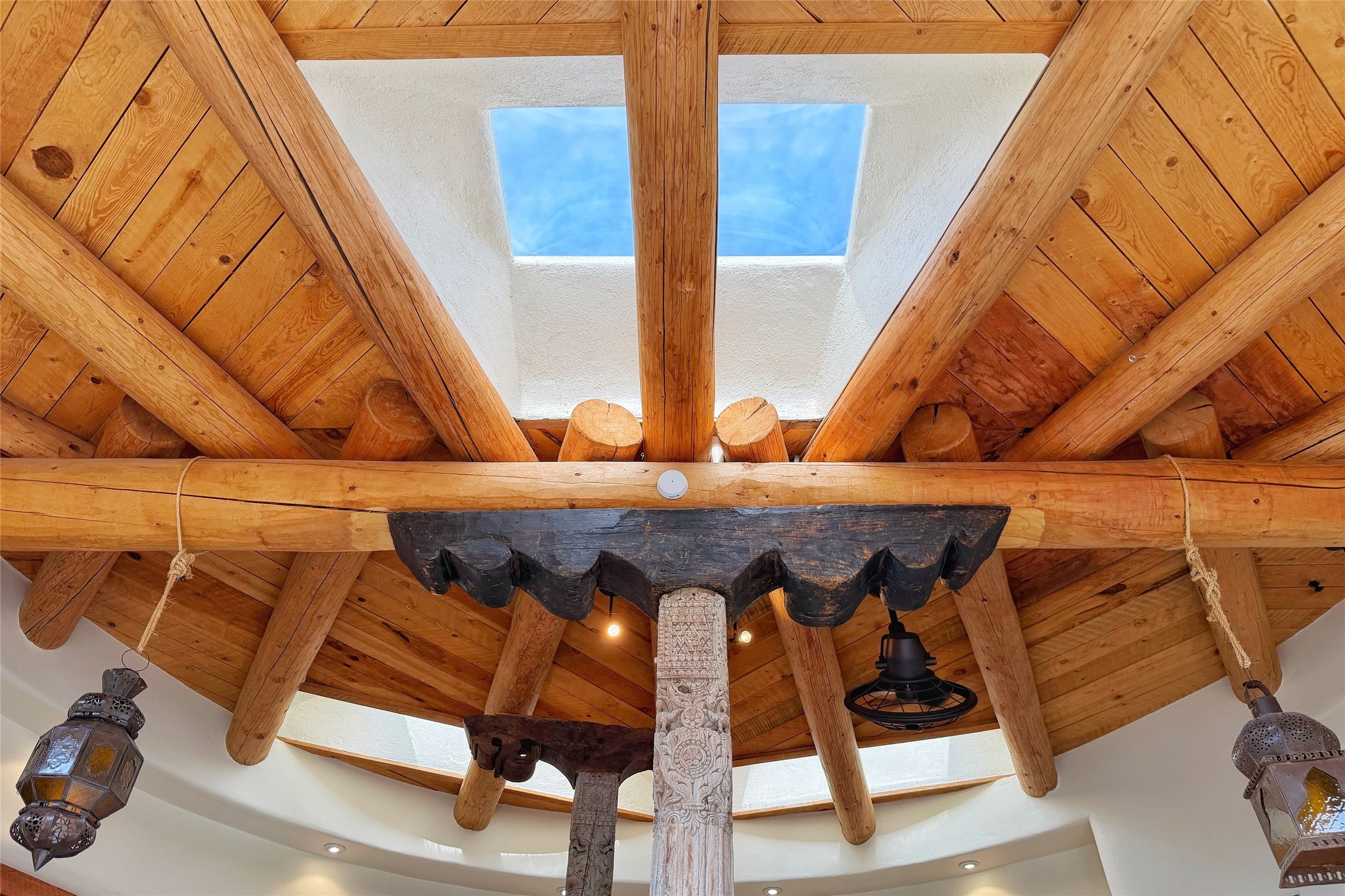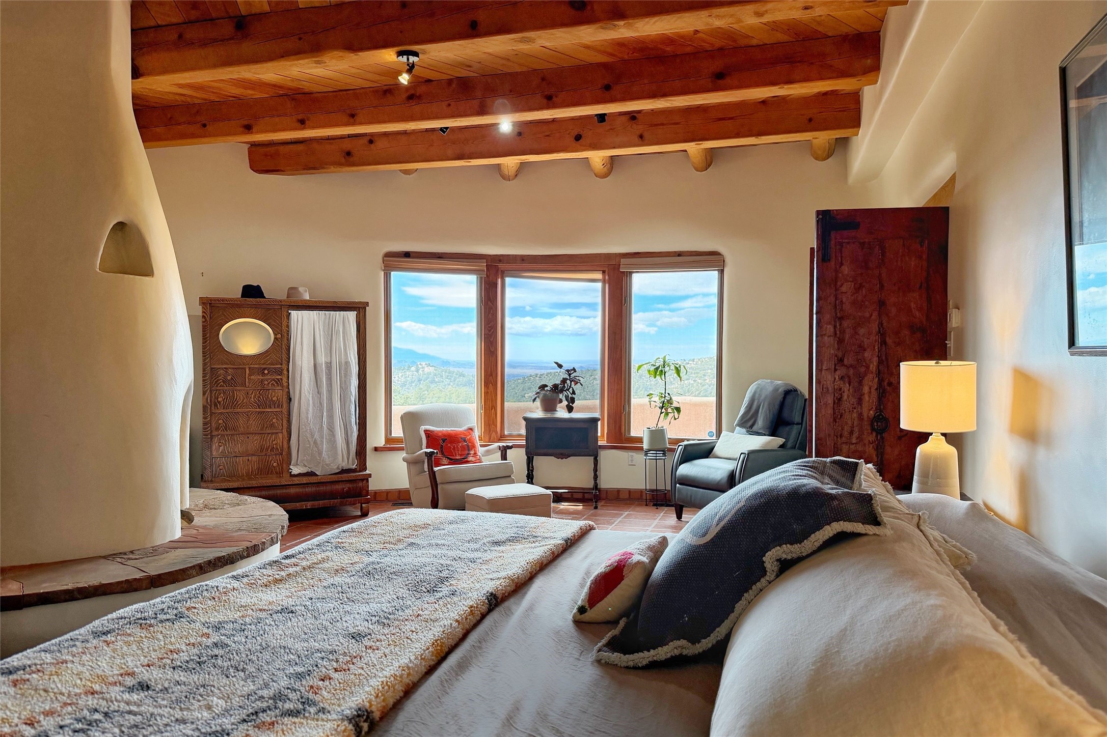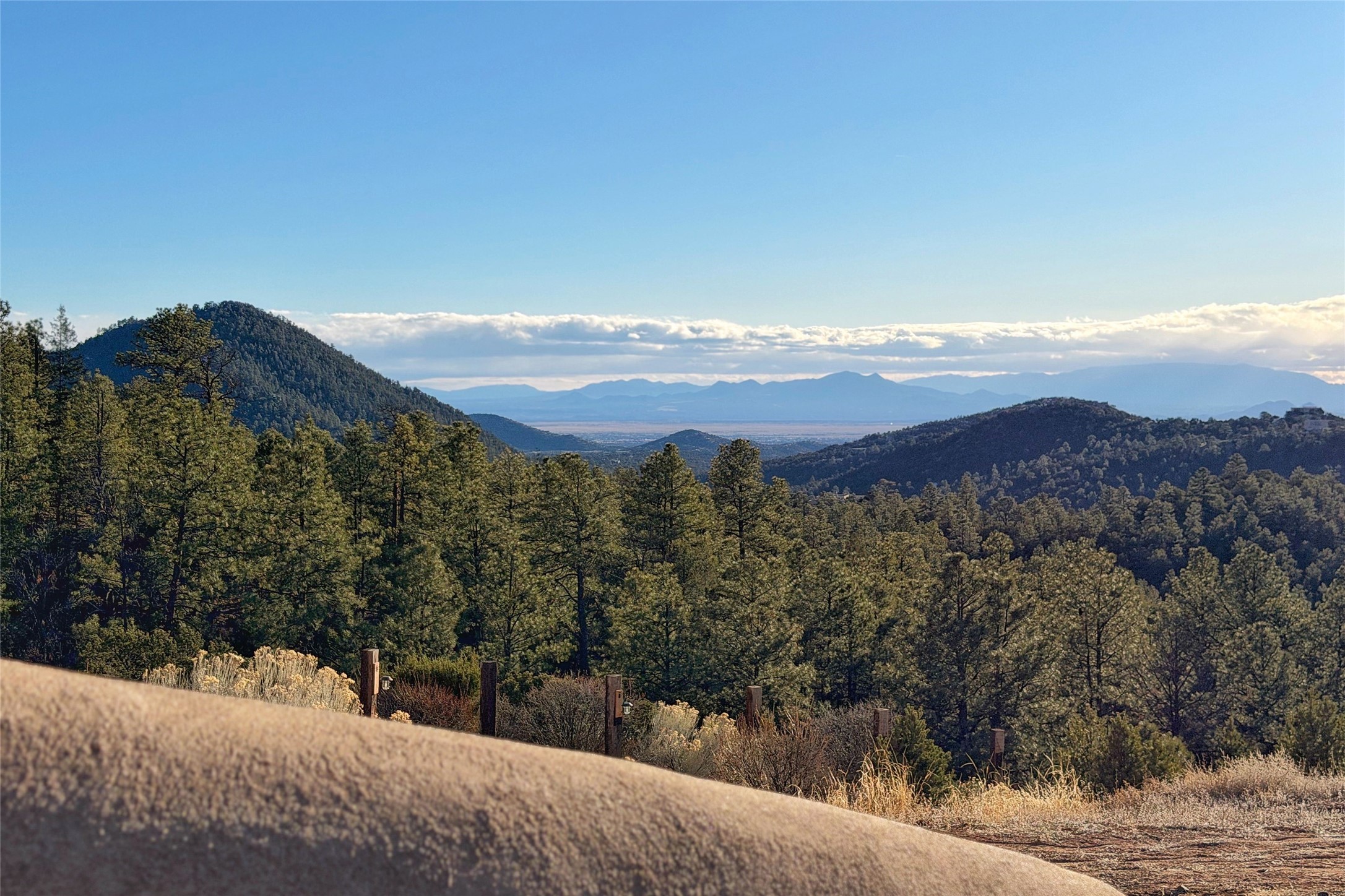 Sited atop a serene, tree-covered hillside, this one-of-kind mountain retreat offers an extraordinary blend of artistry, architecture, and natural beauty. Set on four expansive lots totaling approximately 78.38 acres, the property provides unmatched privacy, tranquility, and breathtaking views from every room.Crafted with timeless adobe construction, the home showcases stunning architectural details throughout, including exquisite hand-carved doors that reflect true craftsmanship and character. Each of the four spacious bedrooms features its own en-suite bathroom, creating a private retreat for residents and guests alike.Surrounded by unspoiled nature, this remarkable property is a haven for outdoor enthusiasts and creatives. Explore endless opportunities for hiking, wildlife watching, and peaceful reflection right outside your door. Evenings bring unforgettable sunsets and some of the brightest star-filled skies imaginable, offering a daily connection to the beauty of the natural world.Enjoy sweeping views of the Sangre de Cristo Mountains while still being conveniently located minutes from shopping/restaurants and just 16 minutes from the Santa Fe Plaza. Whether you're seeking seclusion, inspiration, or a luxurious escape, this exceptional property delivers a rare opportunity to own a true sanctuary in the high desert.