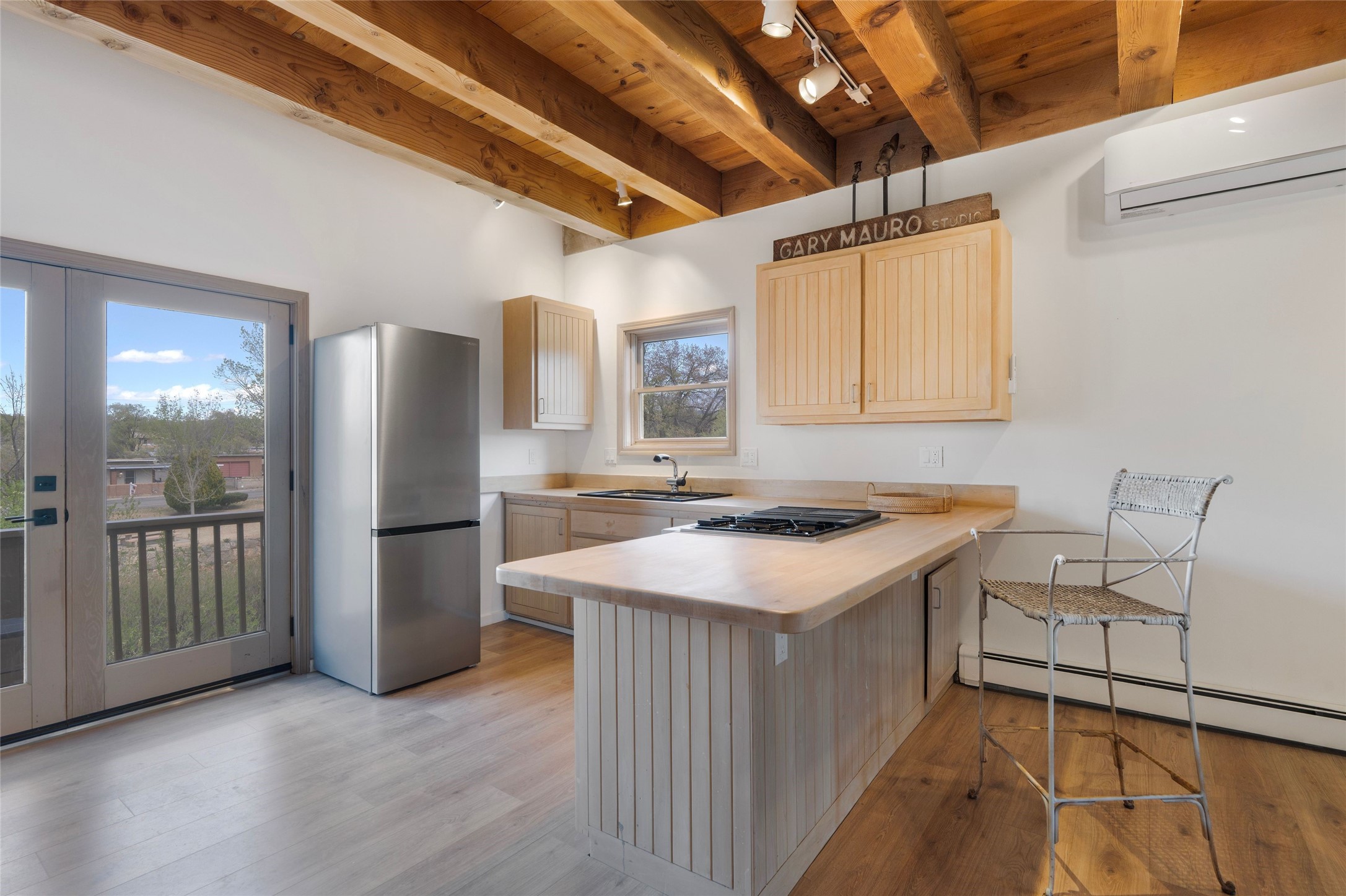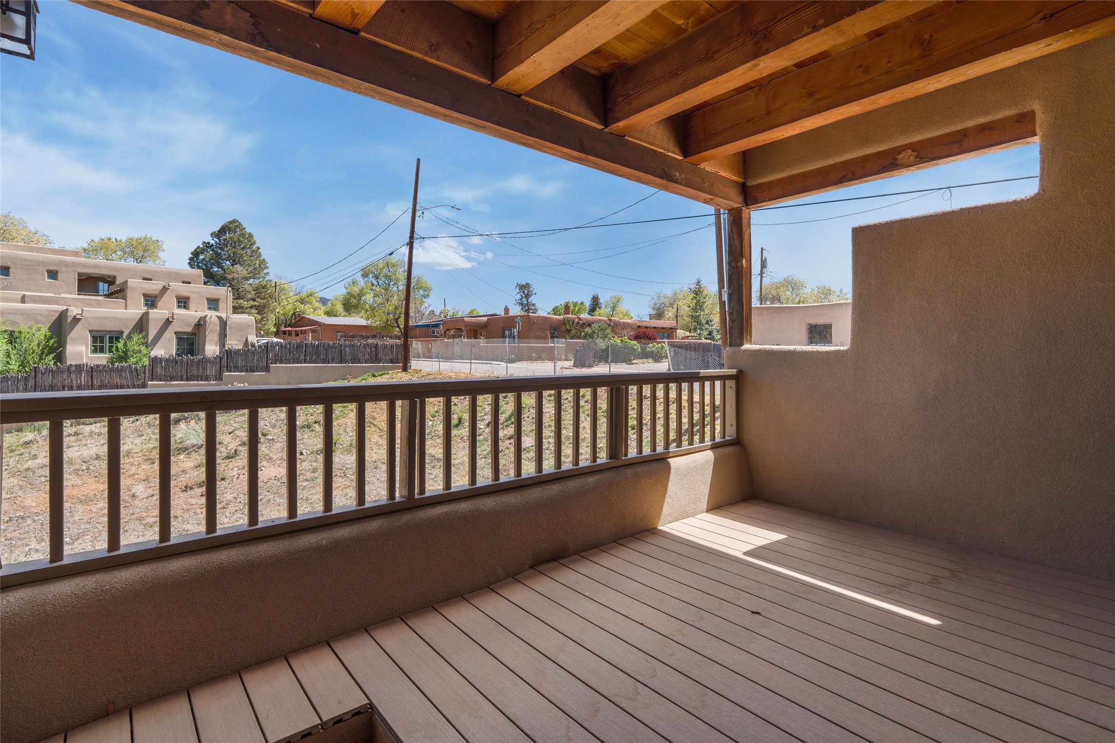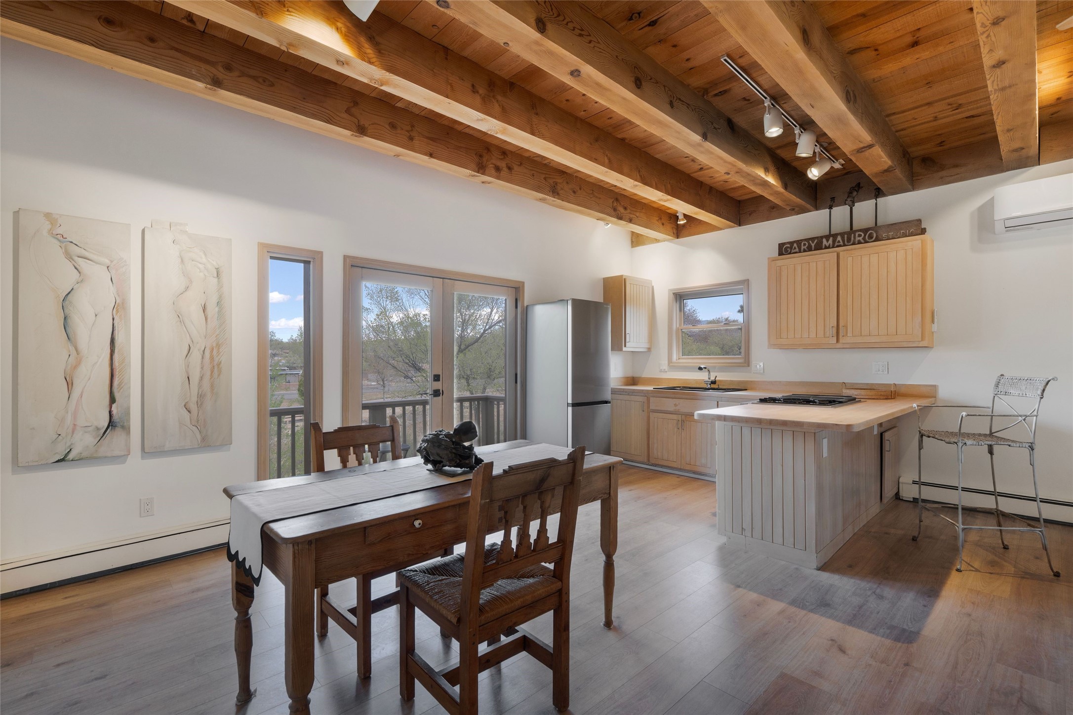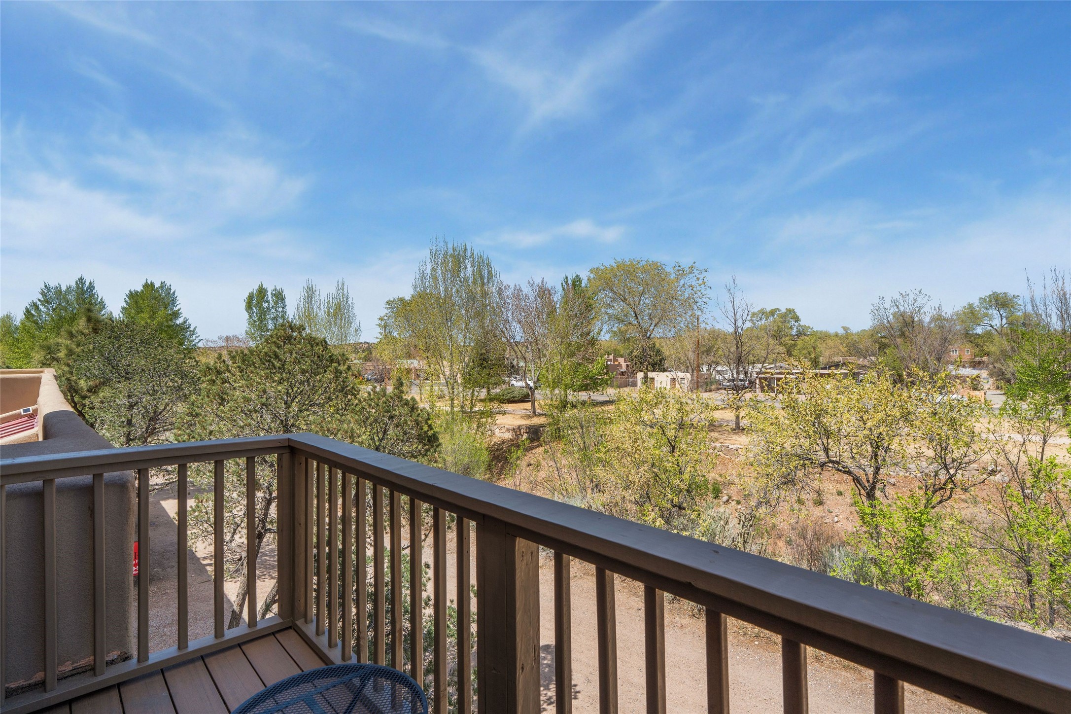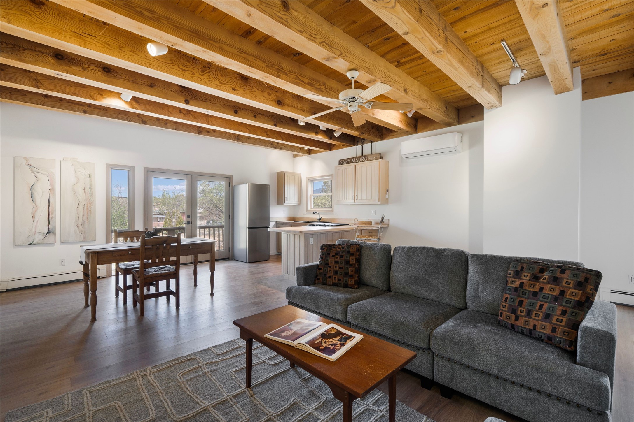 Guadalupe District Renovated (2024) Live/Work 2-bedroom, 2-bath condo in a prime location along the Santa Fe River and the River Trail System. Property is within a gated enclave of only 4 units. This flexible plan condo provides ample space for an artist to live and create. Tile and wood floors and vigas and beams. The main 944 sq ft living area, located upstairs, features a spacious open-concept living, dining, and kitchen space, seamlessly connected to a private balcony and a full bathroom. The first level 1082 sq ft suite includes a generous living area with kitchenette, gas fireplace and a bathroom with a classic claw foot tub. One reserved parking inside the remote-operated gate. Located just a short distance from the lively Railyard District, the Plaza, and many of Santa Fe's best galleries, dining, shopping, and cultural attractions.
